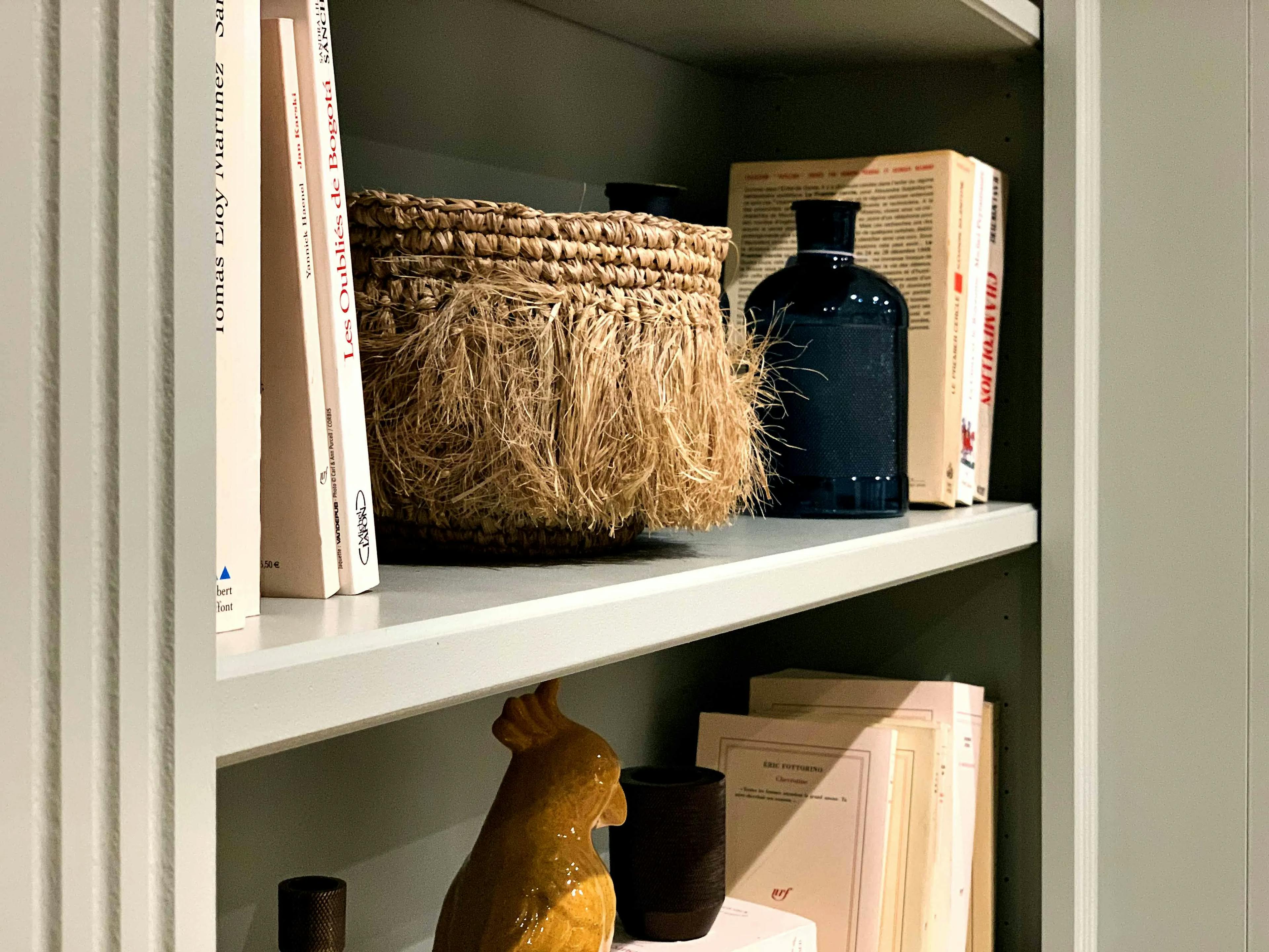 Cette bibliothèque est fabriquée intégralement en médium brut. Elle à été préparée et peinte après la pose de l'aménagement, par un peintre artisan. Il s'agit de la couleur Celadon, dans le nuancier Argile Peintures.