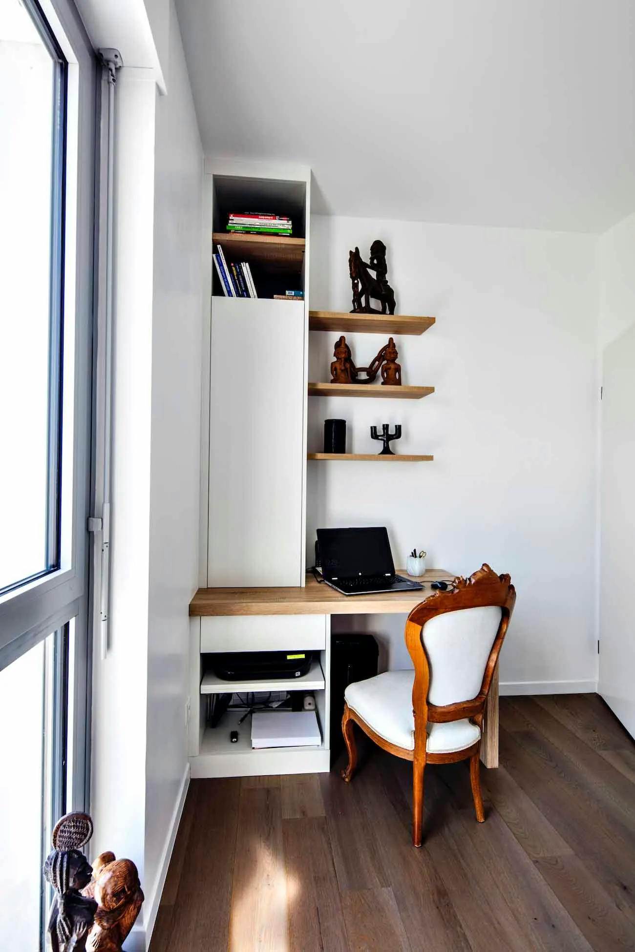 La contrainte principale était d'exploiter un coin disponible sans encombrer la pièce, nécessitant ainsi une solution sur mesure pour assurer à la fois ergonomie et esthétisme. Un bureau compact en bois clair avec des rangements intégrés sous le plateau et un meuble colonne vertical maximise l'organisation sans alourdir l'ensemble. Des étagères murales ouvertes permettent d'exposer des objets décoratifs tout en préservant une sensation d'espace. L'association du blanc et du bois naturel crée un contraste équilibré, apportant chaleur et sobriété à l’ensemble.