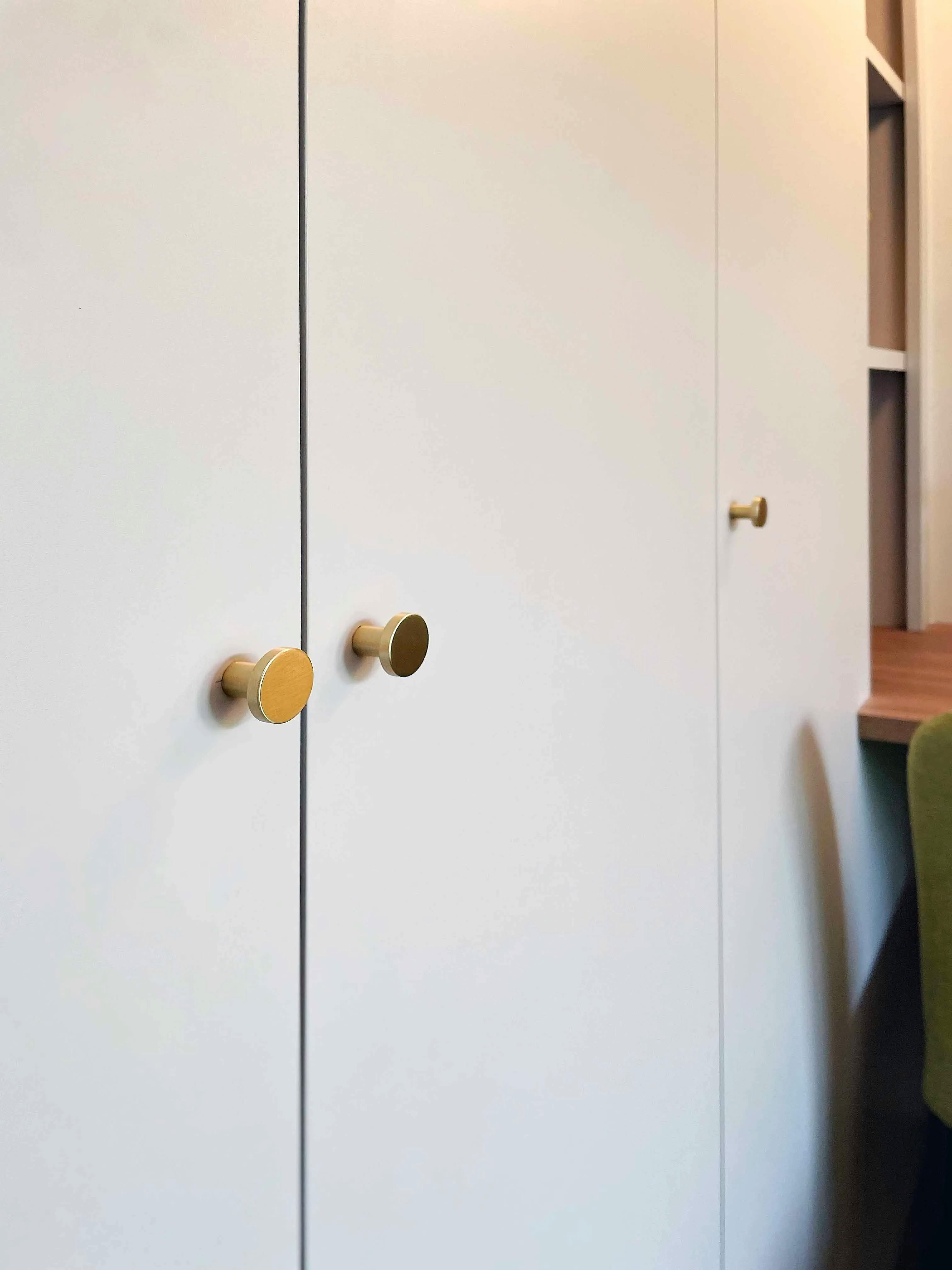 L’enjeu était de tirer parti des murs disponibles tout en maintenant une circulation fluide et un environnement apaisant. Le sur-mesure s’imposait pour adapter parfaitement chaque élément aux dimensions de la pièce et offrir un rangement discret mais efficace. L’installation comprend une bibliothèque avec arches pour exposer des objets, un placard bas fermé pour maximiser le rangement optimisé, ainsi qu’un petit bureau intégré pour un coin de travail pratique. Pour créer une harmonie, nous avons également ajouté un caisson suspendu avec tasseaux et surépaisseur sur les portes pour ajouter également du rangement. La combinaison du beige clair et du bois naturel apporte une ambiance douce et chaleureuse, complétée par des accessoires décoratifs qui mettent en valeur le mobilier.