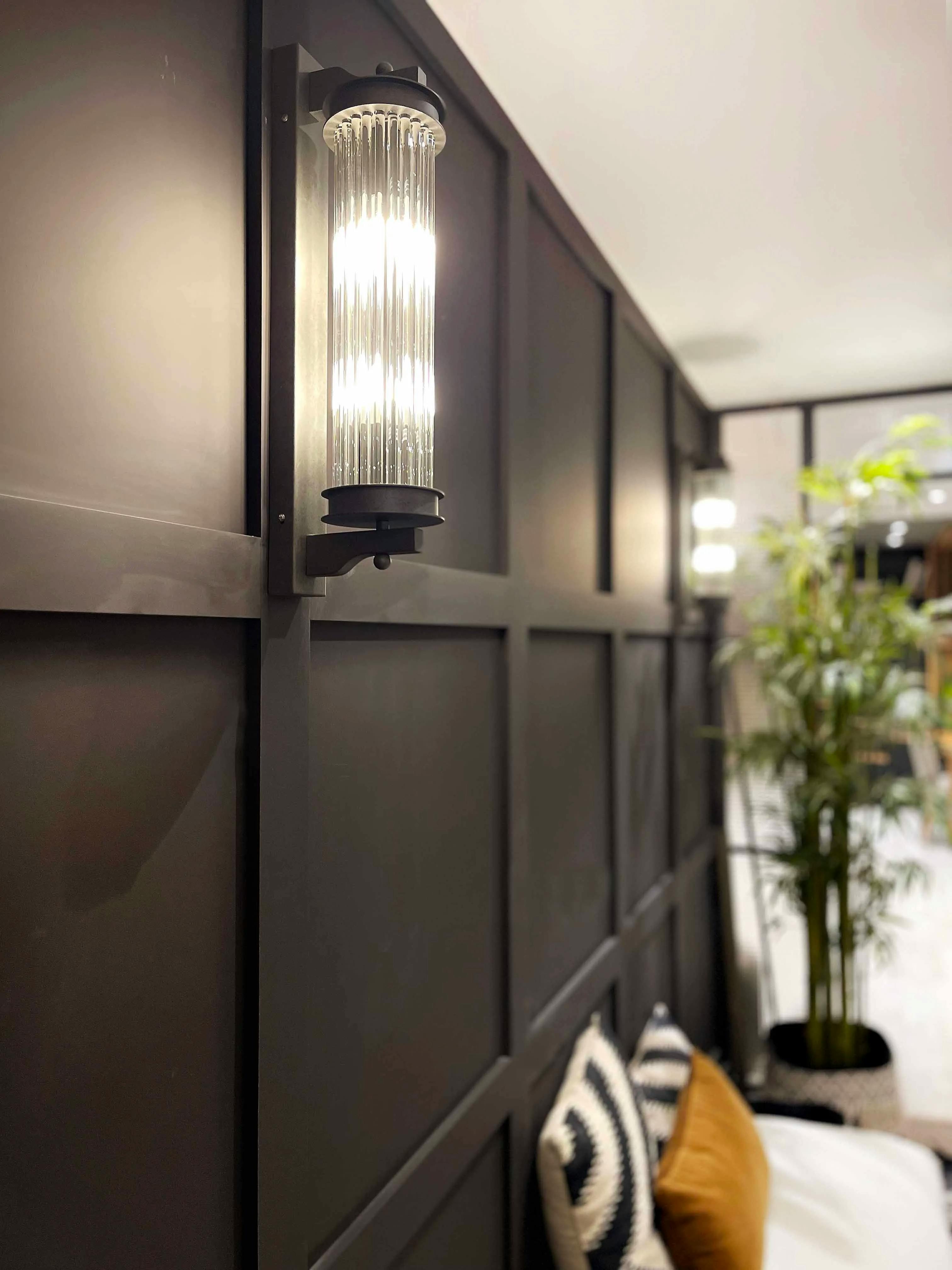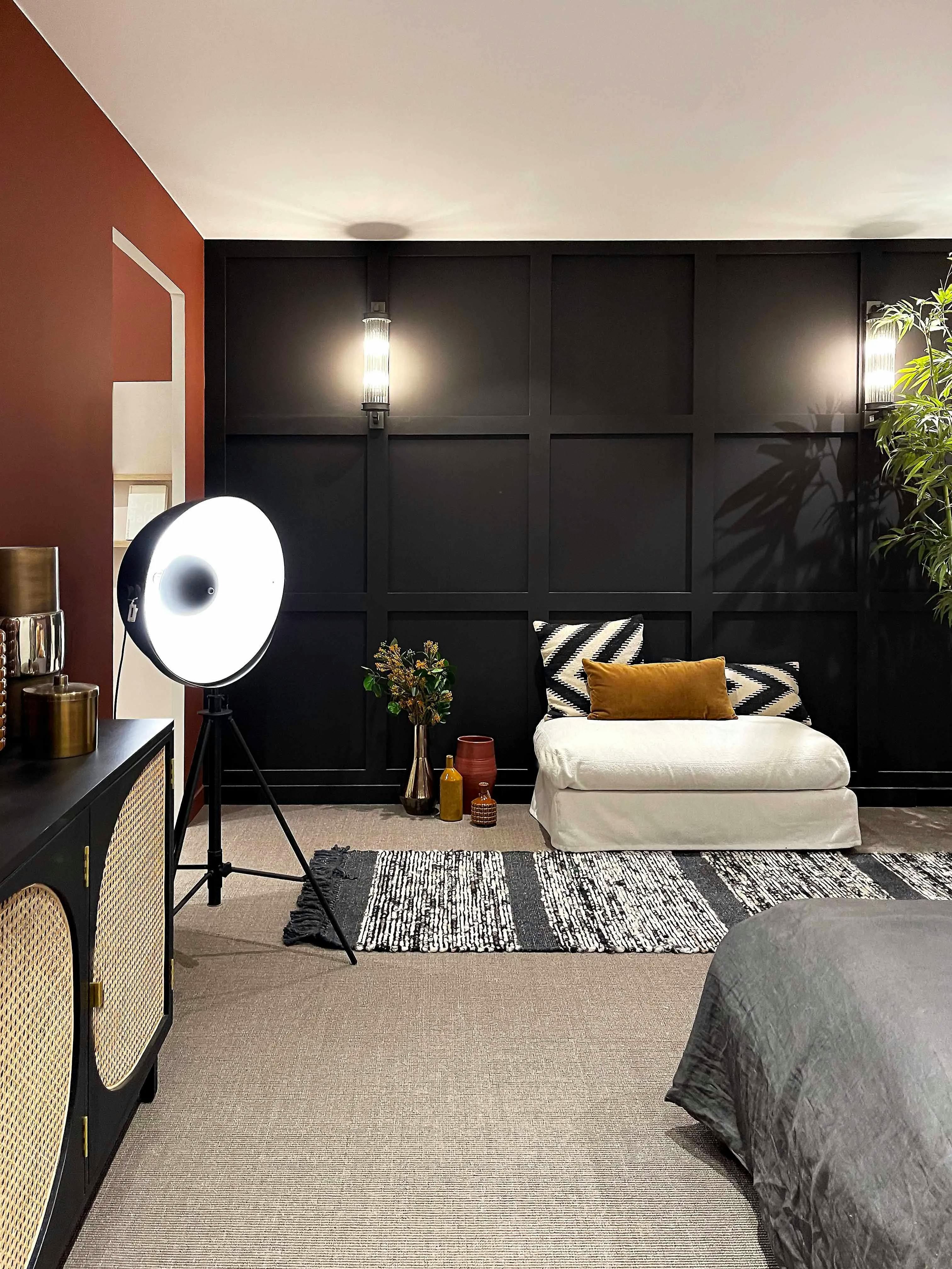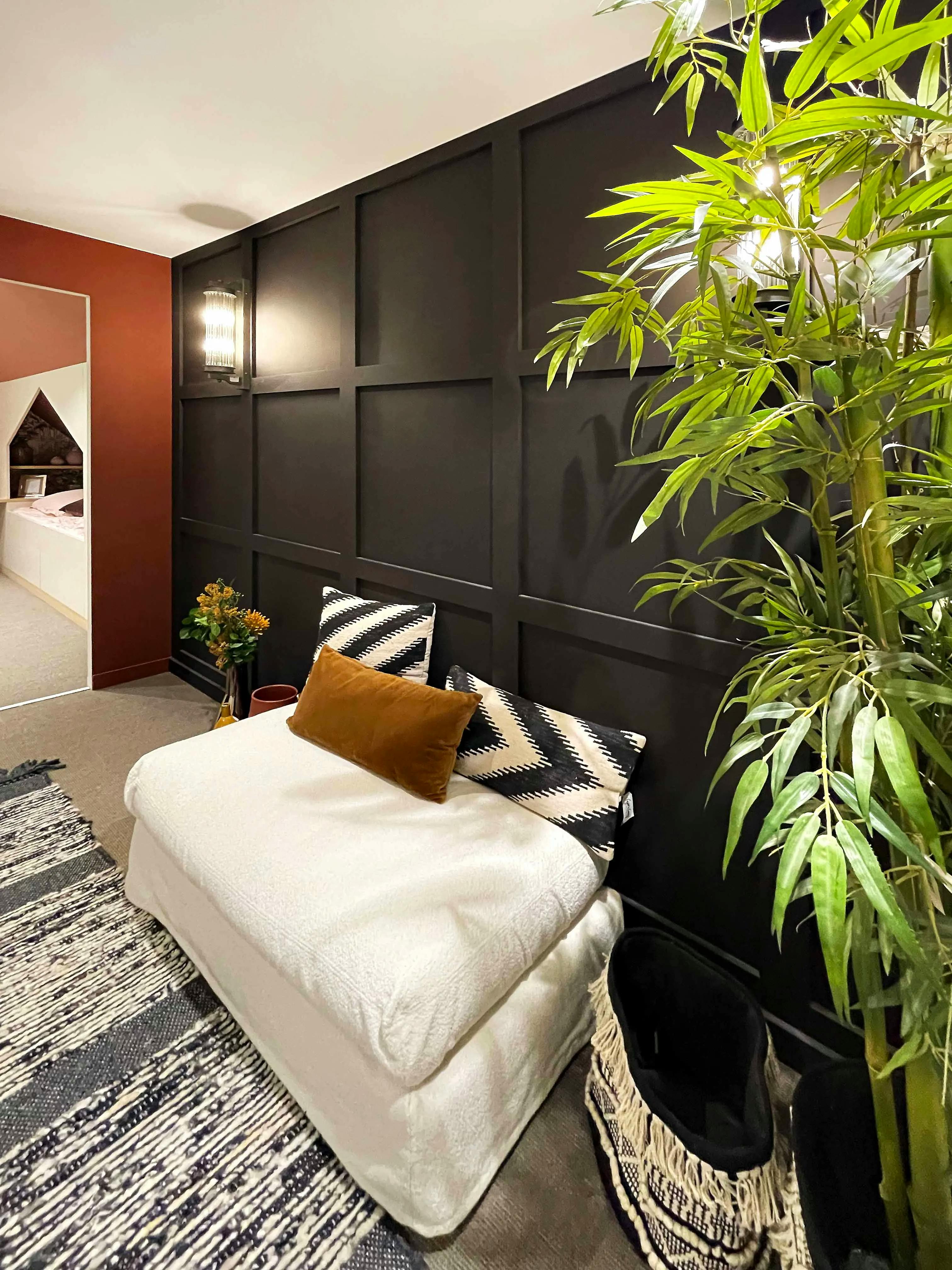 La nécessité de délimiter une zone de détente a conduit à l’installation d’un mur à panneaux en bois noir, apportant profondeur et caractère à l’ensemble. Le sur-mesure était essentiel pour assurer xune parfaite intégration dans l’architecture existante et pour harmoniser les proportions du mur avec le reste de la décoration. L’ajout d’appliques murales crée un éclairage tamisé, renforçant l’atmosphère cosy et mettant en valeur les détails du panneau. Enfin, les éléments décoratifs, tels que les textiles aux motifs géométriques et les plantes en pots, apportent une touche de chaleur et de contraste avec la sobriété du fond sombre.