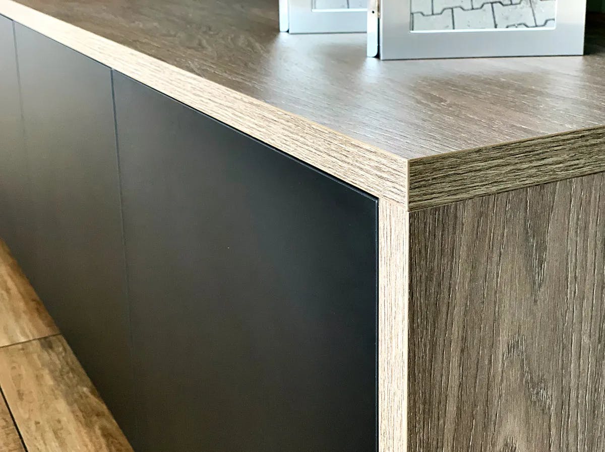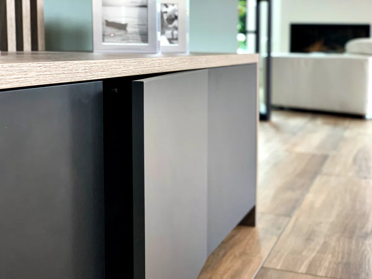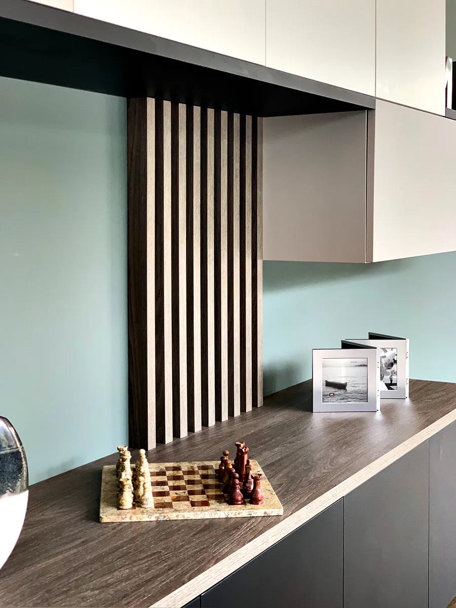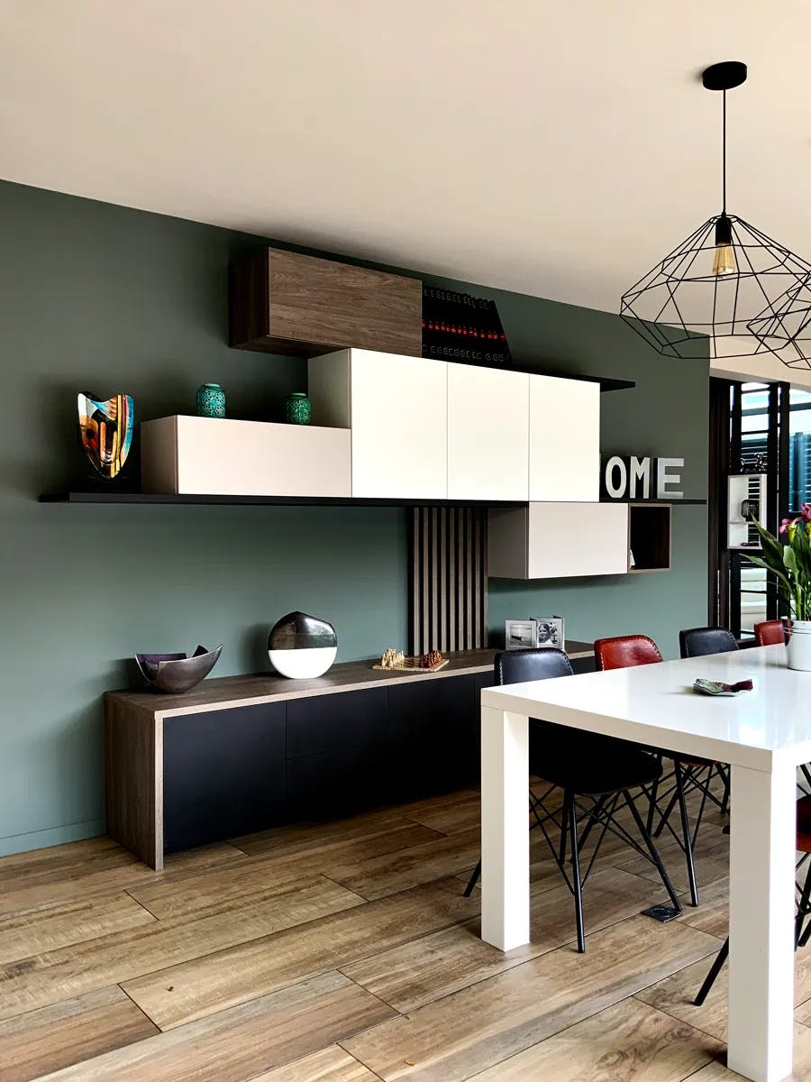 L’objectif était d’intégrer des rangements fermés et des éléments décoratifs dans une composition graphique et légère. Le sur-mesure a permis d’exploiter toute la longueur du mur avec un jeu de volumes asymétriques, associant des caissons suspendus et un buffet bas. Le mélange des finitions bois, noir mat et blanc crée un contraste élégant, tandis que les lames verticales ajoutent une touche décorative et structurent l’ensemble. Cet aménagement allie esthétisme et fonctionnalité, offrant des espaces de rangement tout en conservant une impression d’ouverture.