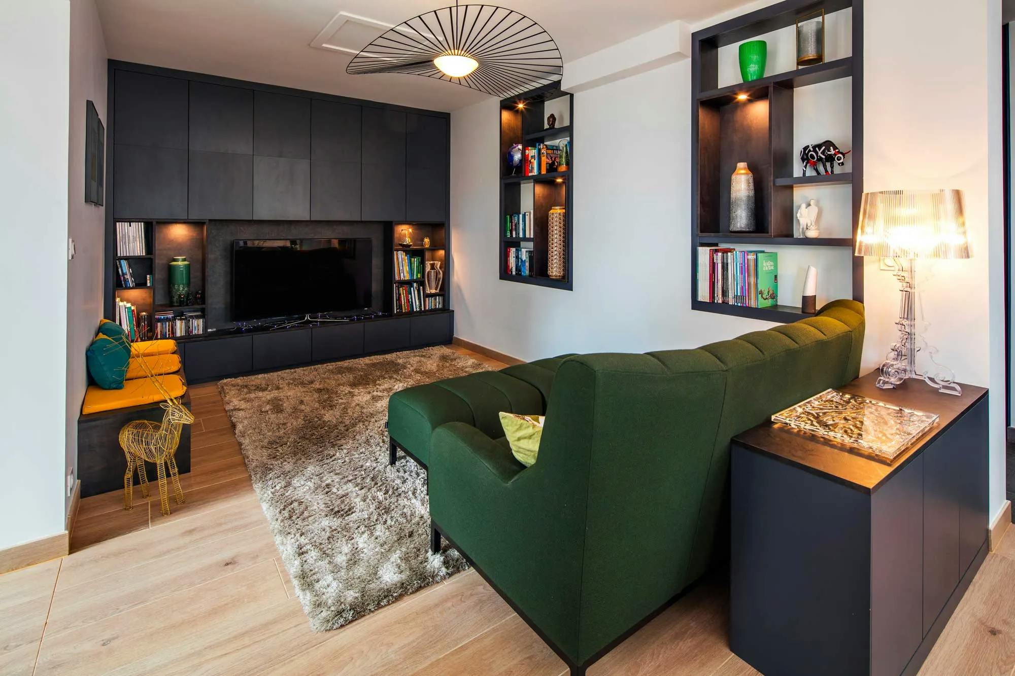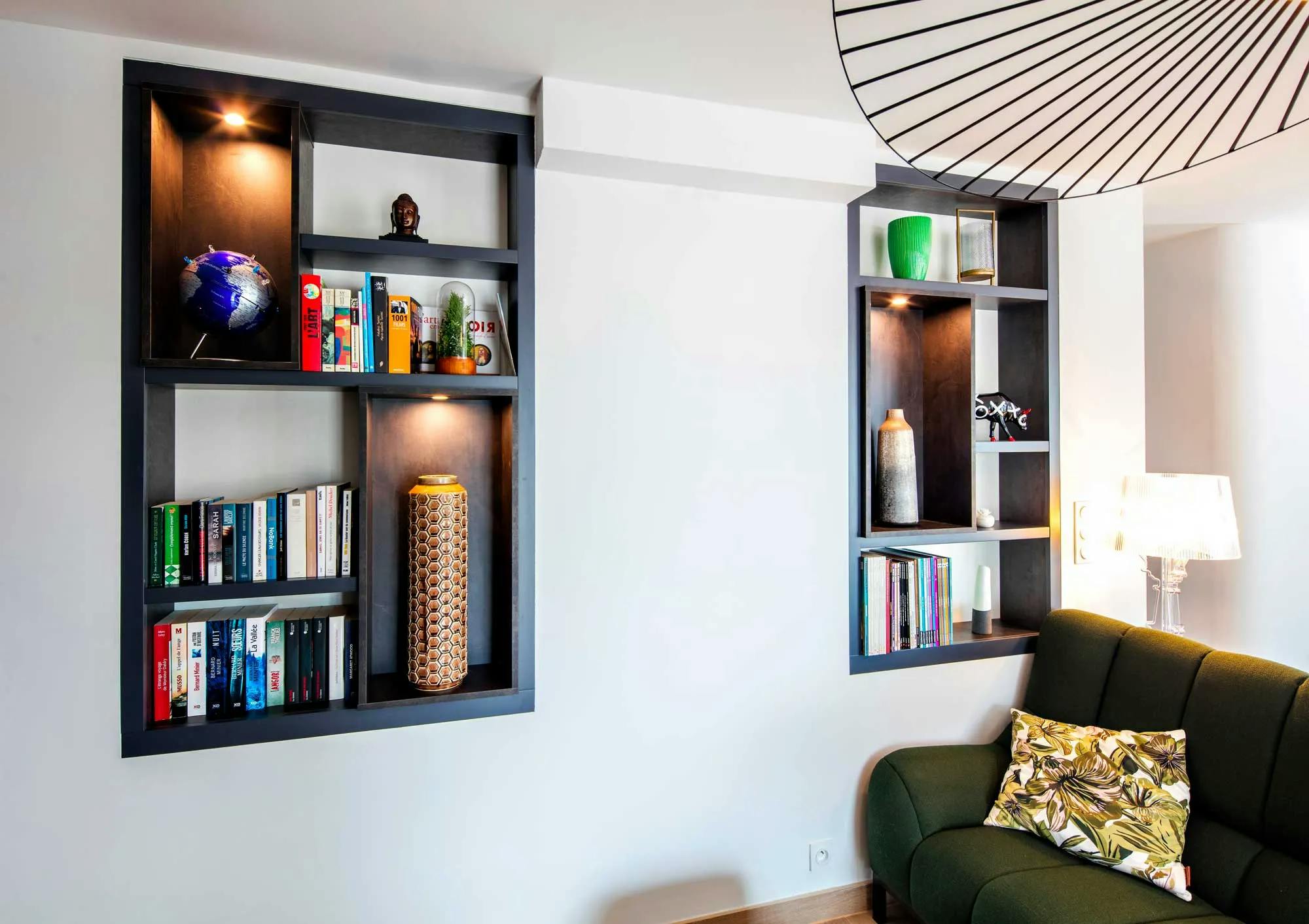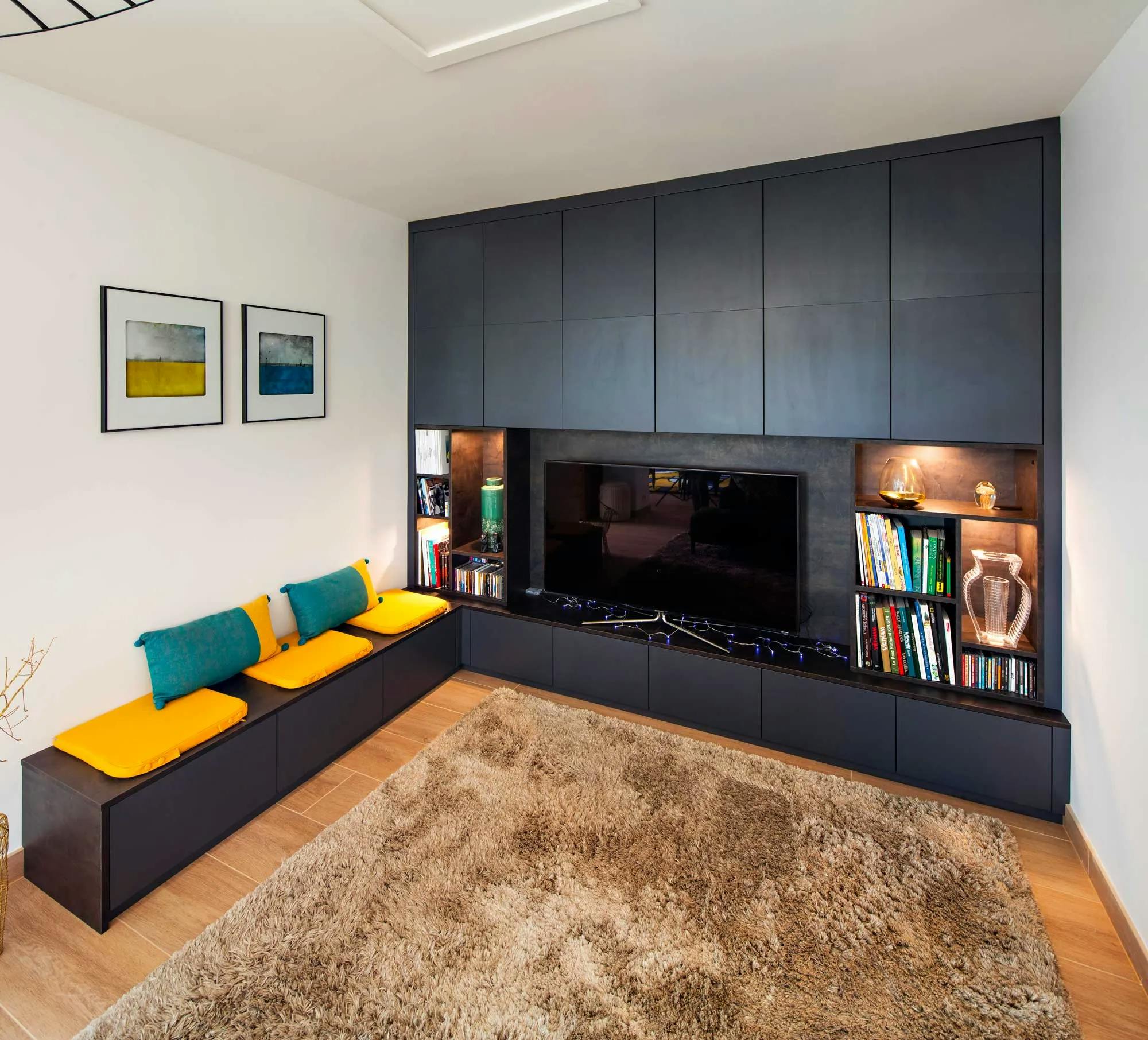 L'enjeu principal était d’organiser cet espace en imaginant l’agencement autour de l’écran sans alourdir la pièce. Le sur-mesure était essentiel pour exploiter toute la hauteur et maximiser les capacités de rangement tout en intégrant des zones ouvertes et fermées. La solution retenue comprend des placards fermés en partie haute pour un maximum de stockage, des étagères ouvertes rétroéclairées autour de l’écran pour exposer des objets et une assise intégrée avec rangements en partie basse. La finition noire mate apporte une touche contemporaine et élégante, tandis que l’éclairage LED met en valeur les éléments décoratifs et le mobilier design personnalisé.