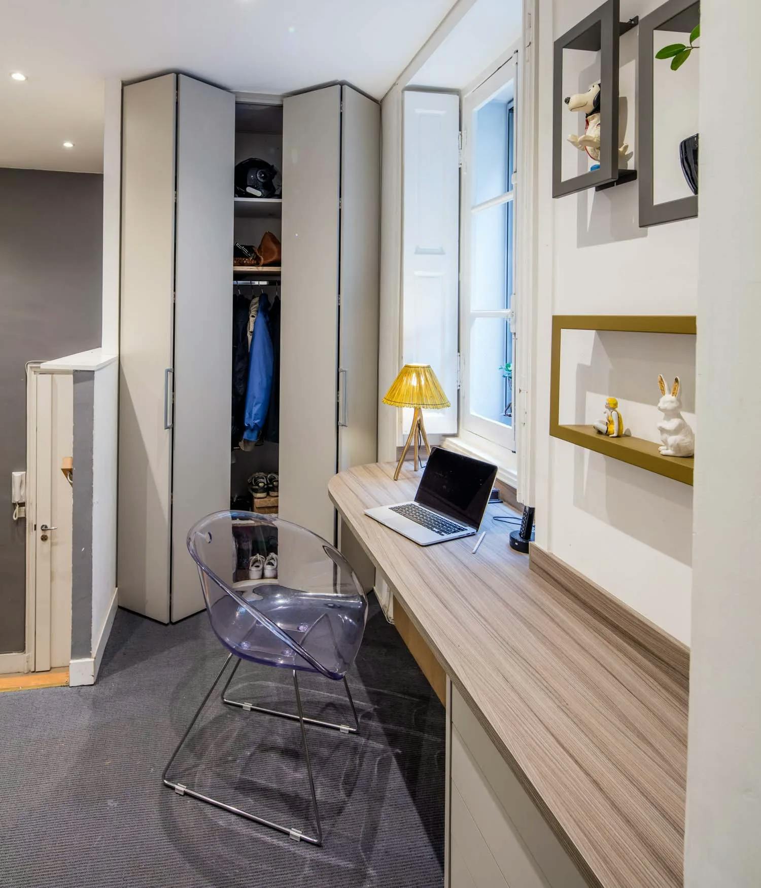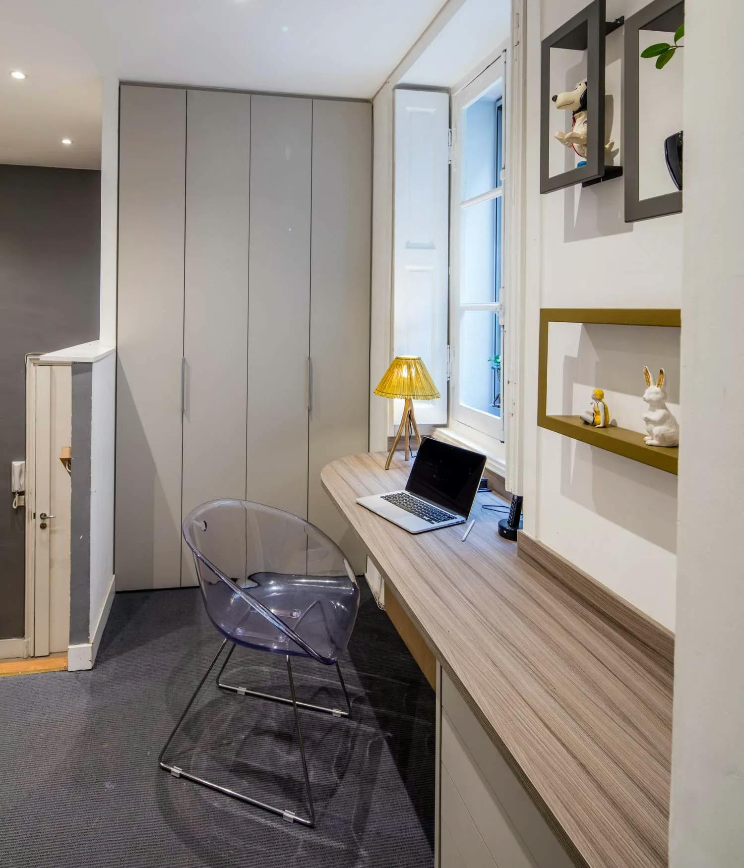 Le défi principal était d'exploiter un mur avec une fenêtre et une inclinaison du sol, ce qui imposait une solution sur mesure pour garantir une ergonomie optimale. L’installation d’un plan de travail filant épouse la longueur du mur et maximise la surface utile sans alourdir l’espace. Des rangements discrets, avec des portes sobres et une finition mate, assurent une intégration harmonieuse avec l’environnement existant. L’ajout d’étagères décoratives et d’un éclairage bien placé apporte du relief et un équilibre visuel à l’ensemble.