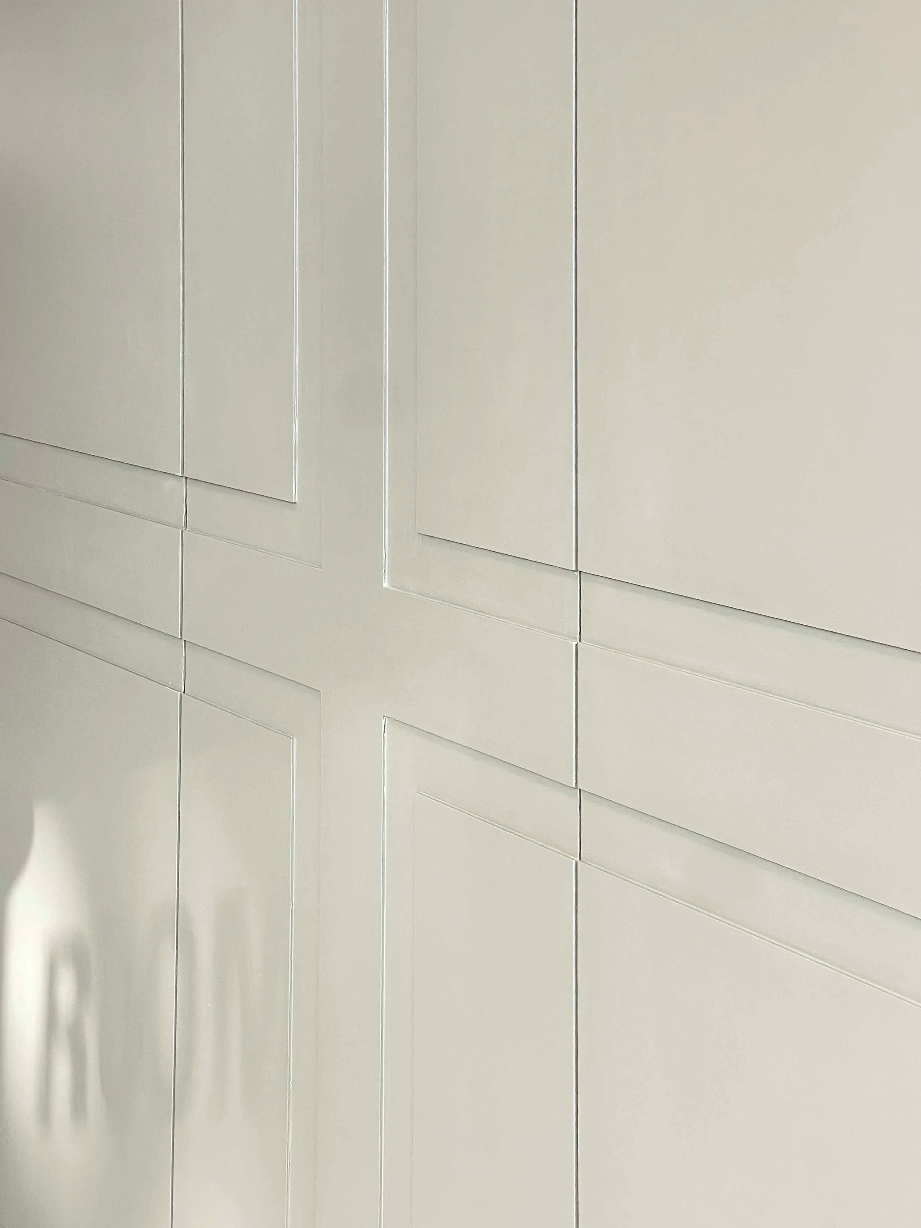 L’aménagement se compose de placards toute hauteur, avec un alignement parfait des portes pour une finition homogène. Les moulures apportent un aspect raffiné et structuré, s’accordant avec le mobilier adjacent. La teinte douce et mate assure une intégration fluide dans l’espace, créant un rangement à la fois discret et élégant.