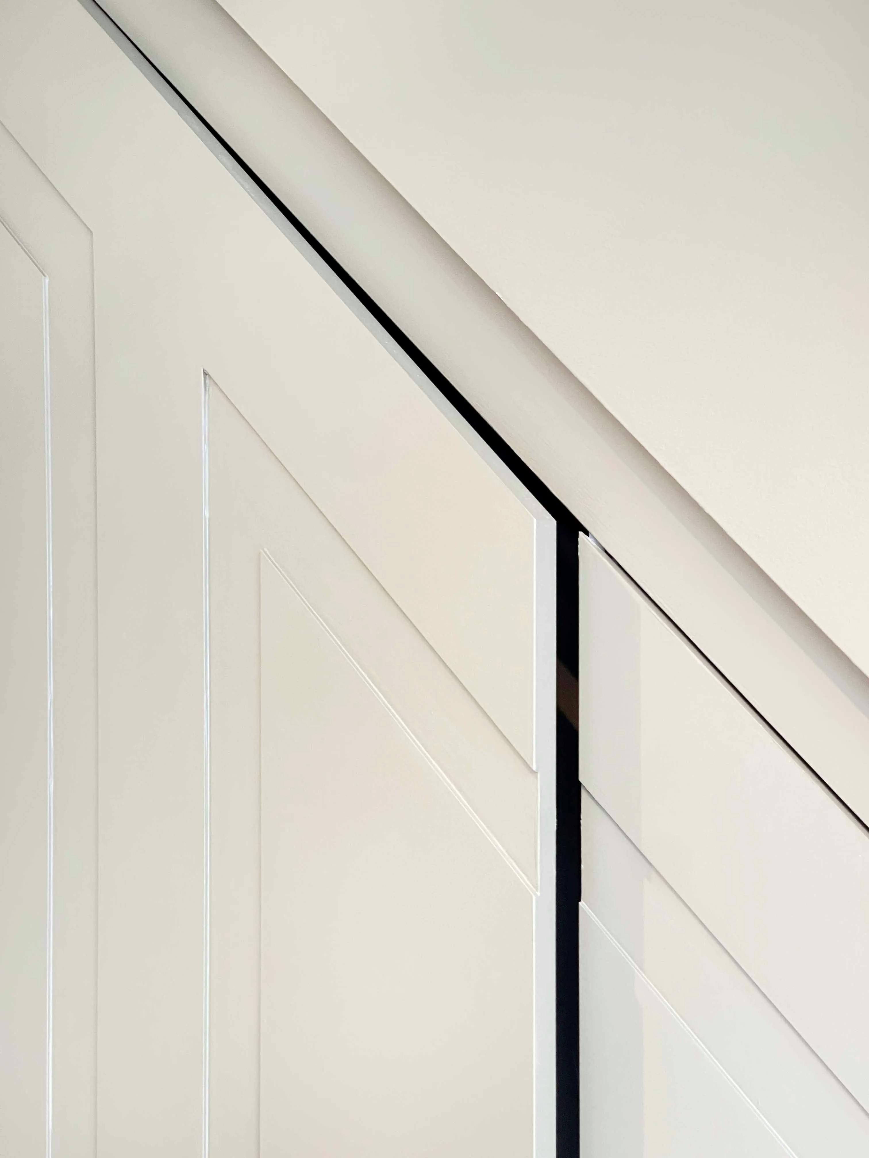 La principale contrainte résidait dans la pente de l’escalier, qui nécessitait un agencement précis des façades et des ouvertures. Il fallait concevoir un rangement qui allie accessibilité et discrétion, tout en conservant une esthétique soignée. Le sur-mesure a permis d’exploiter toute la hauteur disponible et d’intégrer des portes avec un travail de moulures pour apporter du cachet.