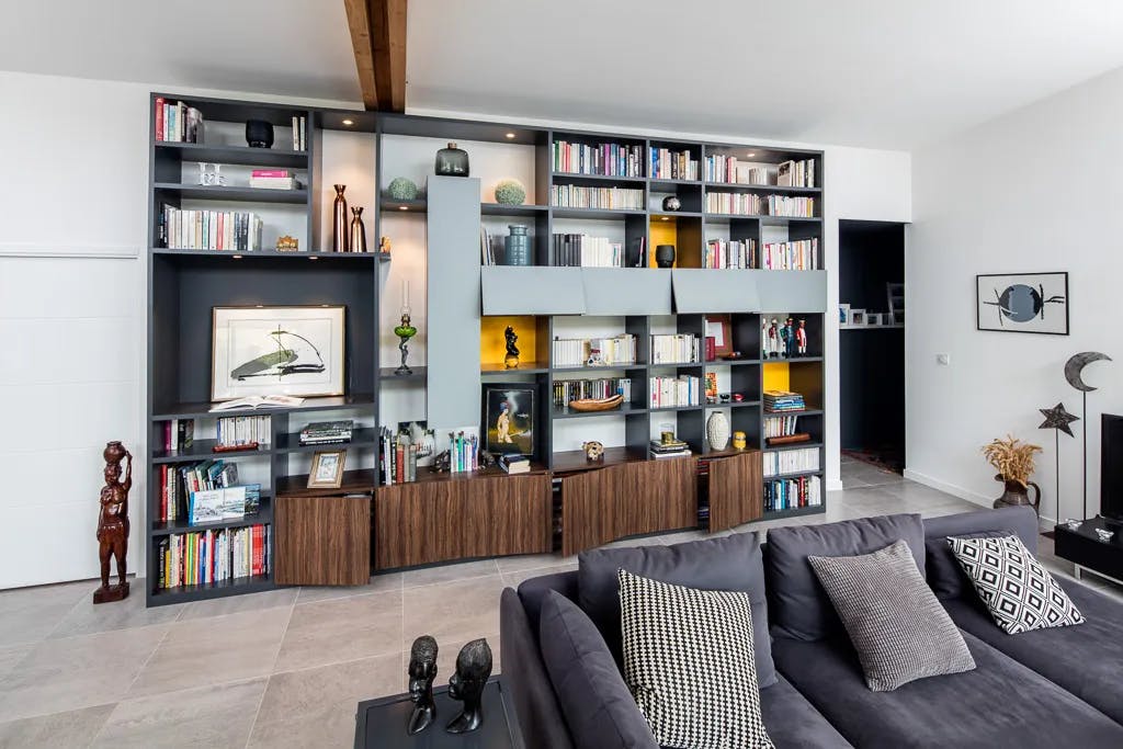 Le défi consistait à concevoir un meuble alliant étagères ouvertes, rangements fermés et niches décoratives sans alourdir l’espace. Le sur-mesure était indispensable pour intégrer différentes hauteurs et profondeurs, offrant un équilibre entre fonctionnalité et esthétisme. La solution adoptée comprend des modules fermés en partie haute, des étagères ouvertes rétroéclairées et des placards bas en finition bois pour dissimuler le rangement. Le jeu de couleurs entre le gris, le bois et les touches de jaune apporte du contraste, tandis que l’éclairage intégré met en valeur le mobilier design et personnalisé.