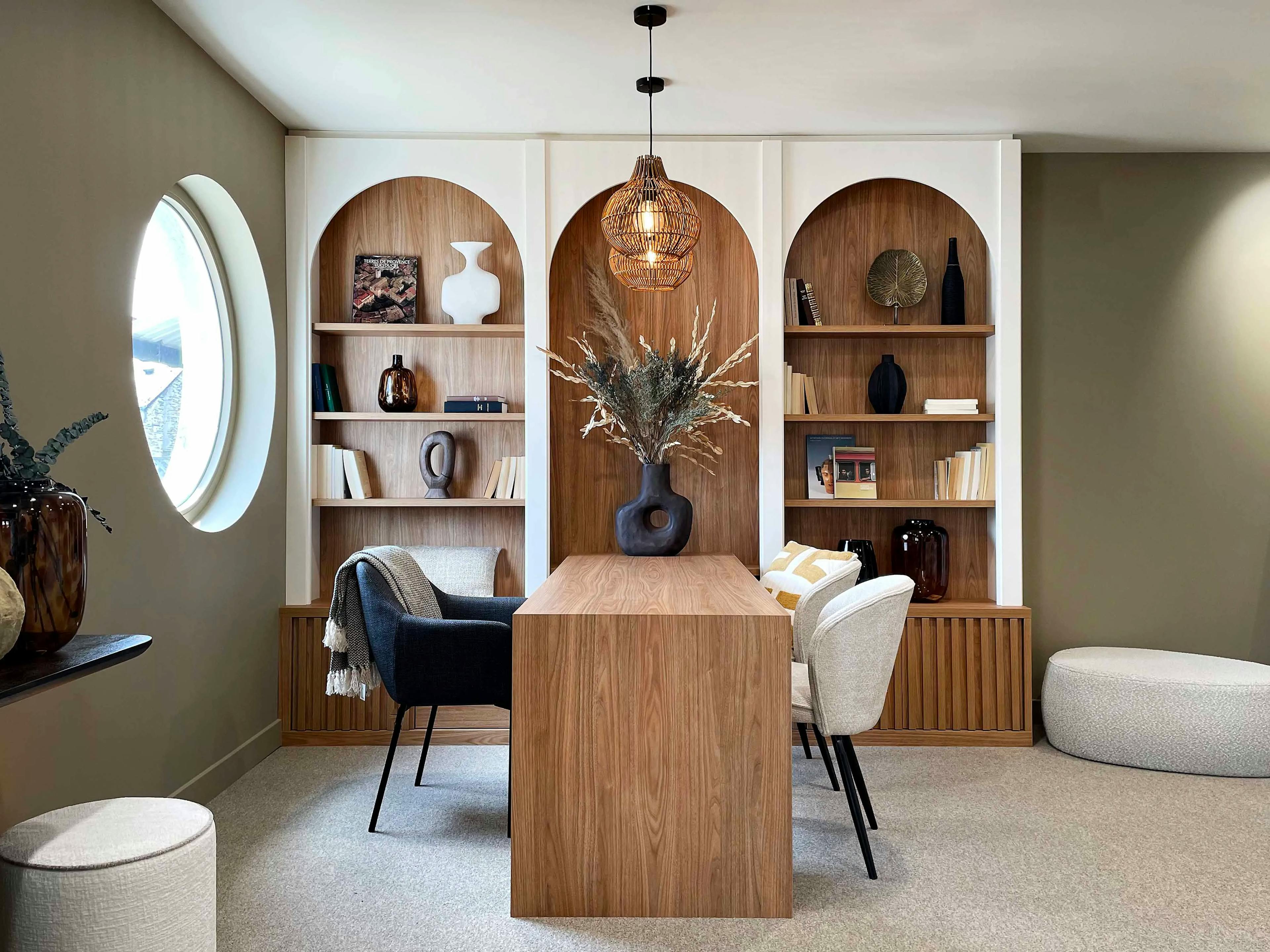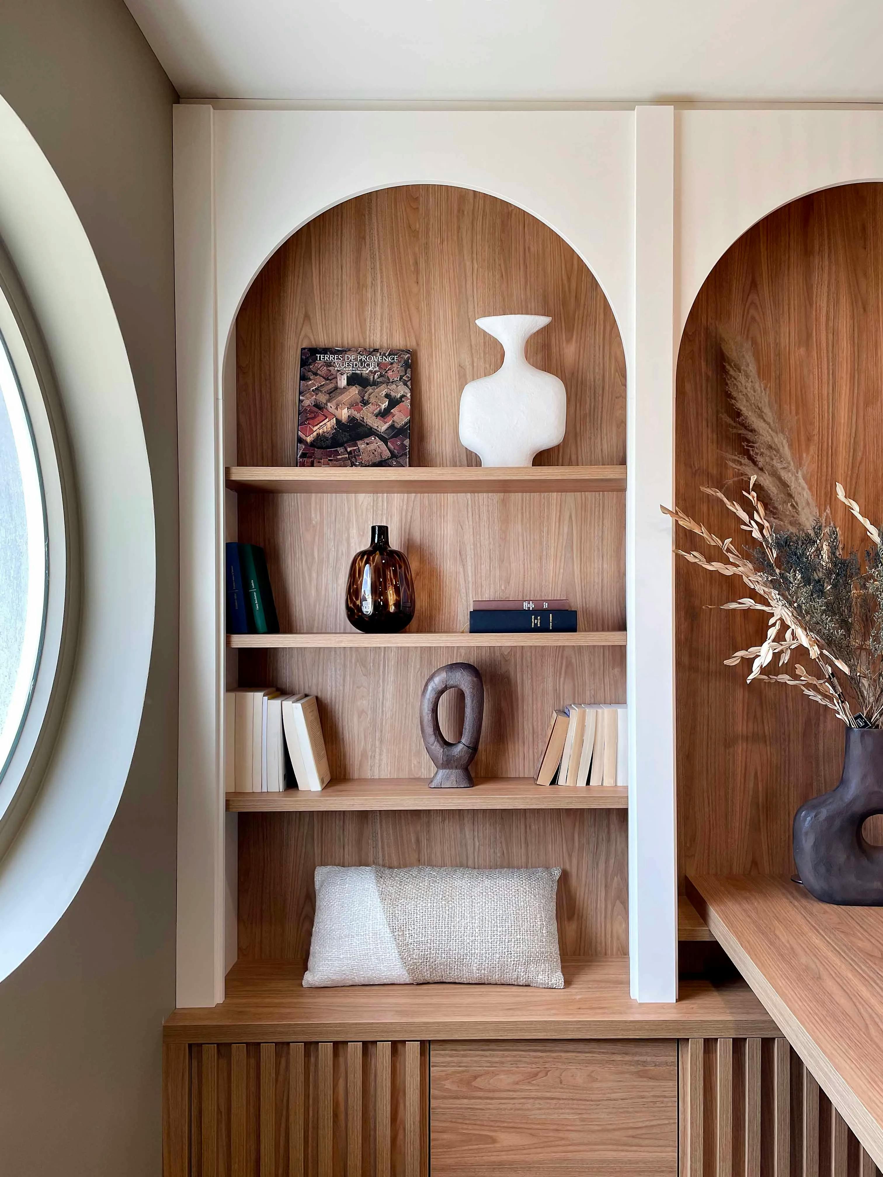 Le sur-mesure s’est révélé indispensable pour tirer parti de la hauteur sous plafond et intégrer parfaitement les formes architecturales existantes. Nous avons conçu des meubles qui allient fonctionnalité et esthétique, avec des étagères ouvertes pour exposer des livres et objets d’art, et des compartiments fermés pour le rangement discret. La finition en bois naturel apporte une atmosphère douce et chaleureuse, tandis que les arches accentuent le côté élégant et contemporain.