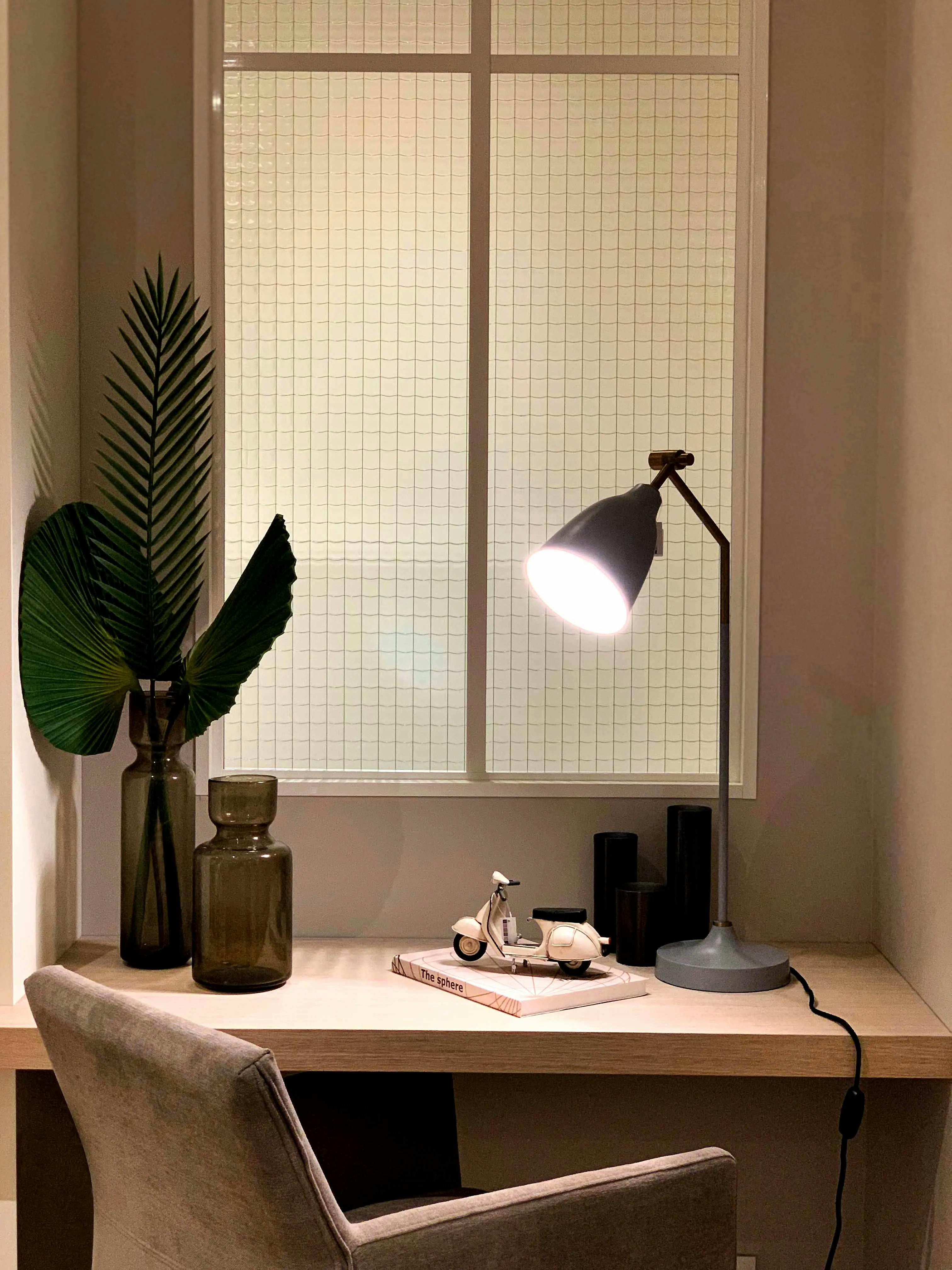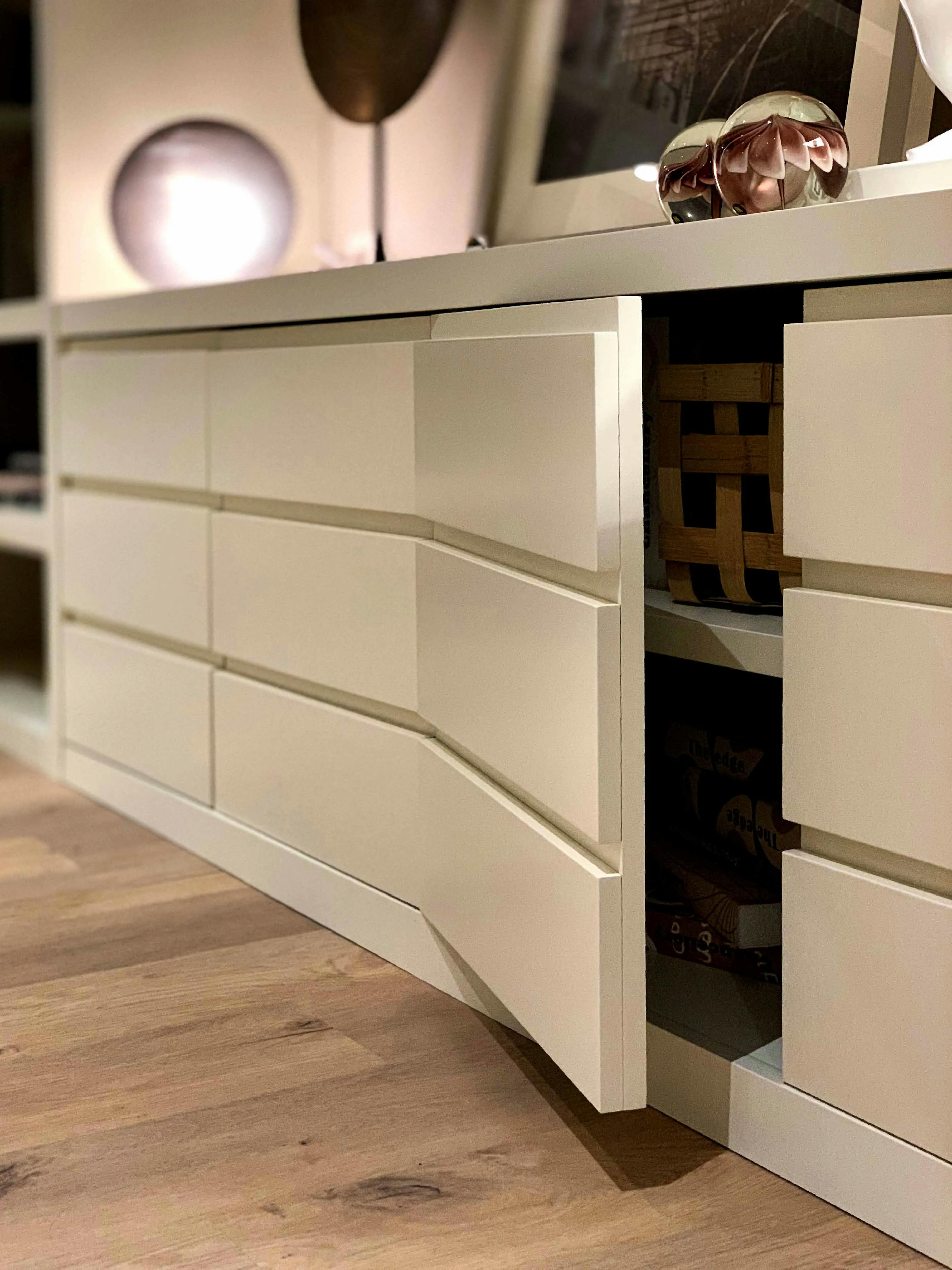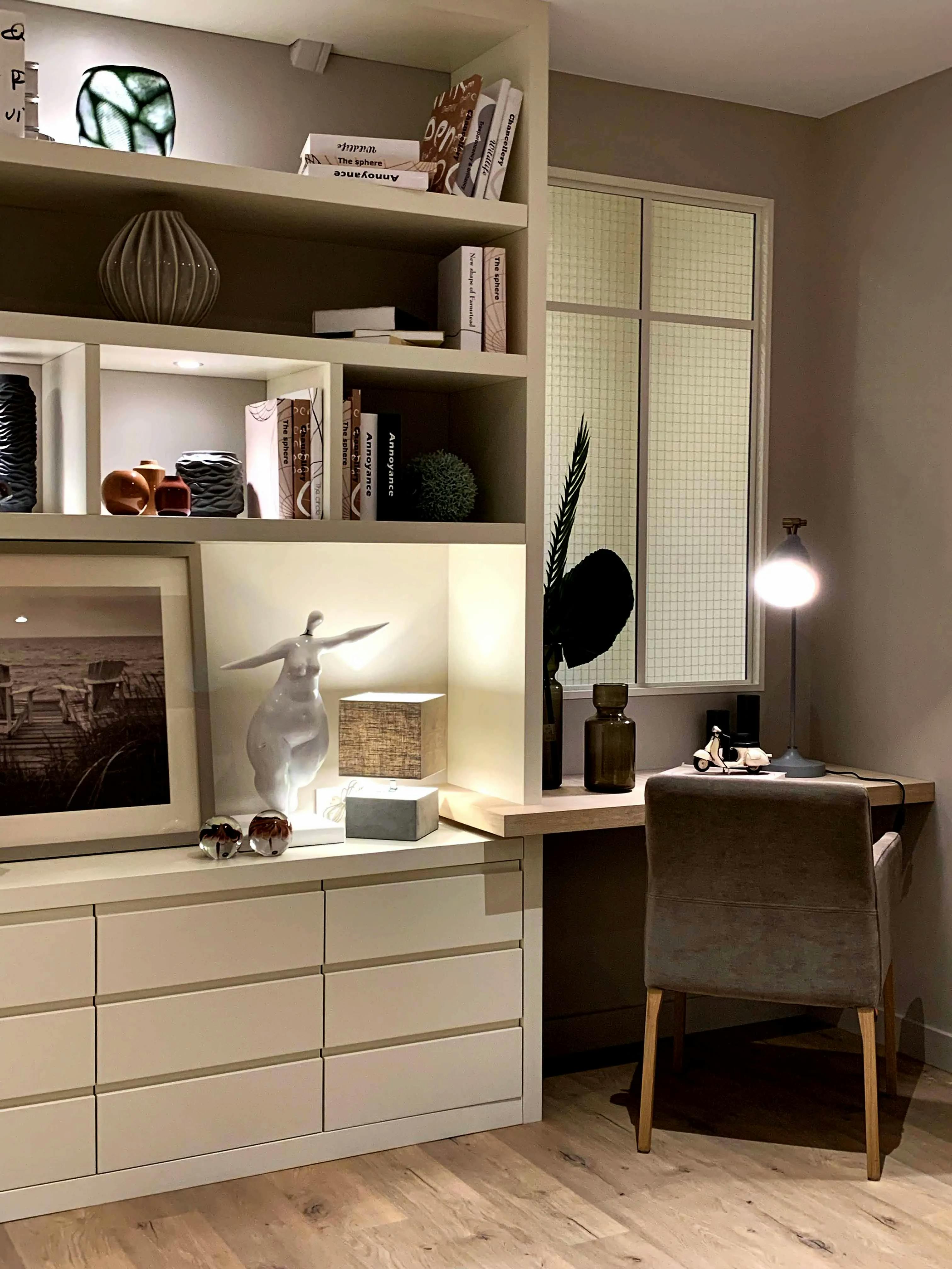 Le meuble associe des tiroirs bas pour un rangement optimisé, des niches ouvertes rétroéclairées pour mettre en valeur les objets décoratifs et un bureau suspendu parfaitement intégré. La verrière en verre armé ajoute du cachet et permet de délimiter l’espace sans l’isoler complètement. Les finitions aux tons doux, combinées aux éléments en bois naturel, créent une atmosphère chaleureuse et raffinée, idéale pour un espace de travail et de détente.