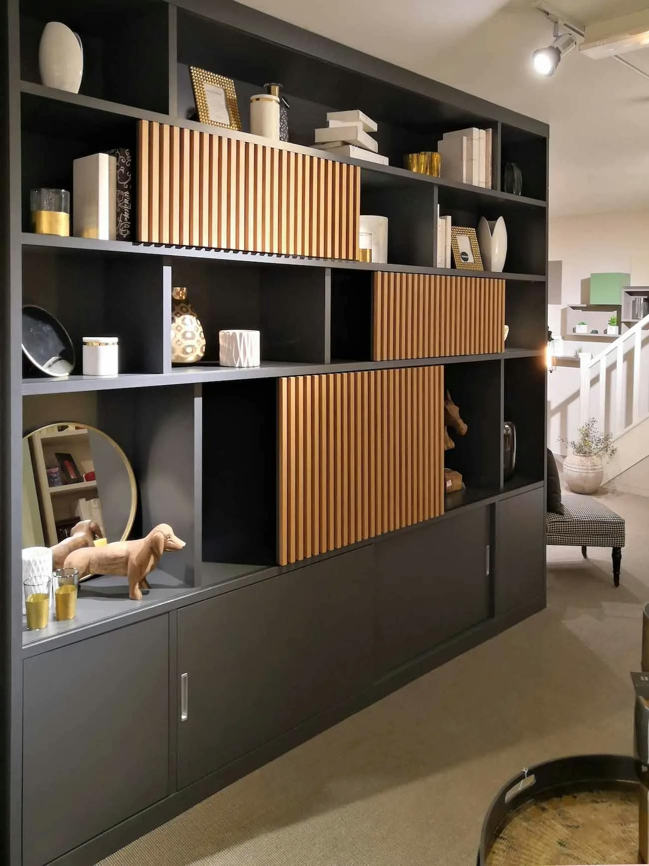 Le sur-mesure était essentiel pour ajuster les dimensions du meuble aux spécificités de la pièce tout en répondant aux besoins de rangement. L'idée était de concilier des espaces ouverts pour les objets décoratifs et des zones fermées pour les objets à dissimuler.
