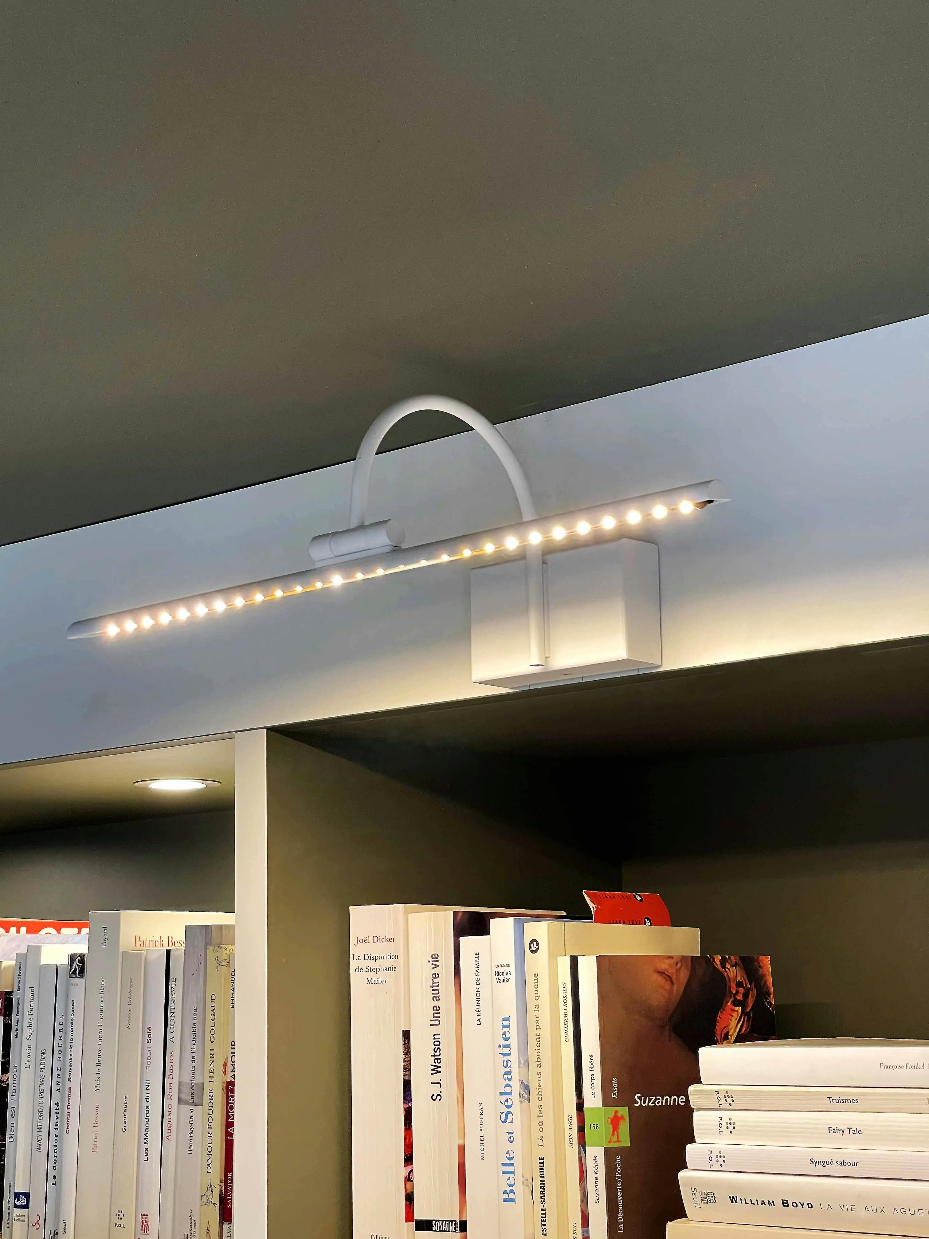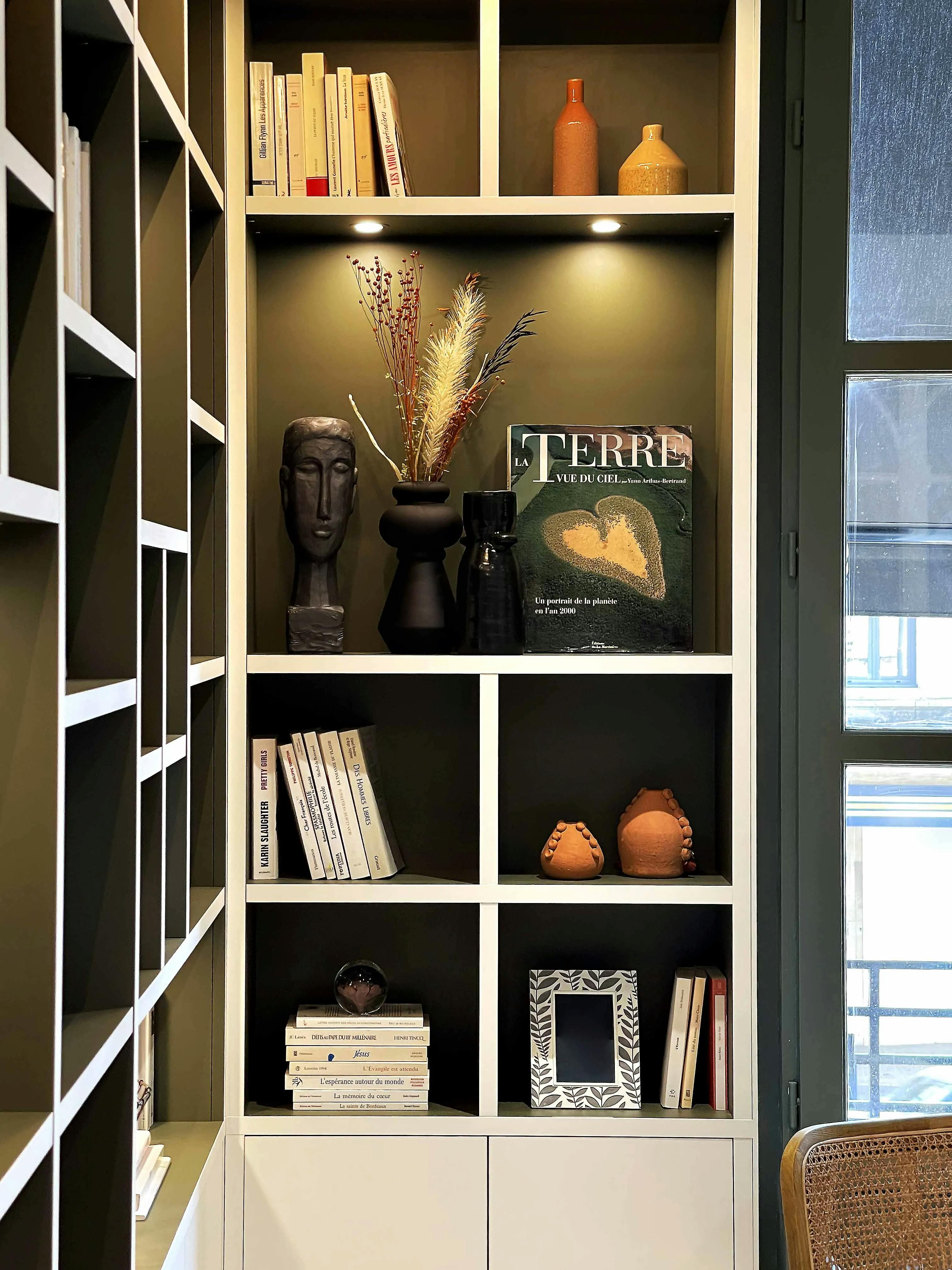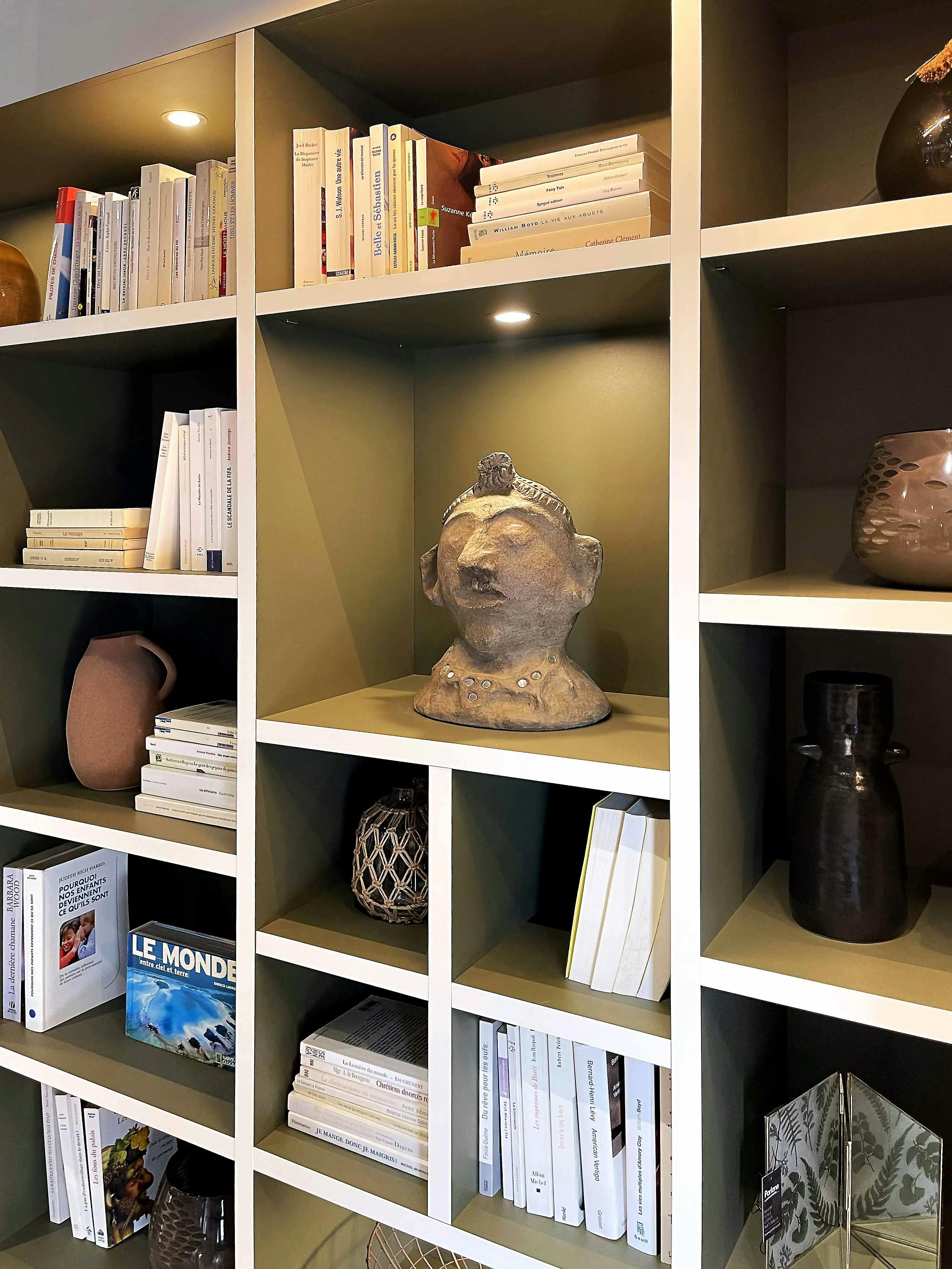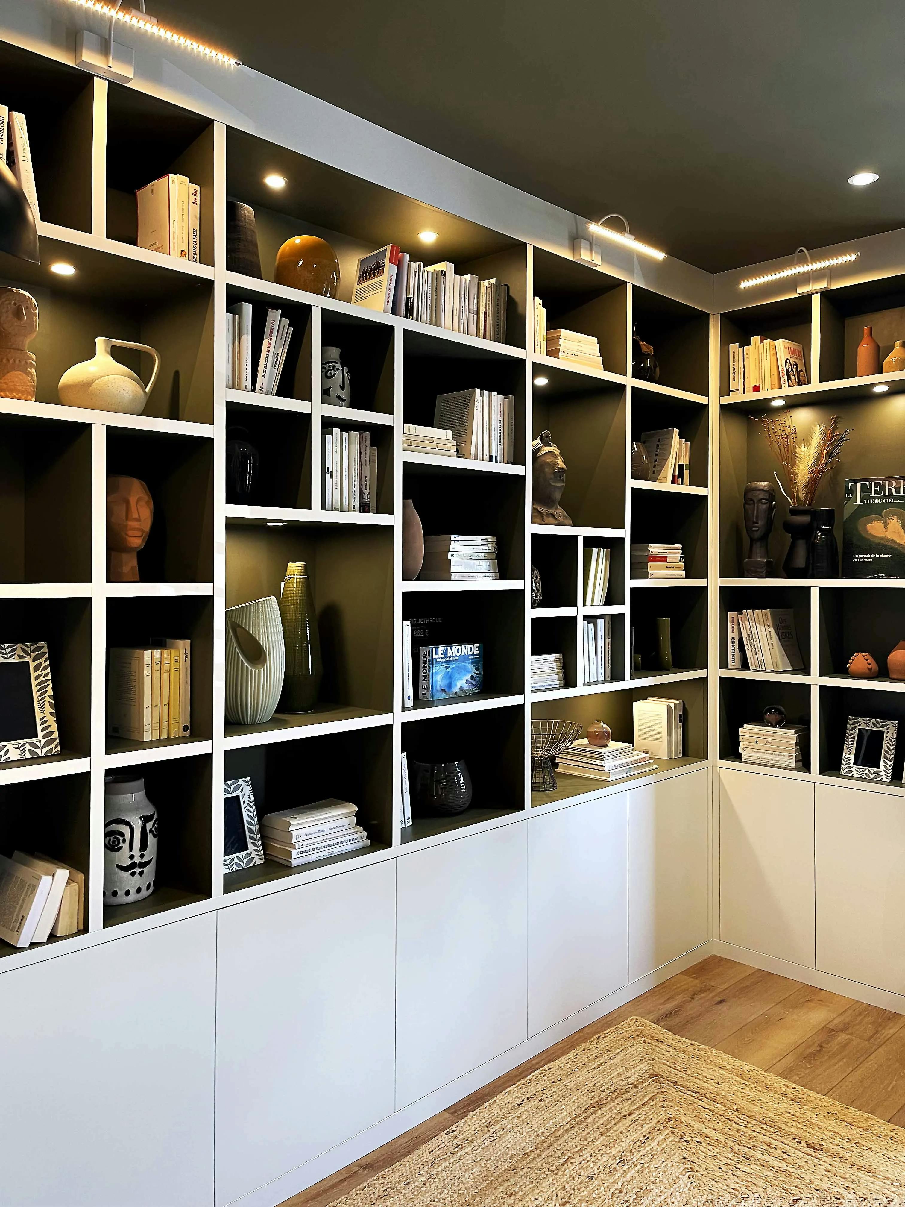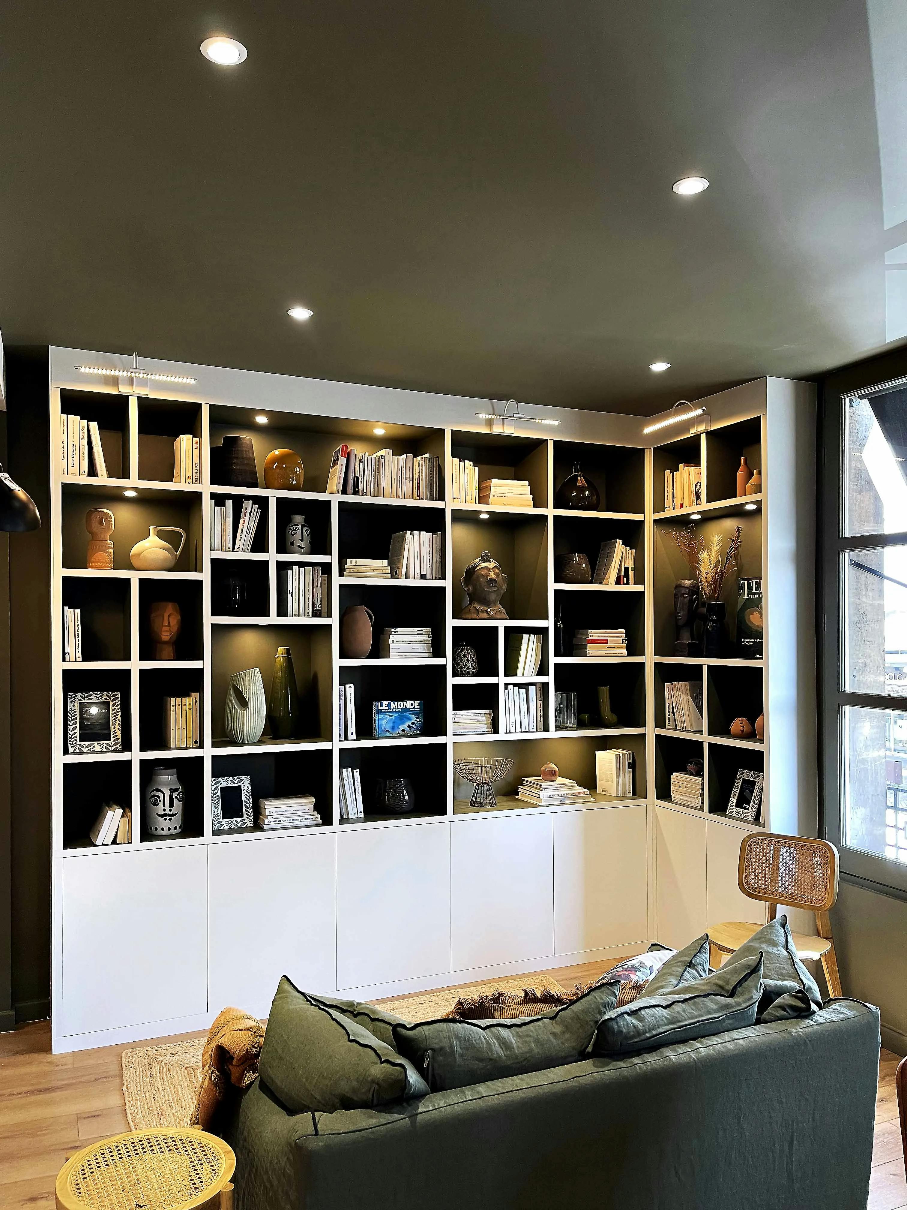 Le défi était de donner une fonction à un mur vide en ajoutant du rangement dans la pièce. Le sur-mesure était la seule solution pour optimiser au maximum l'espace disponible. Nous avons imaginé une bibliothèque design en "L", combinant étagères ouvertes pour la décoration et rangements bas fermés pour la praticité. Les détails résident dans le contraste entre le fond des niches vert olive et les chants des étagères blanches. Une astuce de conception qui concentre le regard sur la partie ouverte de l'aménagement et notamment les objets de décoration qui s'y trouvent mis en valeurs.