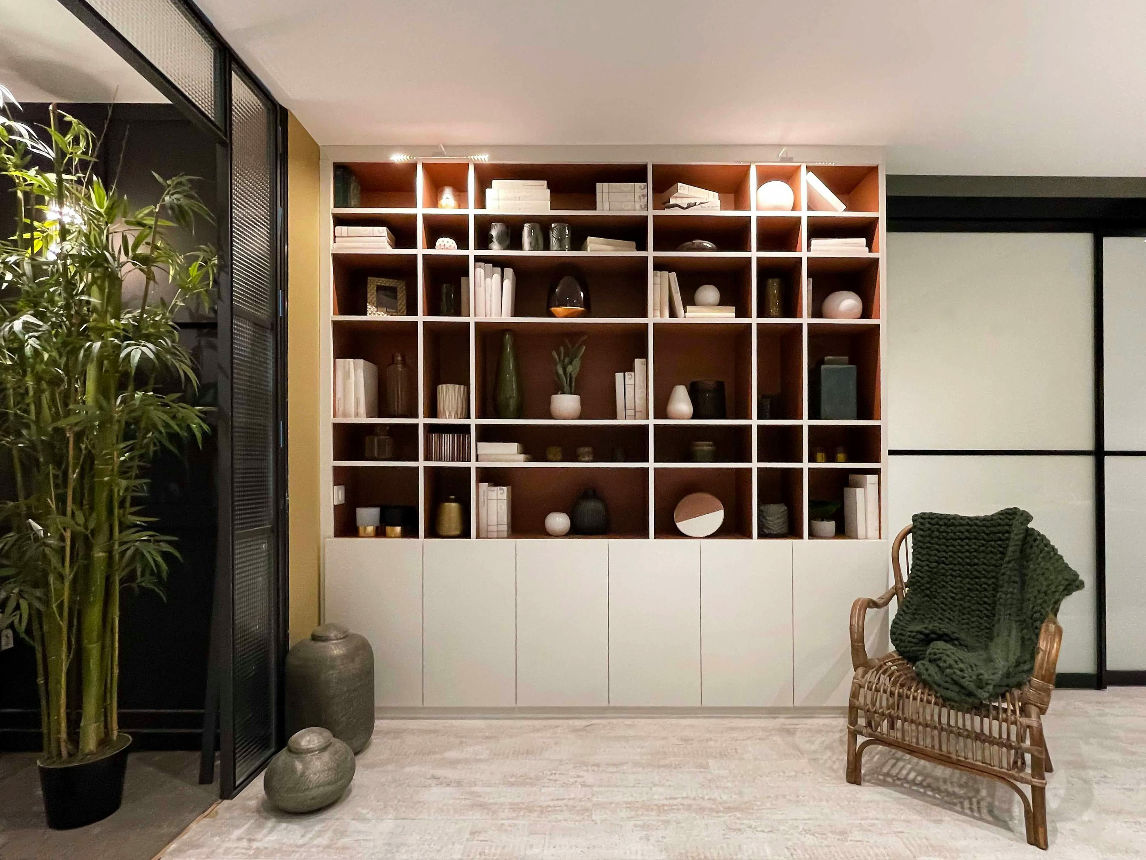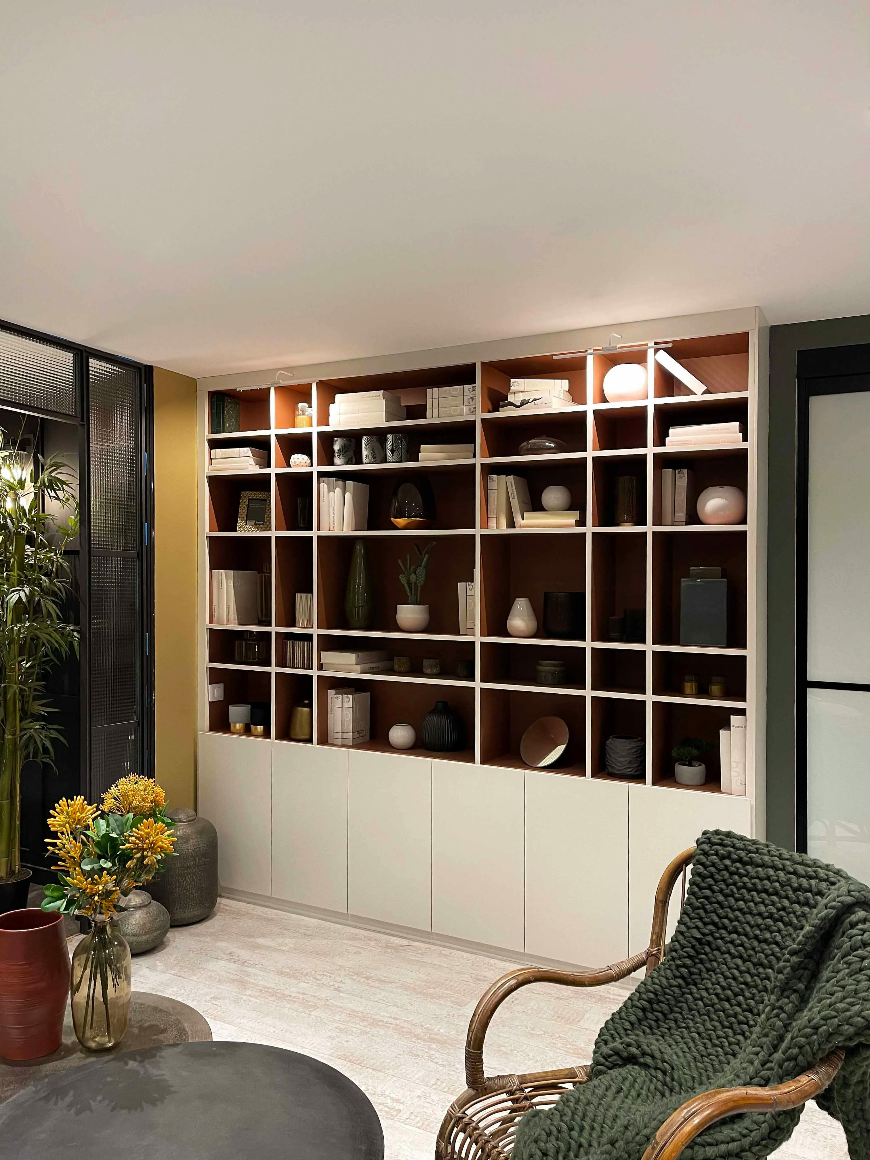 Le défi était de donner une fonction à un mur vide en ajoutant du rangement dans la pièce. Le sur-mesure était la seule solution pour optimiser au maximum l'espace disponible. Nous avons imaginé une bibliothèque design combinant étagères ouvertes pour la décoration et rangements bas fermés pour la praticité. Les détails résident dans le contraste entre le fond des niches en terracota et les chants des étagères blanches. Une astuce de conception qui concentre le regard sur la partie ouverte de l'aménagement et notamment les objets de décoration qui s'y trouvent mis en valeurs.