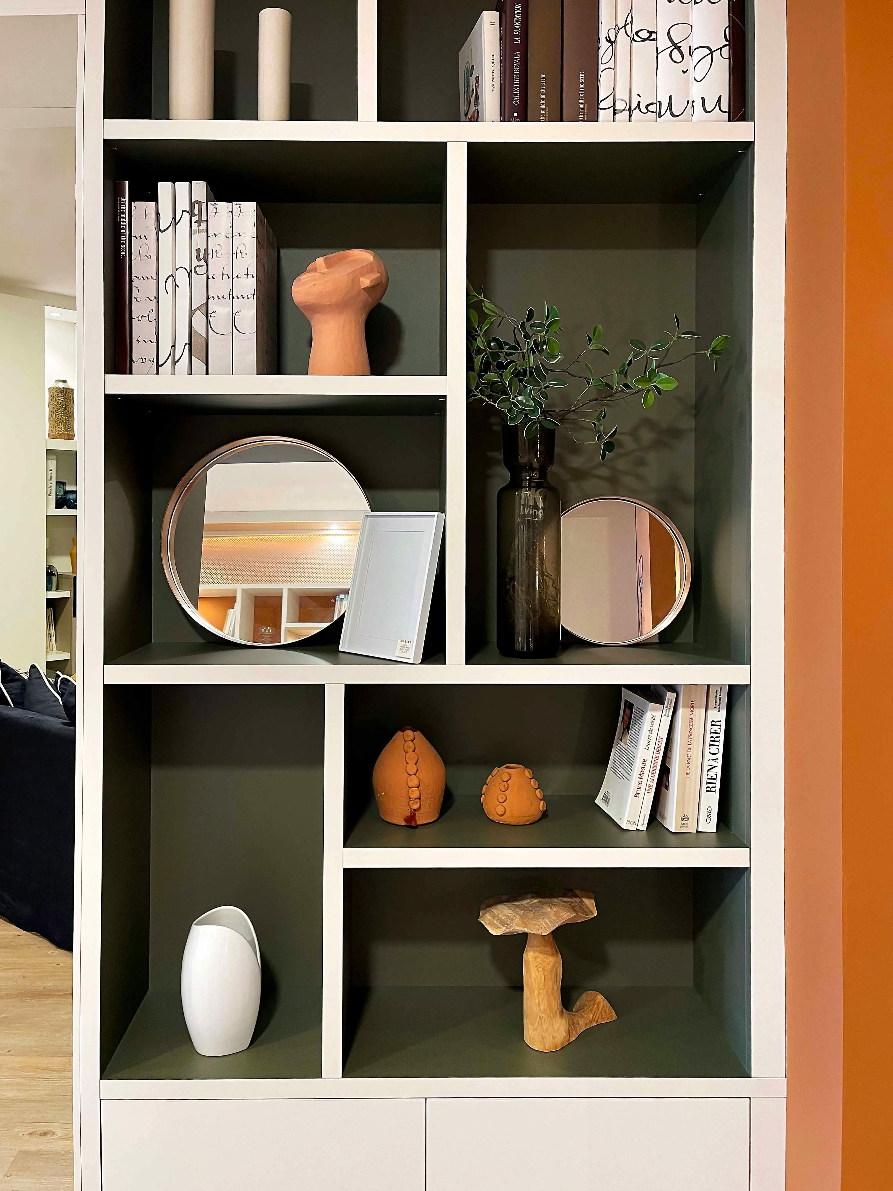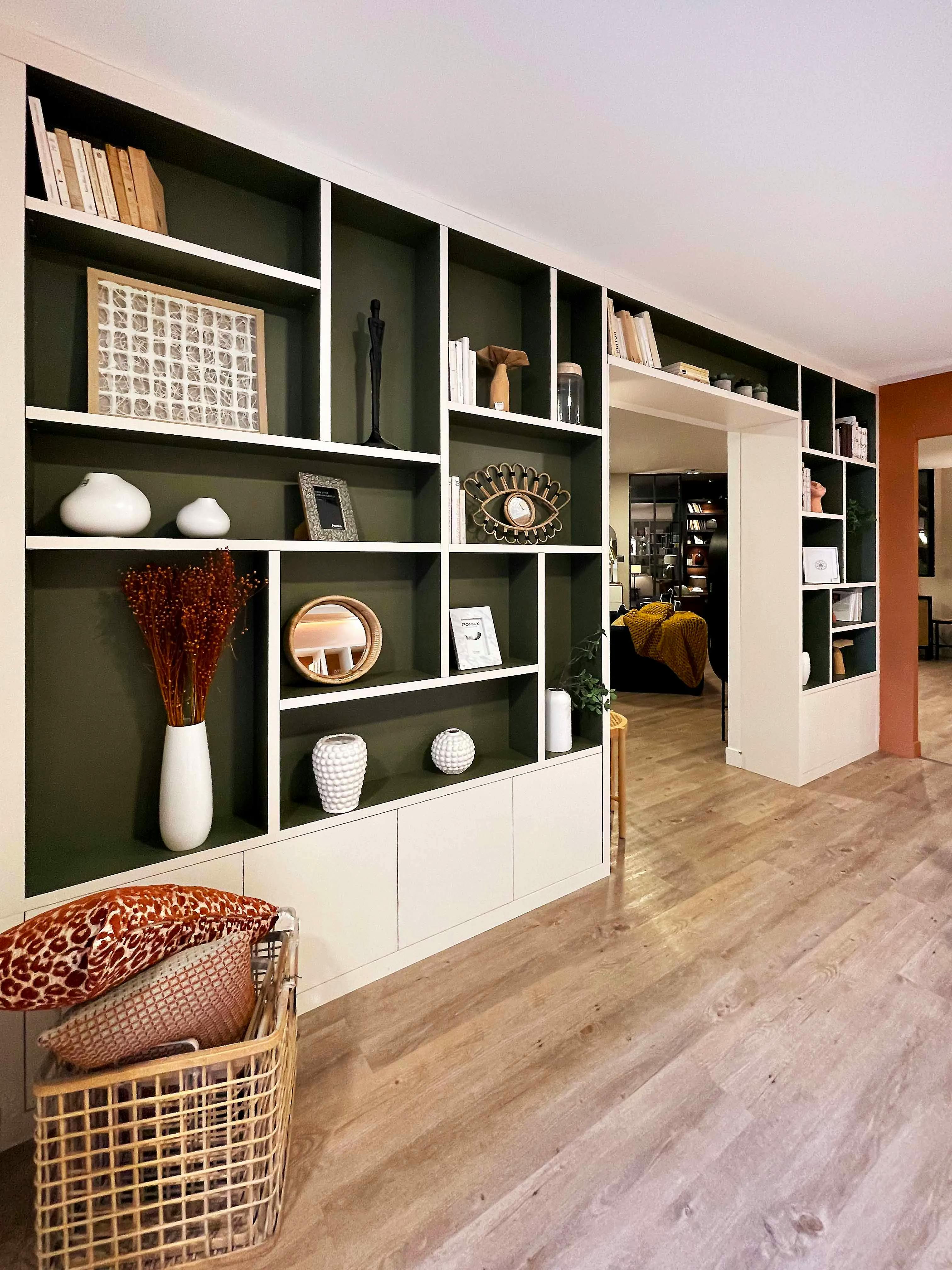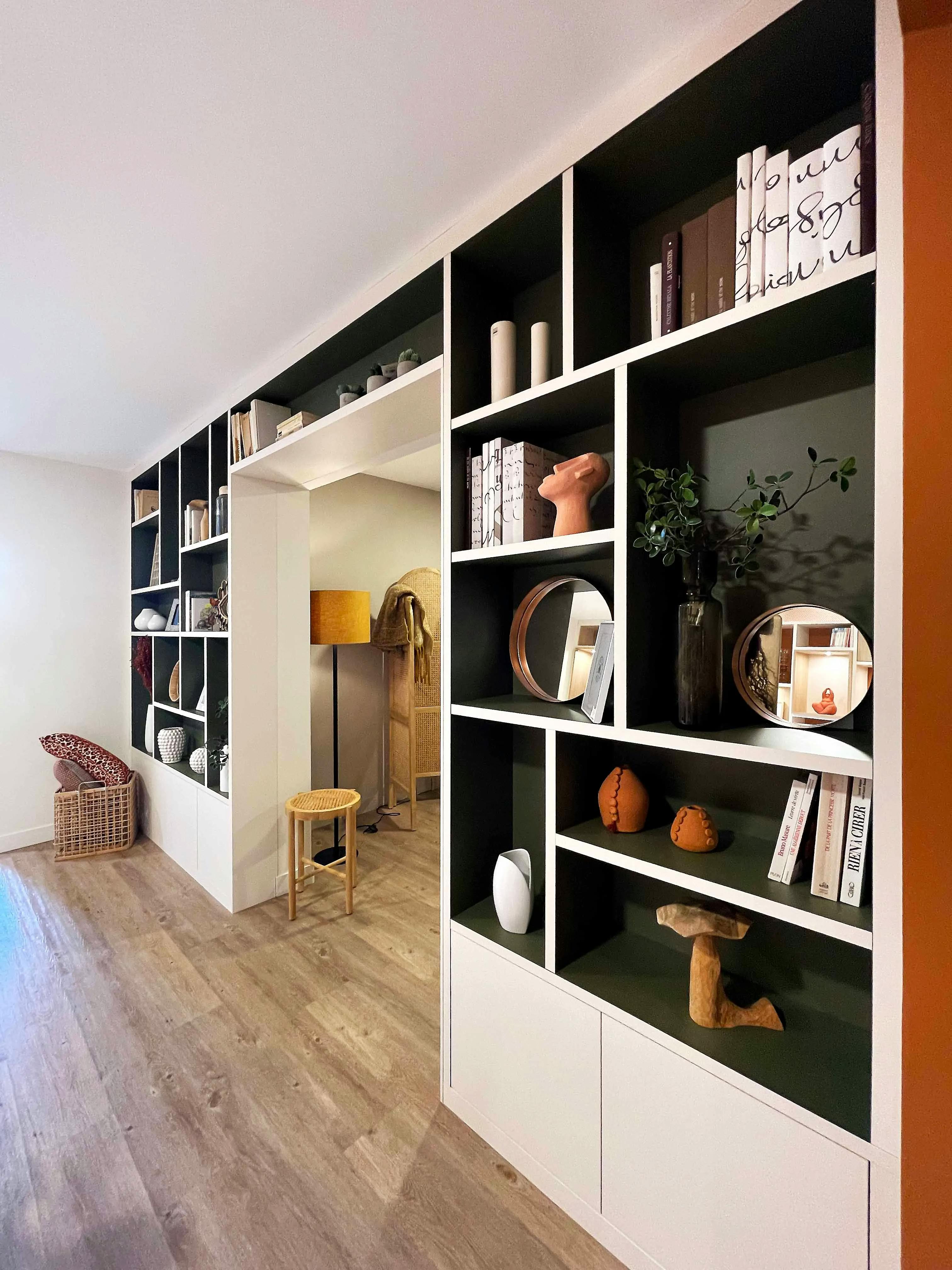 Le principal défi était d’habiller cette ouverture entre deux pièces sans réduire la luminosité ni entraver la circulation. Un aménagement sur-mesure était nécessaire pour épouser parfaitement les contours du passage et créer une continuité visuelle. La solution retenue comprend une bibliothèque intégrée avec des niches ouvertes pour exposer des objets et des placards bas fermés pour un rangement discret. La finition associe une structure blanche et un fond vert olive pour apporter du contraste, tandis que les accessoires décoratifs en céramique et en bois viennent compléter l’ensemble avec une touche naturelle et élégante.