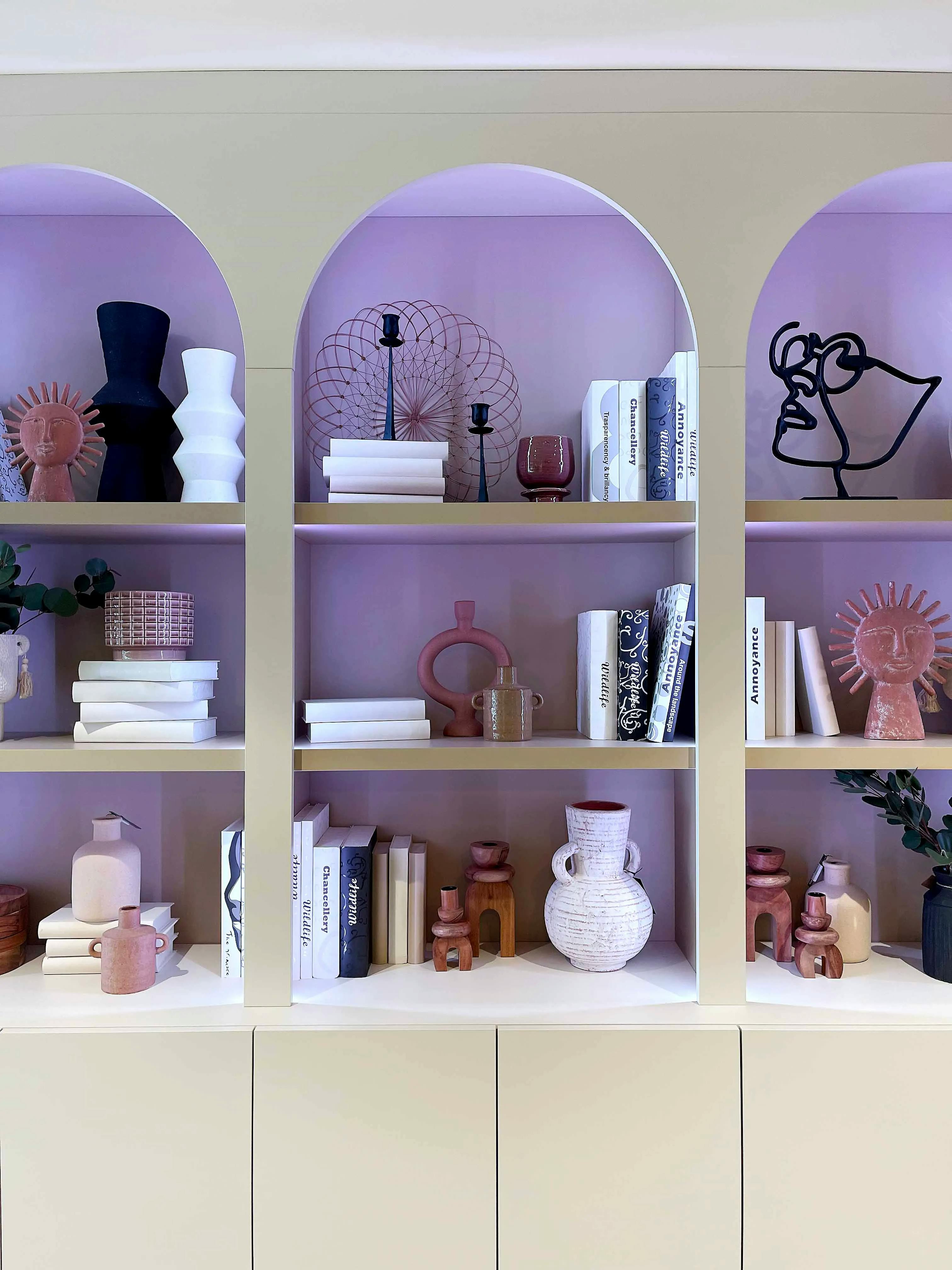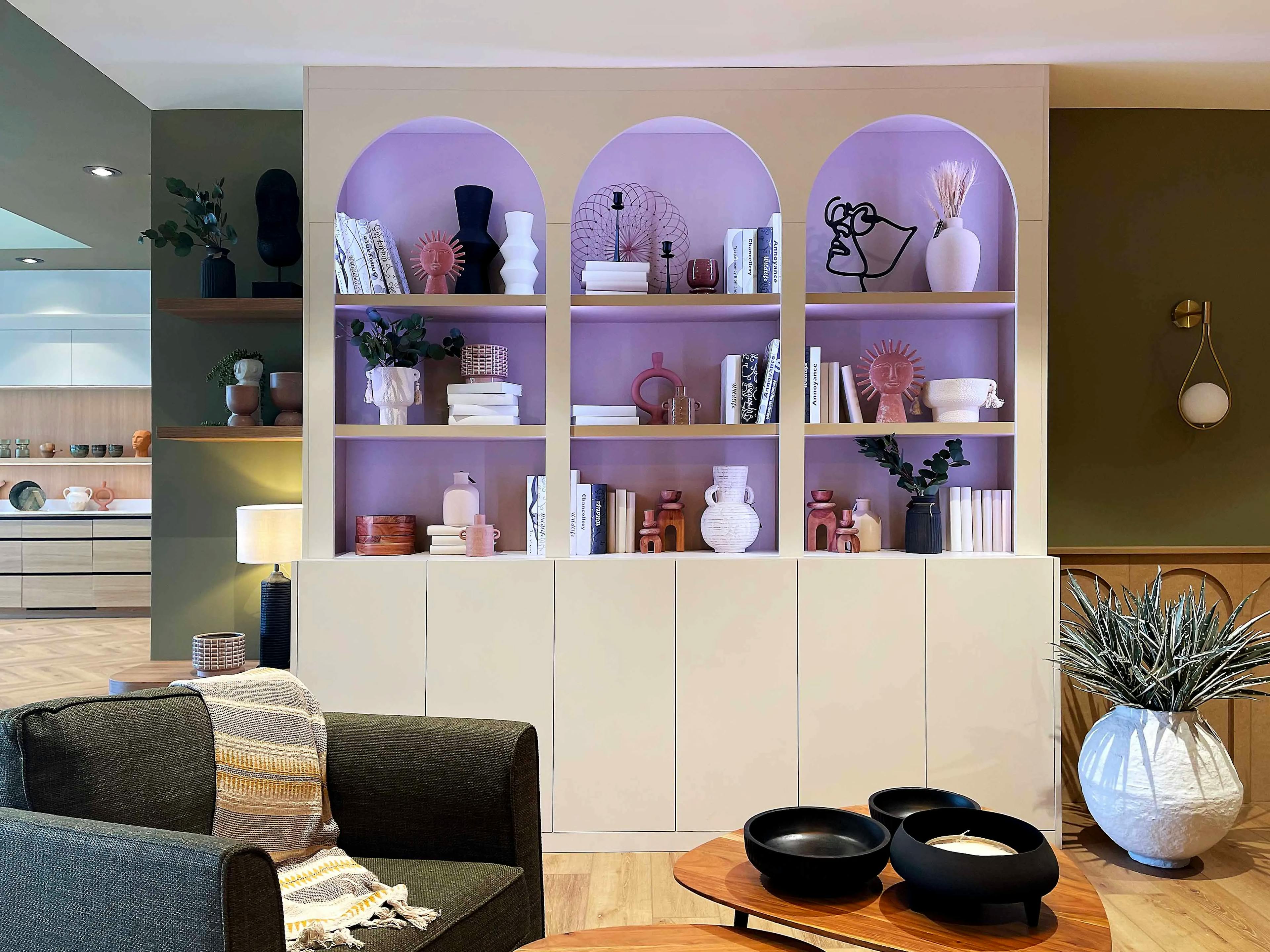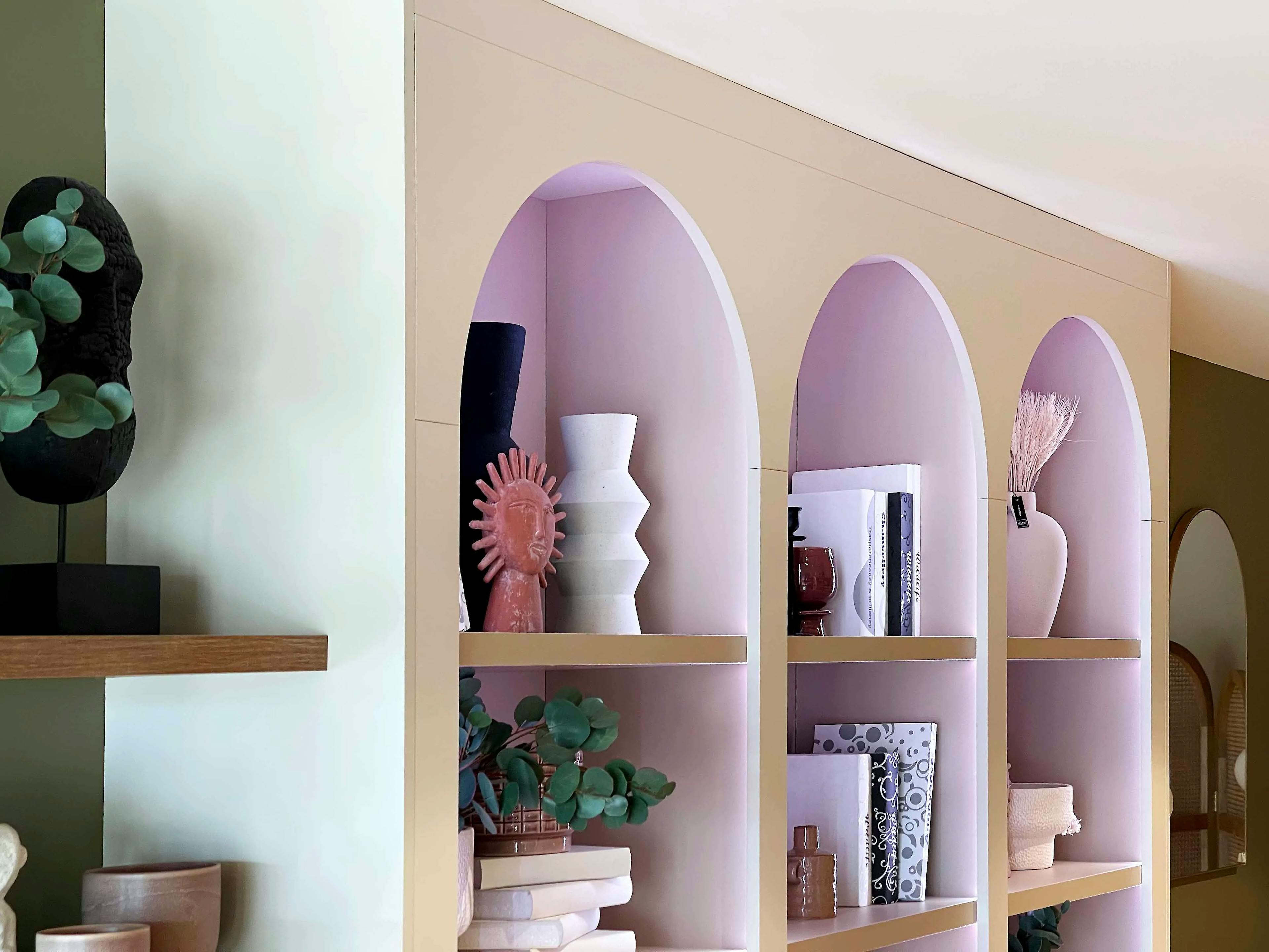 L’enjeu était de créer une bibliothèque sur mesure avec des arches qui s’intègre à l’espace tout en structurant la pièce. Un aménagement standard ne convenait pas, d’où la nécessité d’une conception adaptée aux dimensions précises du mur. Le projet réalisé associe des placards fermés intégrés en partie basse pour dissimuler le stockage et des niches ouvertes rétroéclairées en haut pour apporter une touche décorative et chaleureuse. La finition en peinture claire rehaussée par l’éclairage LED met en valeur les formes arrondies, tandis que les étagères en bois et le meuble cintré latéral créent un contraste élégant.