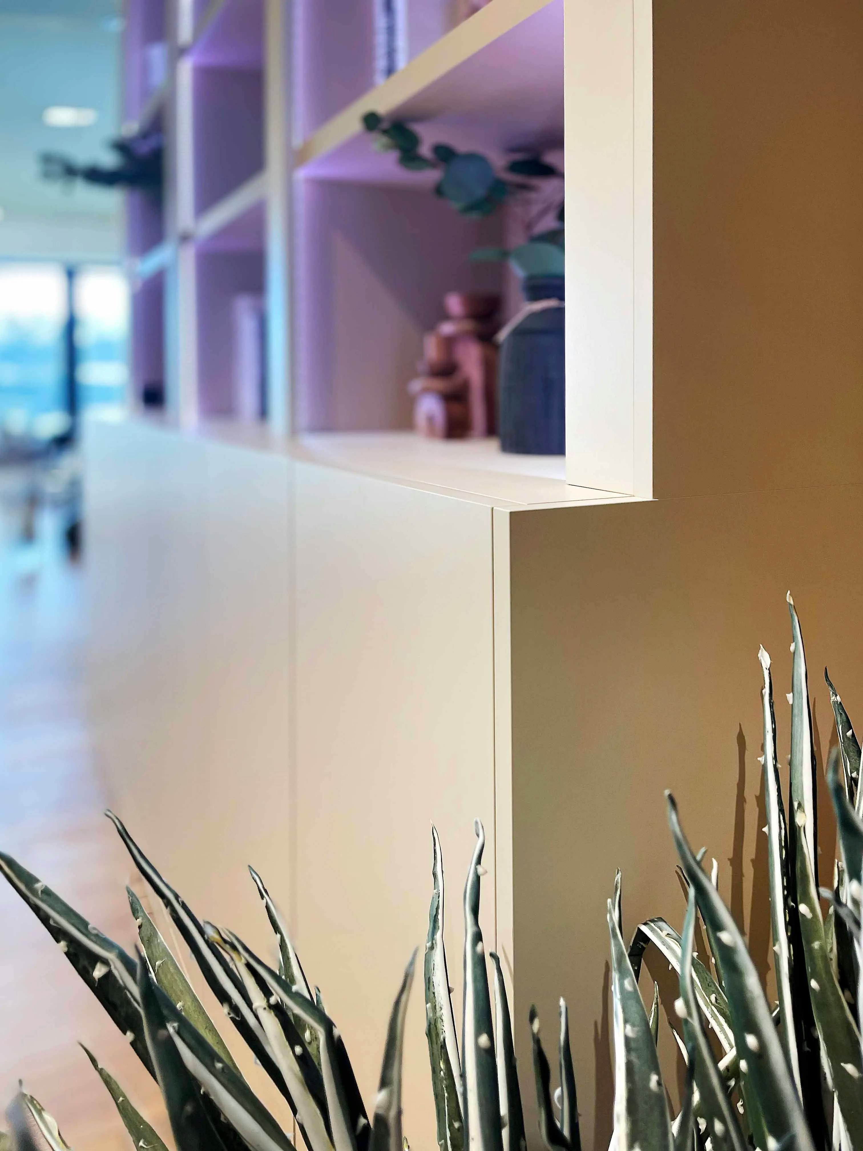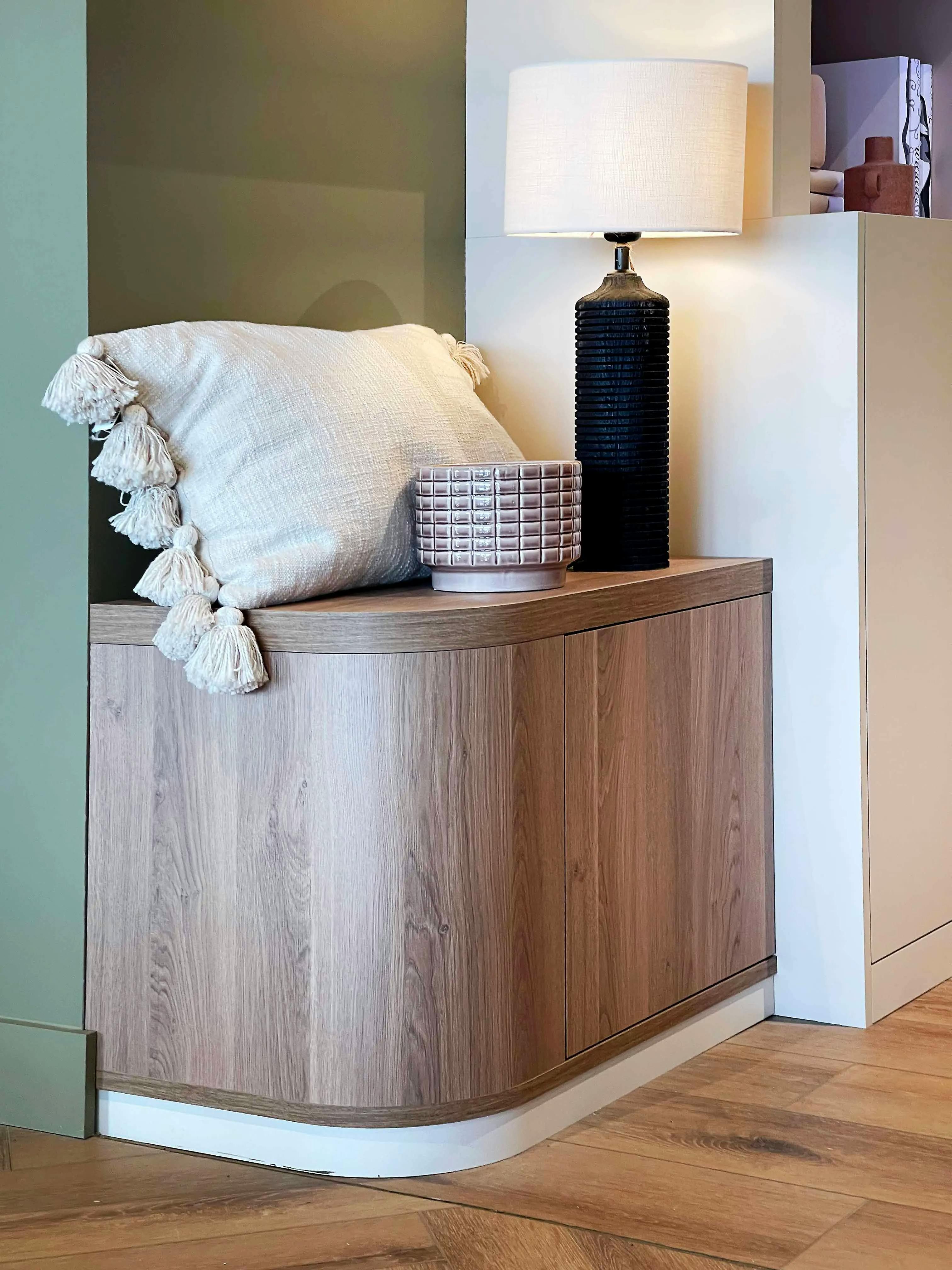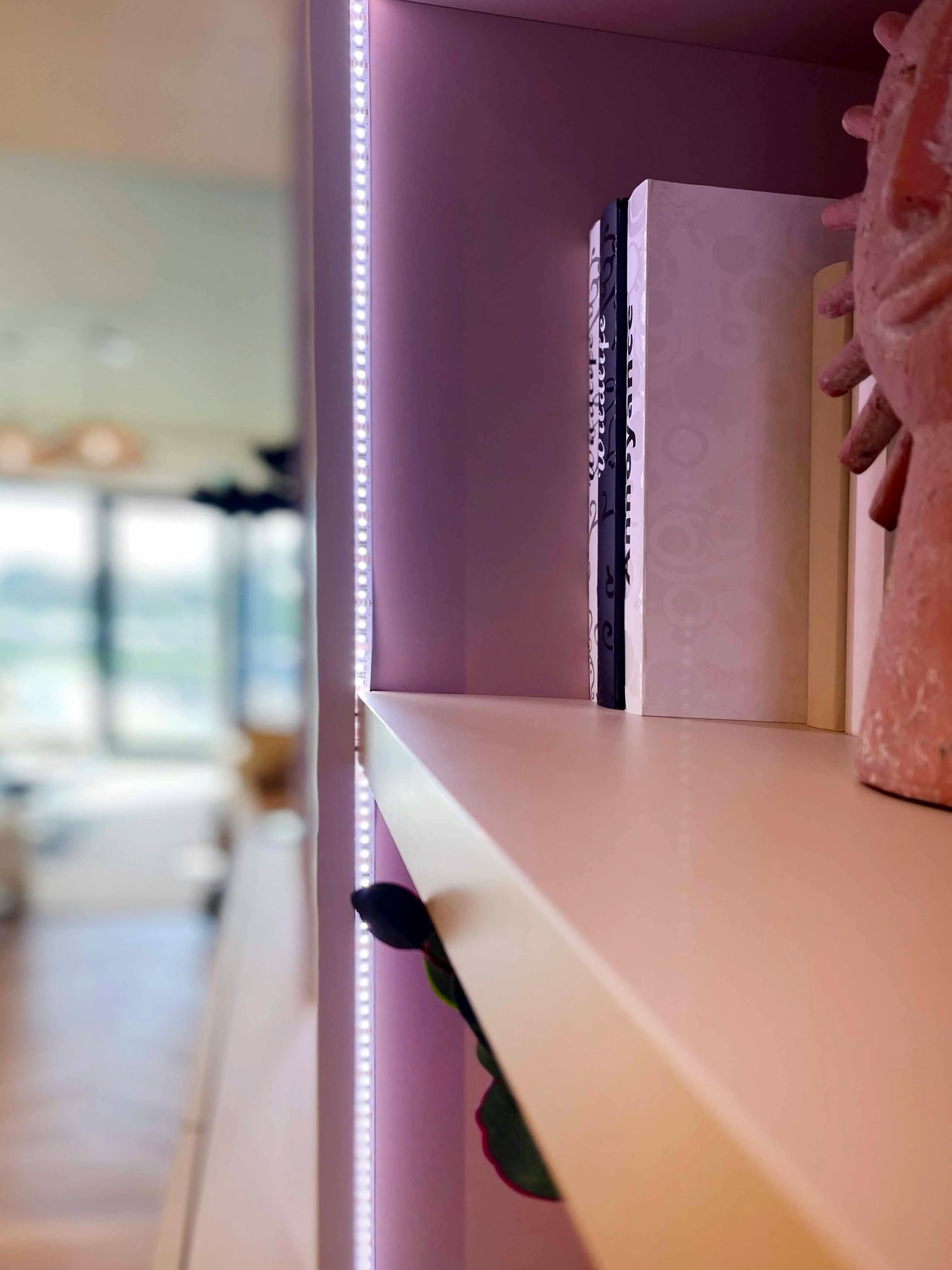 L’enjeu était de créer une bibliothèque sur mesure avec des arches qui s’intègre à l’espace tout en structurant la pièce. Un aménagement standard ne convenait pas, d’où la nécessité d’une conception adaptée aux dimensions précises du mur. Le projet réalisé associe des placards fermés intégrés en partie basse pour dissimuler le stockage et des niches ouvertes rétroéclairées en haut pour apporter une touche décorative et chaleureuse. La finition en peinture claire rehaussée par l’éclairage LED met en valeur les formes arrondies, tandis que les étagères en bois et le meuble cintré latéral créent un contraste élégant.