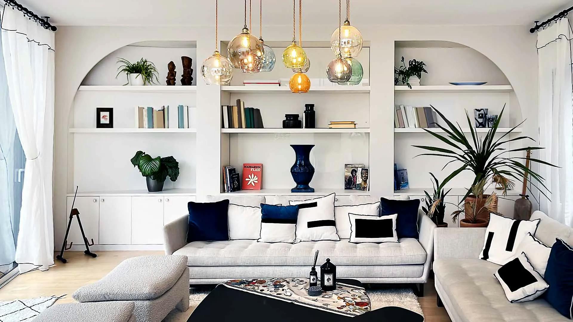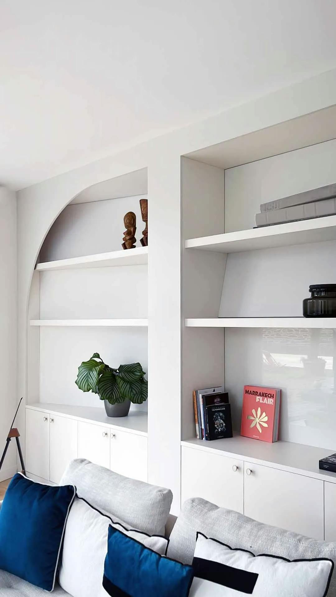 Le sur-mesure était indispensable pour exploiter toute la largeur du mur et structurer l’espace sans alourdir la pièce. Nous avons conçu une bibliothèque avec arches combinant des étagères ouvertes pour exposer des objets décoratifs et des placards intégrés en partie basse pour un rangement optimisé. Les détails importants résident dans les niches arrondies qui apportent une touche architecturale et équilibrent l’ensemble. Le blanc accentue la luminosité et crée une continuité visuelle avec le reste du salon. Une conception pensée pour mettre en valeur les éléments décoratifs tout en conservant une solution de rangement fonctionnel et esthétique.