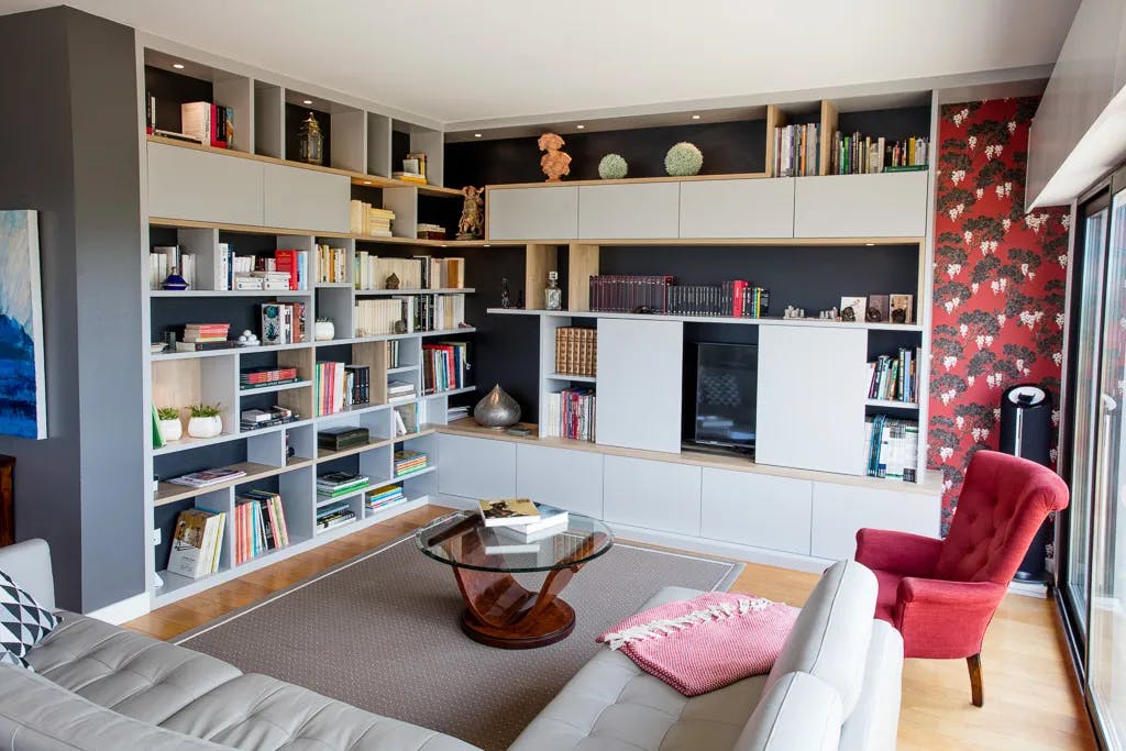 Leur besoin était de créer un aménagement structurant leur salon tout en maximisant le rangement sans alourdir la pièce. L’ajout d’une banquette intégrée avec des tiroirs permet non seulement d’offrir un coin détente confortable, mais aussi d’exploiter intelligemment l’espace sous l’assise pour du rangement discret. L’éclairage intégré dans certaines niches met en valeur les objets décoratifs tout en apportant une touche chaleureuse. L’ensemble, entièrement conçu en blanc pour se fondre dans l’architecture, confère une sensation d’espace et de légèreté. Ce projet répond ainsi à leur volonté de combiner design épuré et solutions pratiques adaptées à leur quotidien.