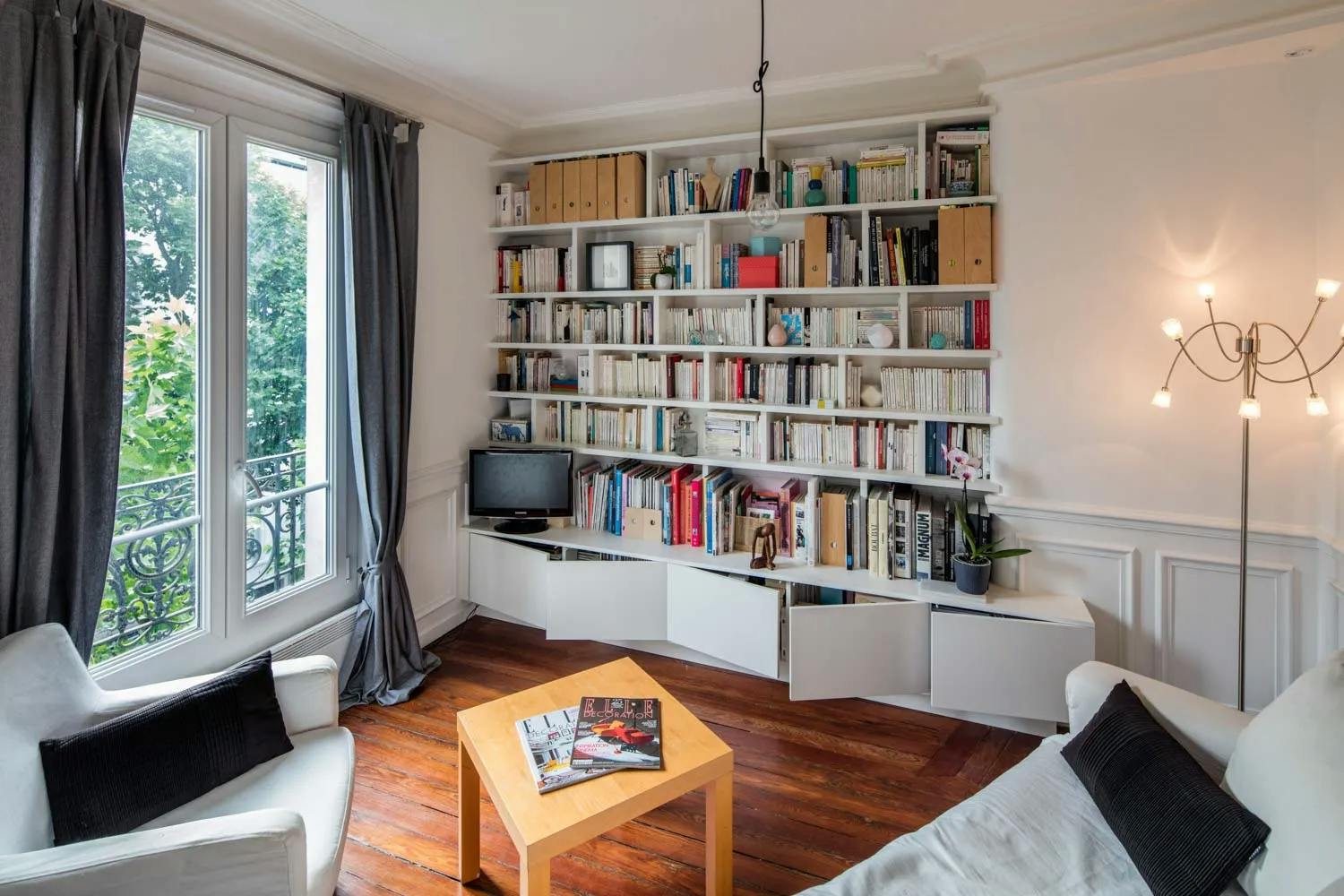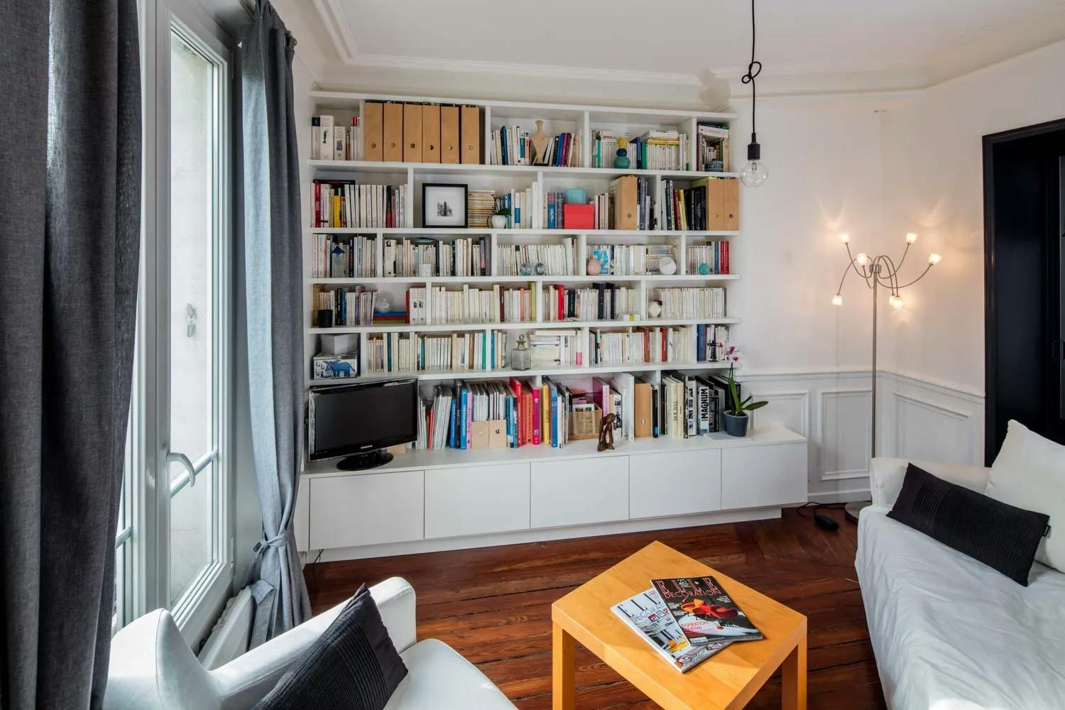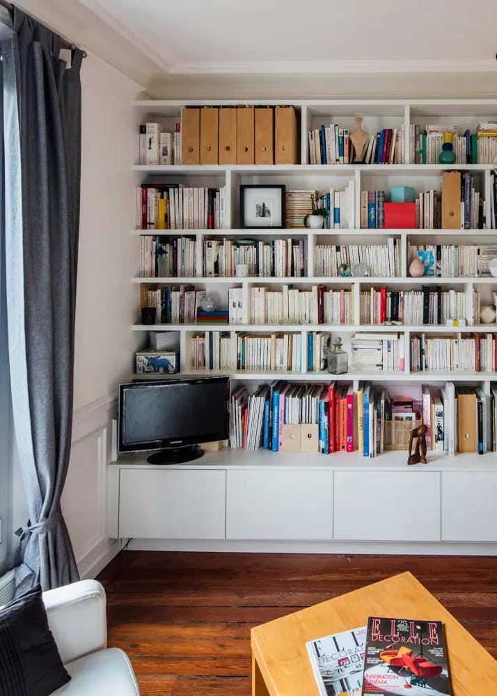 L’objectif était d’exploiter toute la hauteur afin d’offrir un espace fonctionnel capable d’accueillir une grande collection de livres, tout en intégrant discrètement un meuble TV. Un agencement personnalisé a permis de combiner des étagères ouvertes modulables, des rangements bas fermés pour dissimuler certains éléments et de petites niches pour exposer des objets décoratifs. La structure en blanc mat se fond harmonieusement dans l’architecture classique de la pièce, créant un contraste subtil avec le parquet en bois chaleureux. L’ensemble allie praticité et esthétisme, tout en s’adaptant parfaitement à l’espace de vie.