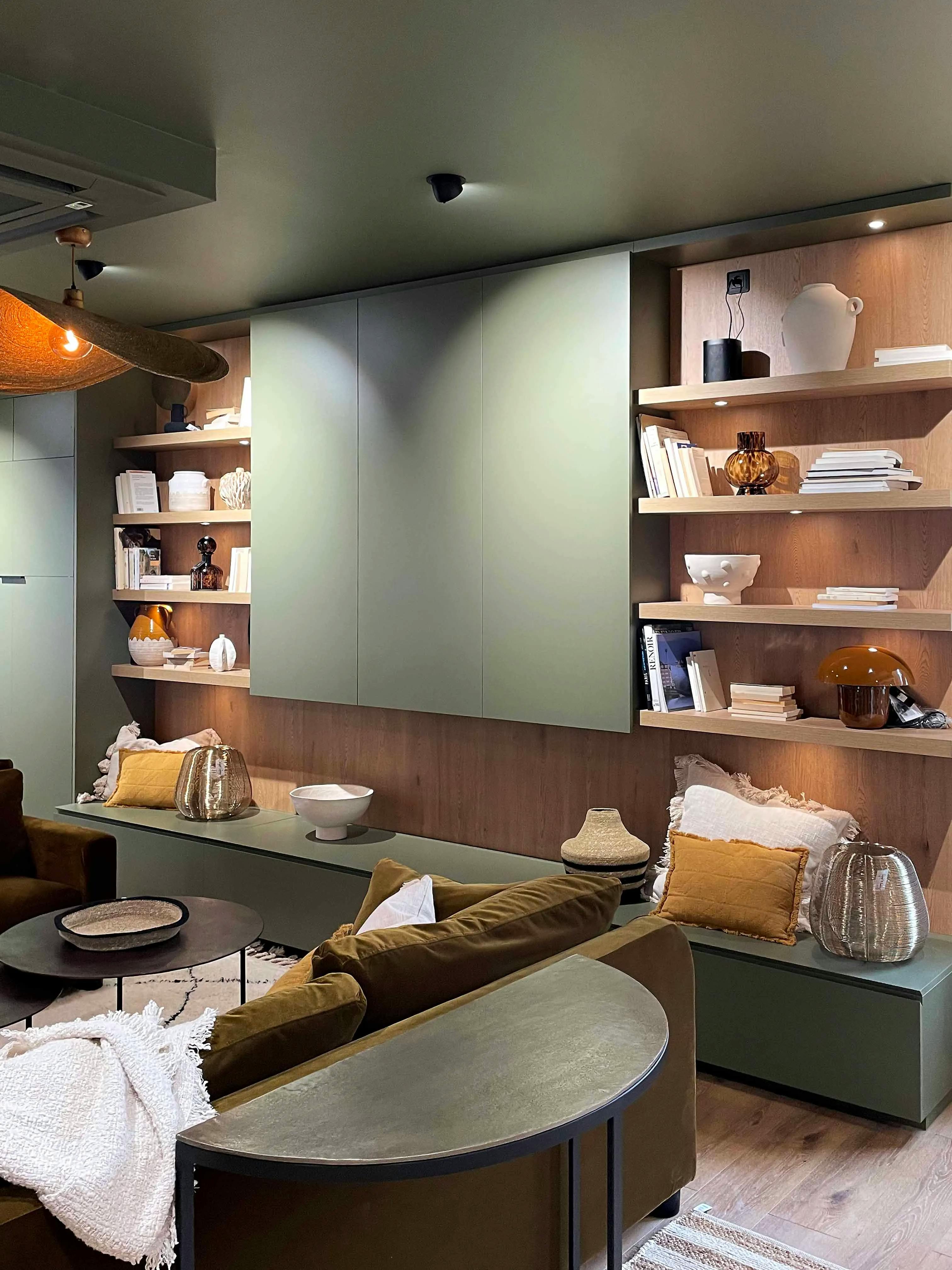 Nous devions exploiter efficacement un espace salon atypique tout en ajoutant des solutions de rangement esthétiques. La réponse a été un aménagement mural sur mesure, combinant des étagères ouvertes et des espaces fermés pour un équilibre parfait entre rangement et décoration. La conception se distingue par des niches rétroéclairées et des caissons de rangement avec des façades biseautées. Le choix des finitions bois et des tons verts crée une atmosphère chaleureuse et naturelle. Le client est ravi de ce résultat, transformant son salon en un lieu convivial et organisé.