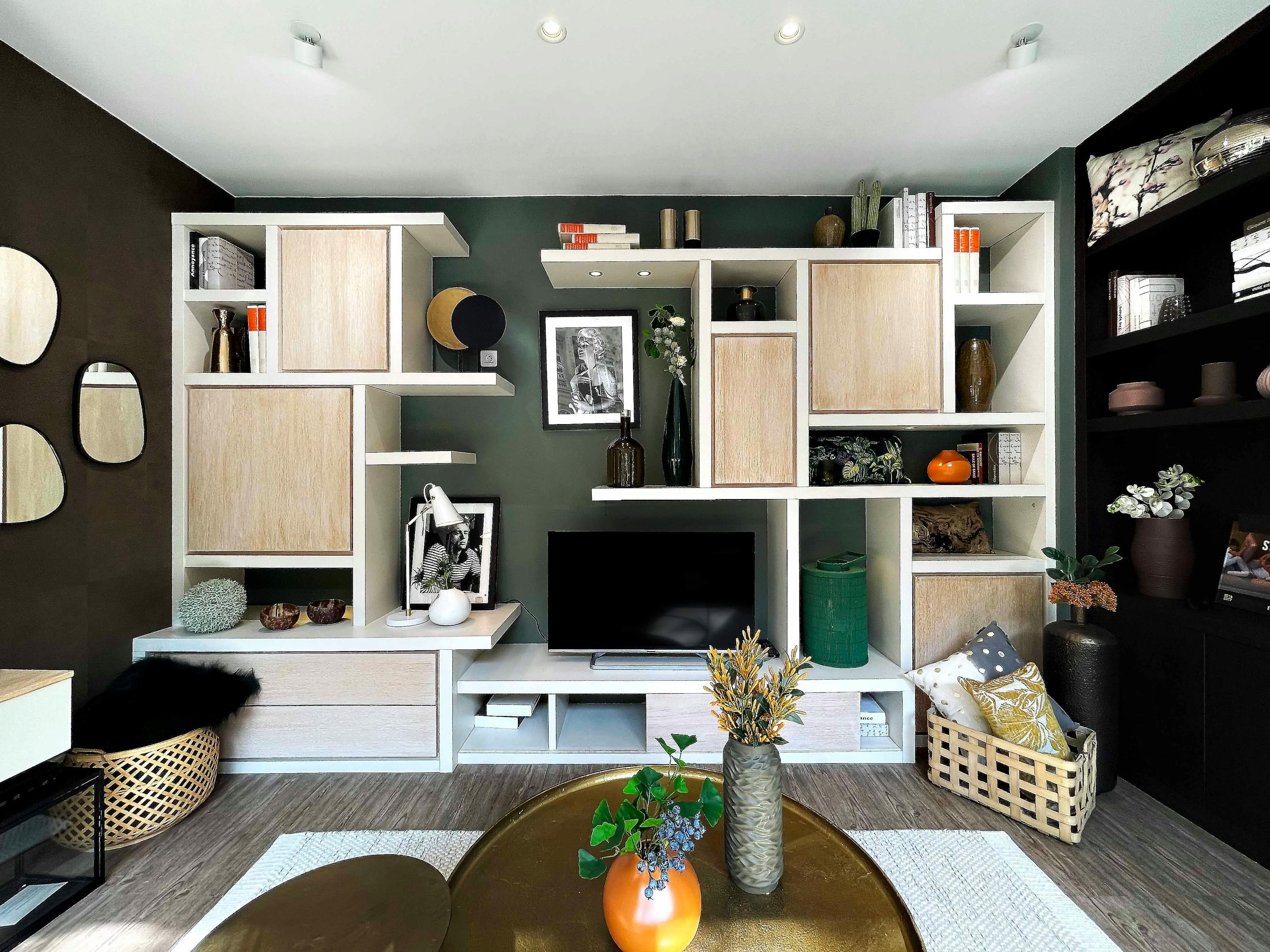 L’objectif était de créer une composition équilibrée qui allie fonctionnalité et design, sans alourdir visuellement la pièce. Le sur-mesure était indispensable pour adapter les volumes et intégrer une alternance de placards fermés, niches ouvertes et étagères déstructurées. La solution adoptée comprend un meuble TV central, des espaces de rangement asymétriques, ainsi que des éléments suspendus qui apportent de la légèreté à l’ensemble. L’association du bois clair et du blanc sur un fond vert profond crée un contraste élégant, tandis que les objets décoratifs et l’éclairage intégré viennent sublimer ce mobilier moderne et fonctionnel.