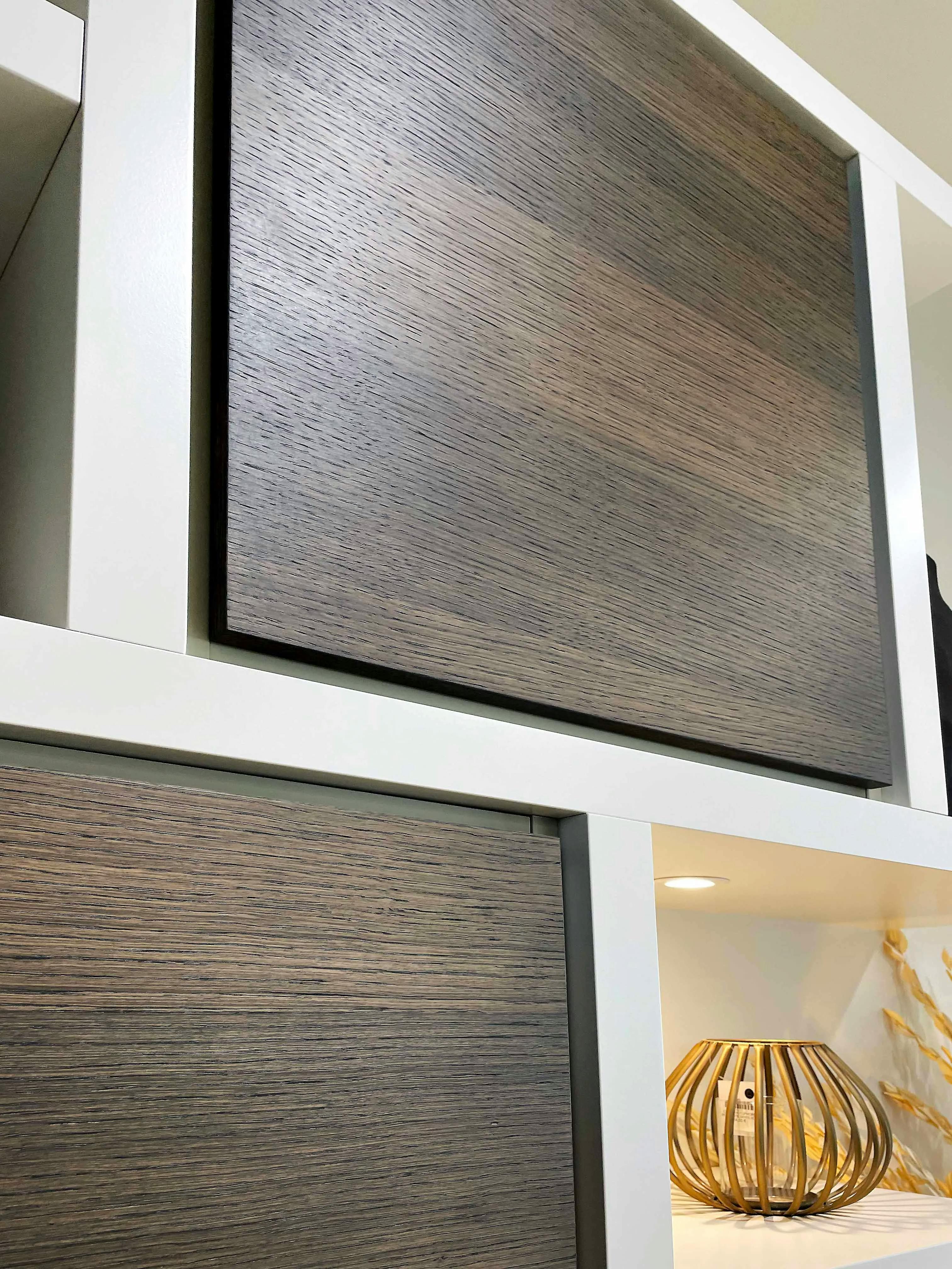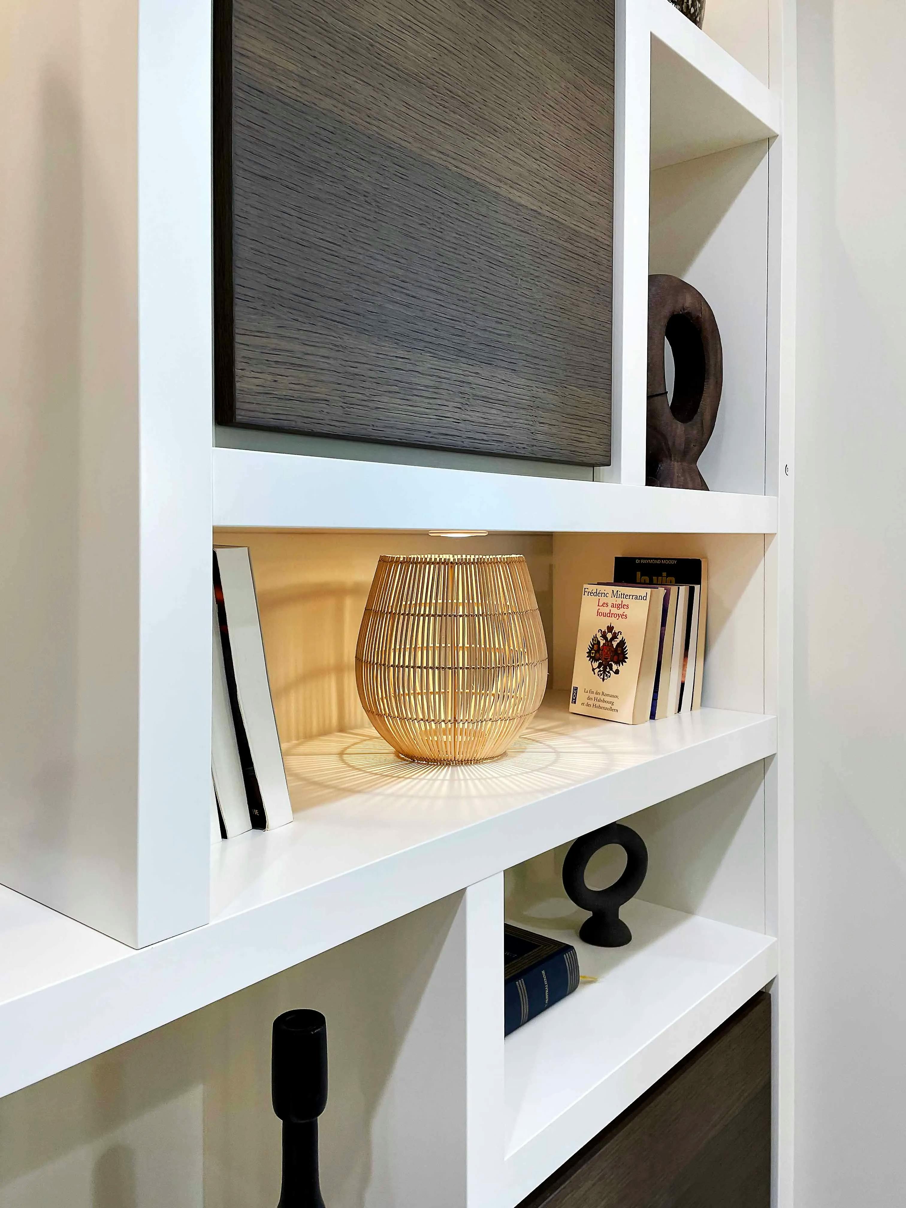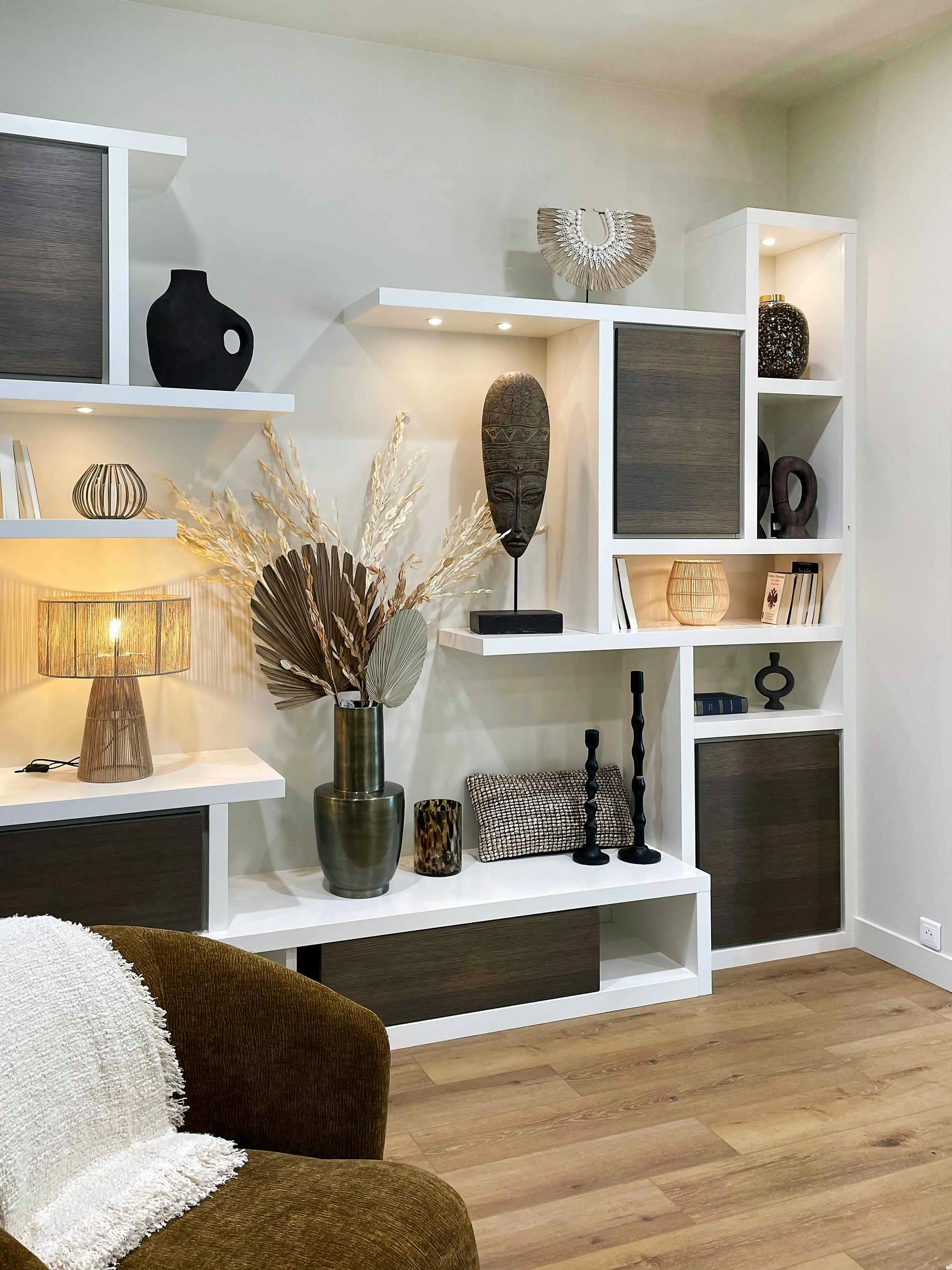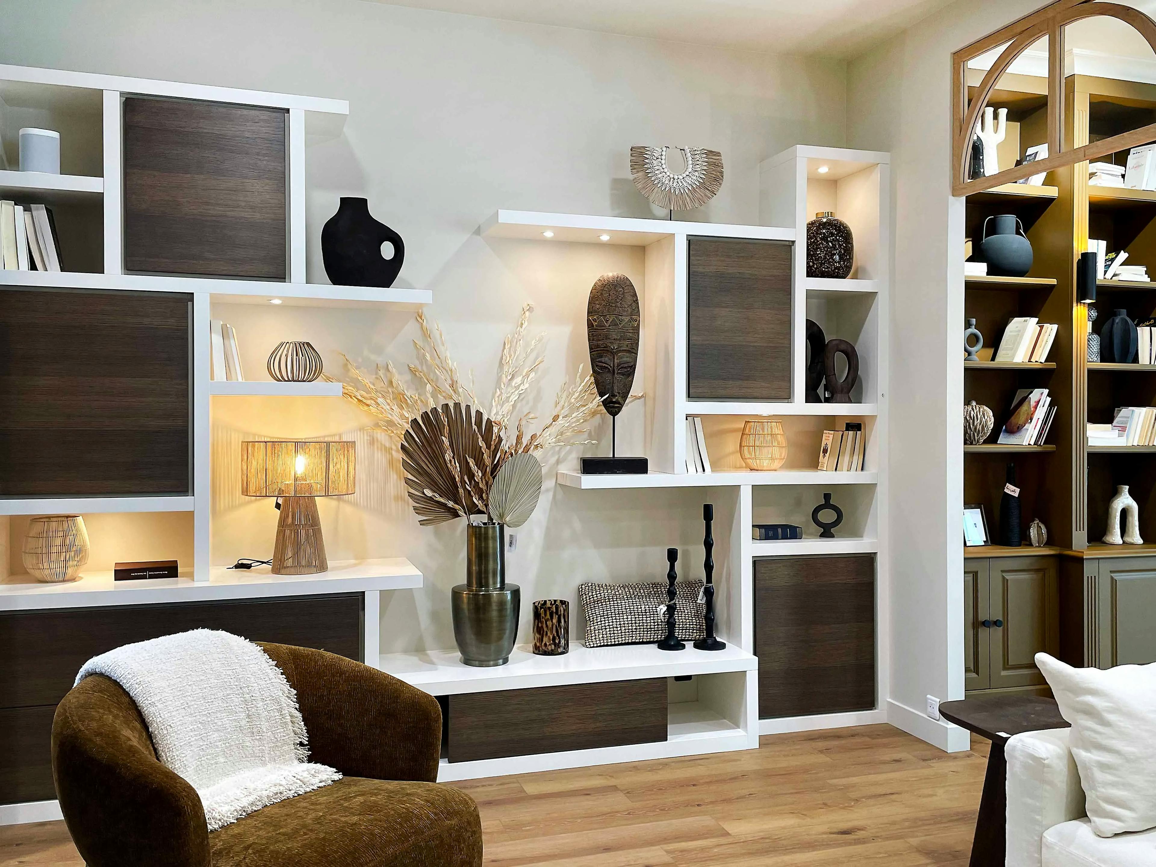 L’aménagement devait s’adapter au mur disponible tout en créant une harmonie avec le reste du mobilier. Il fallait concevoir une structure asymétrique permettant de ranger tout en valorisant les objets décoratifs. Le sur-mesure a permis d’optimiser chaque volume et d’intégrer des niches de différentes tailles pour une composition équilibrée.