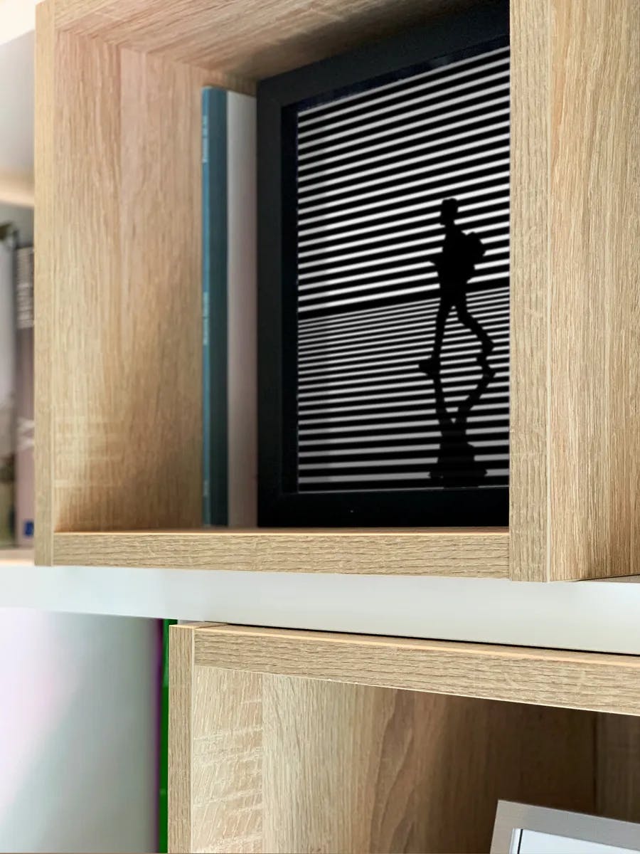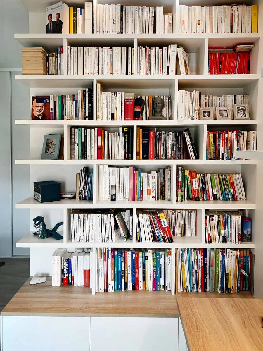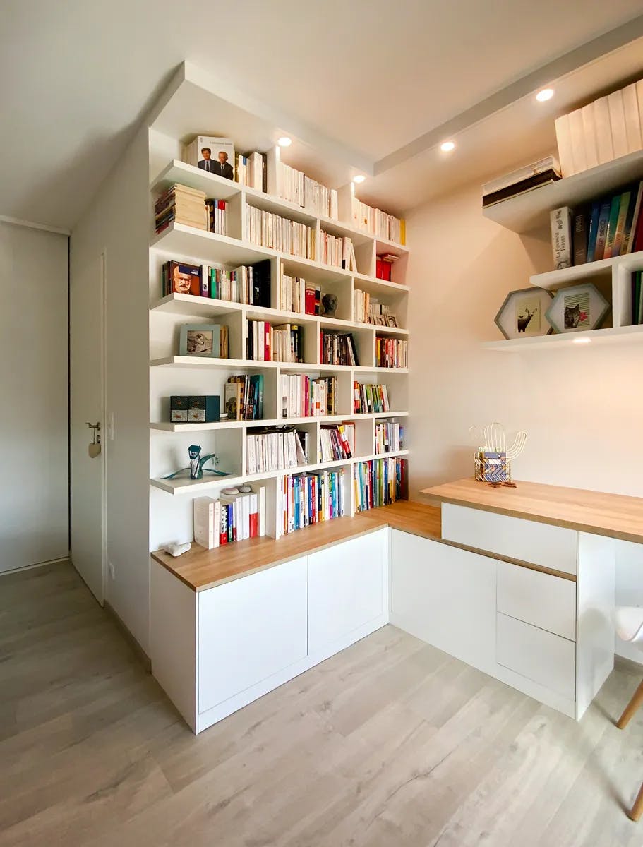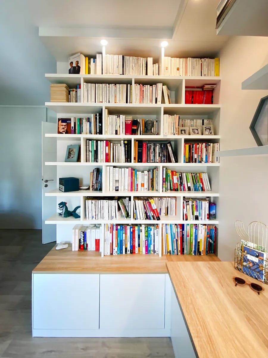 L’enjeu principal était d’intégrer ces éléments sans surcharger l’espace et en tenant compte de la configuration de la pièce, notamment la présence d’une fenêtre et d’un radiateur. Le sur-mesure était essentiel pour adapter les rangements aux contraintes architecturales et offrir une ergonomie parfaite. La solution mise en place comprend un bureau intégré avec des espaces de rangement fermés et ouverts, ainsi qu’une bibliothèque en hauteur pour maximiser le stockage sans encombrer l’espace de travail. Le choix des finitions associe des façades blanches à un plan de travail en bois clair, apportant luminosité et chaleur, tandis que les niches décoratives ajoutent une touche personnalisée.