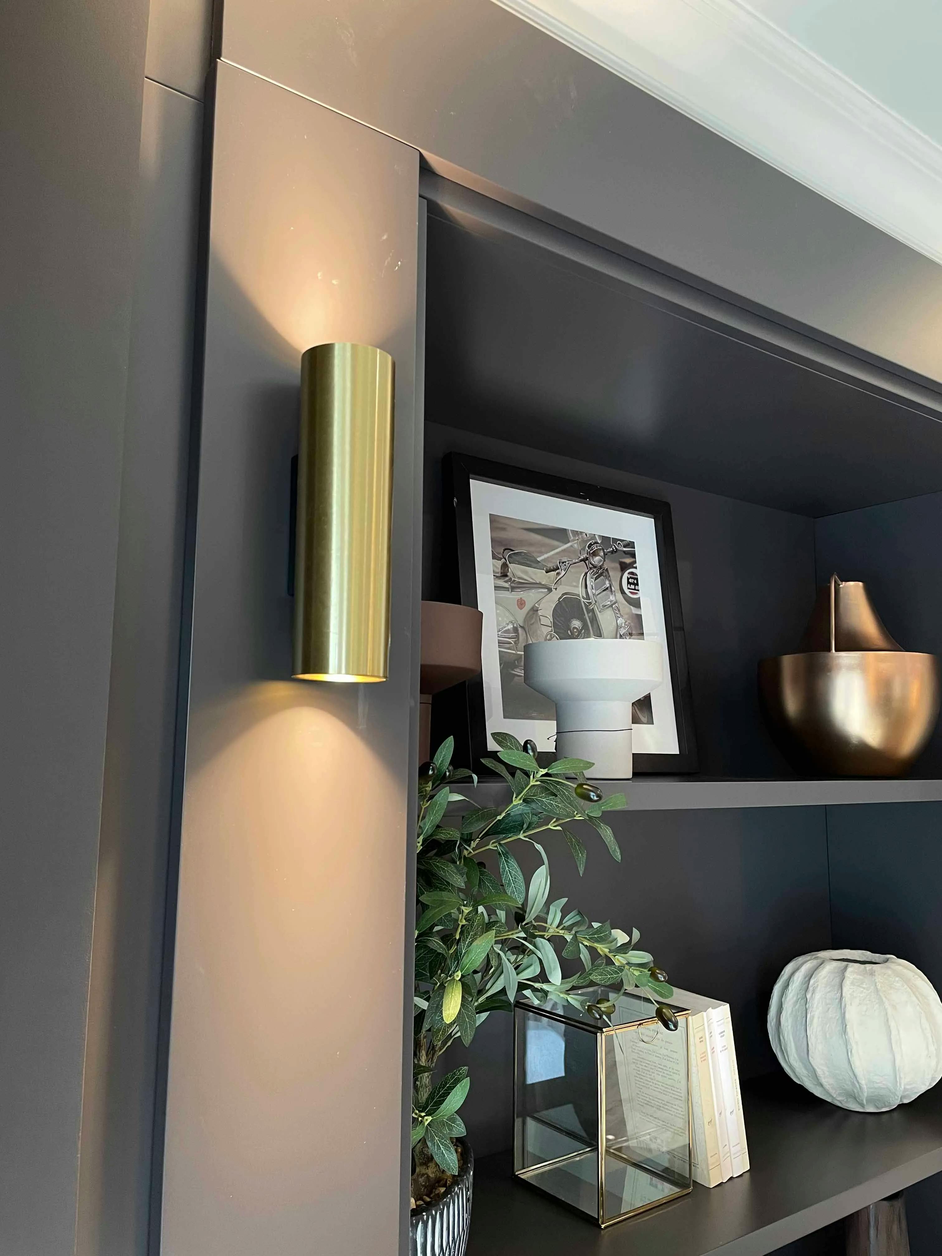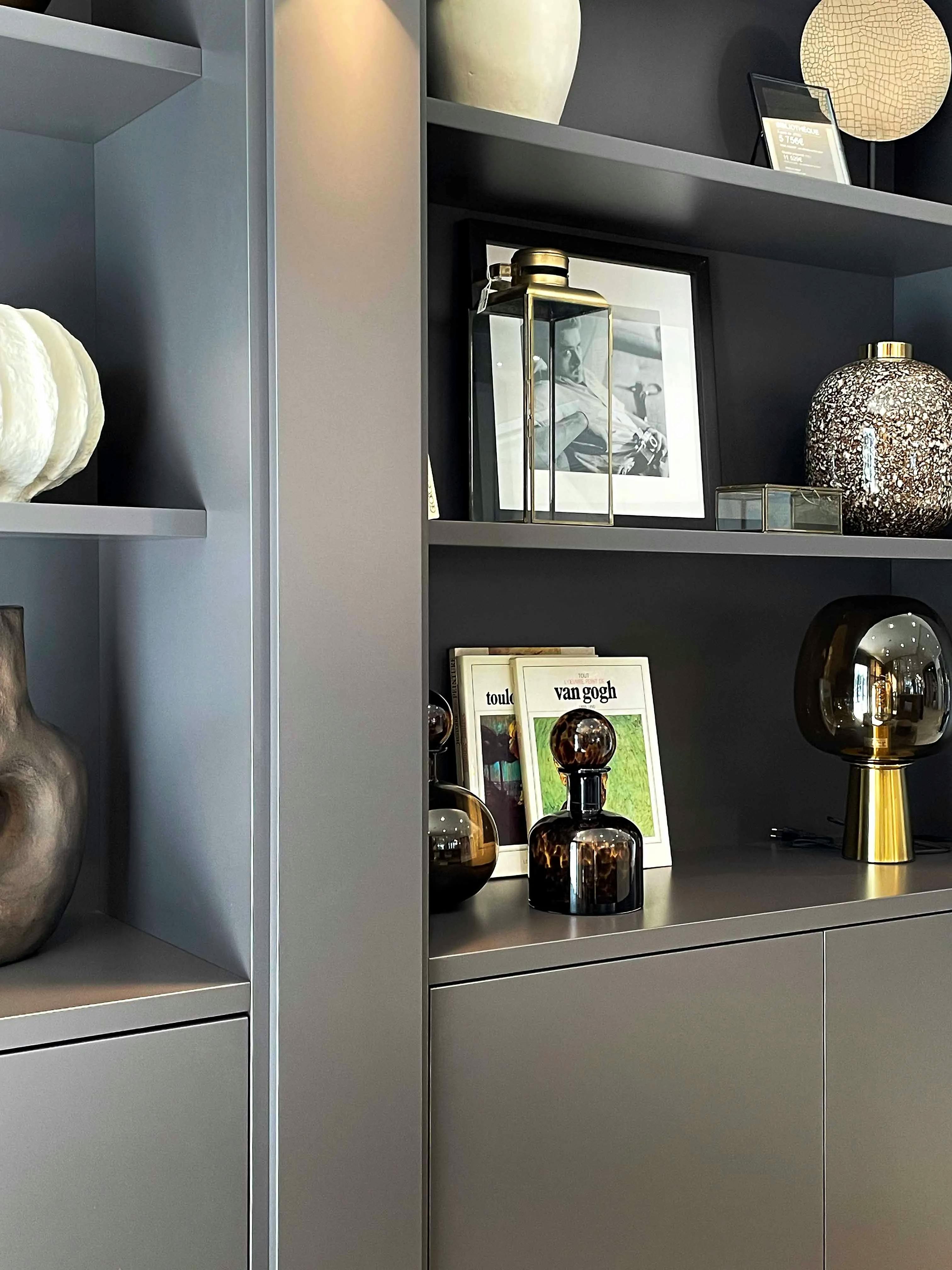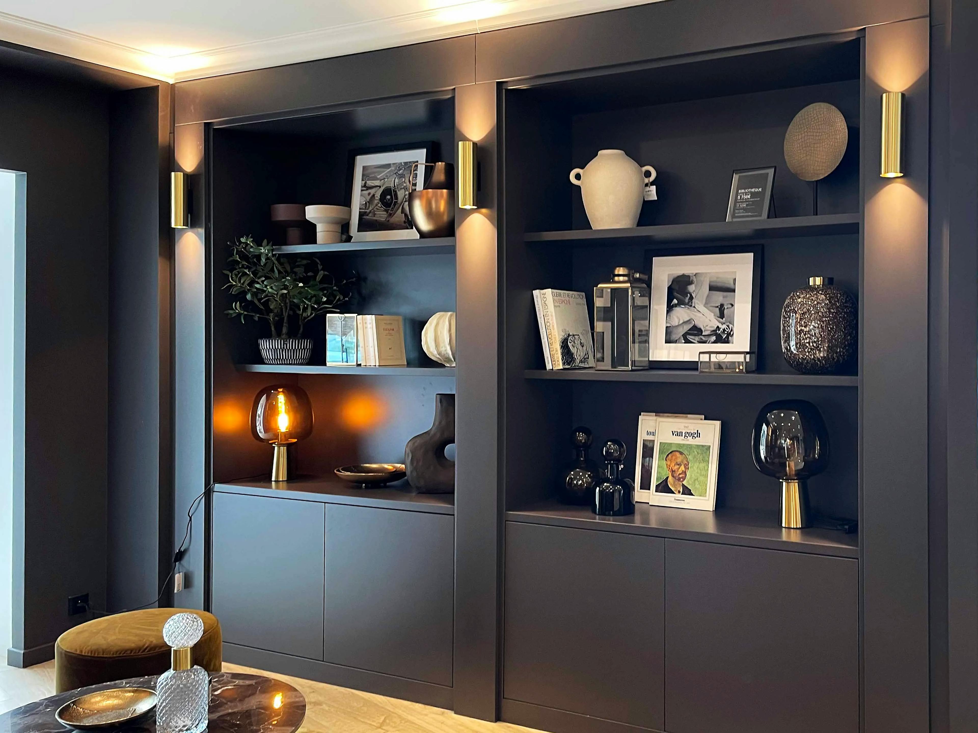 Ce mur nécessitait un aménagement structurant pour devenir un véritable élément de décoration tout en restant fonctionnel. Le sur-mesure a permis d’exploiter la hauteur sous plafond et d’ajuster chaque module aux dimensions spécifiques de l’espace. La solution adoptée propose un équilibre entre rangement fermé et étagères ouvertes, offrant à la fois praticité et mise en valeur des objets. L’éclairage subtil intégré, la symétrie des niches et la qualité des finitions sont les points forts de cette réalisation. Le choix de la laque foncée mat apporte une élégance intemporelle qui contraste harmonieusement avec les matériaux clairs environnants. Les appliques dorées et les objets décoratifs ajoutent chaleur et modernité.