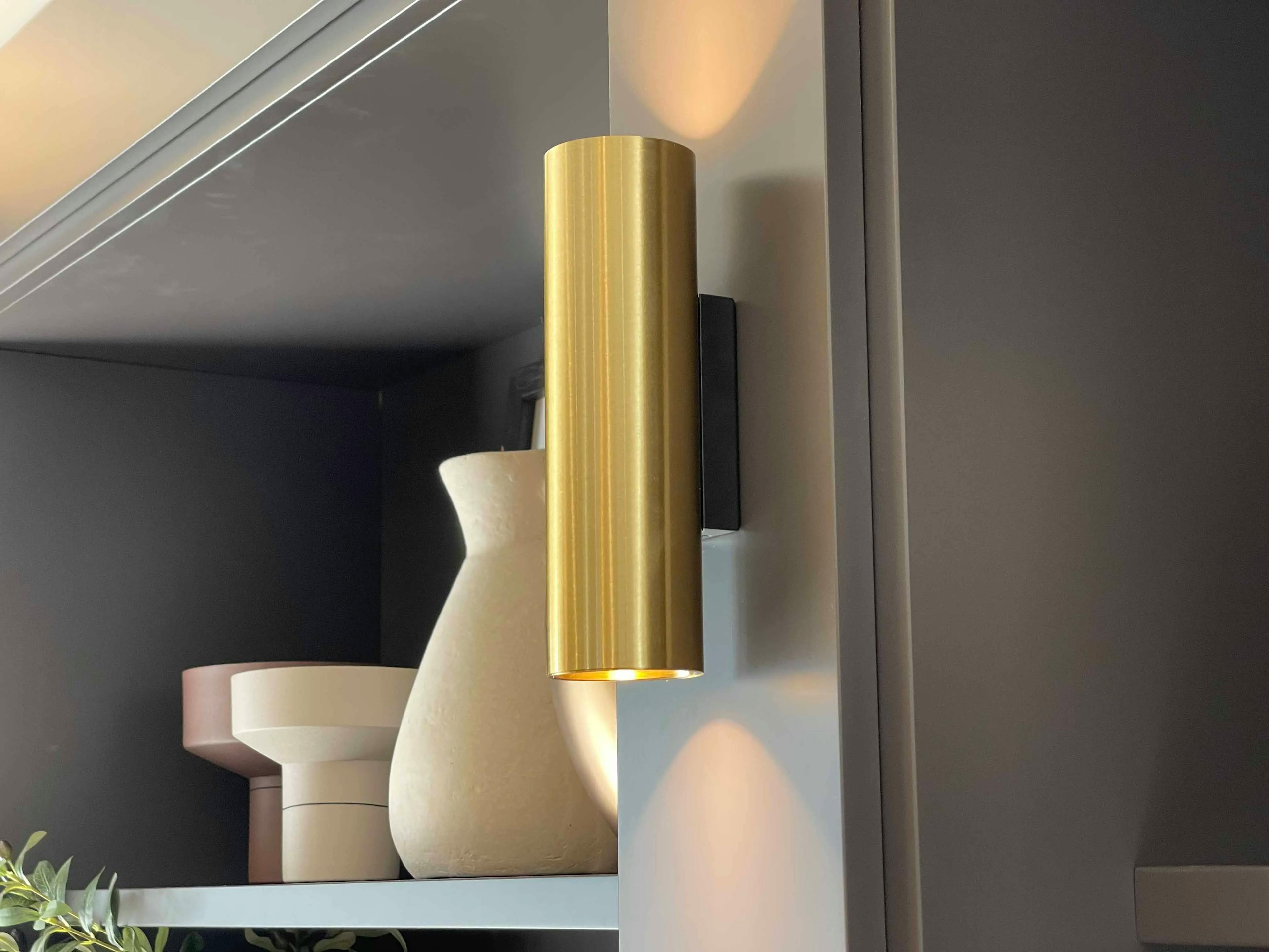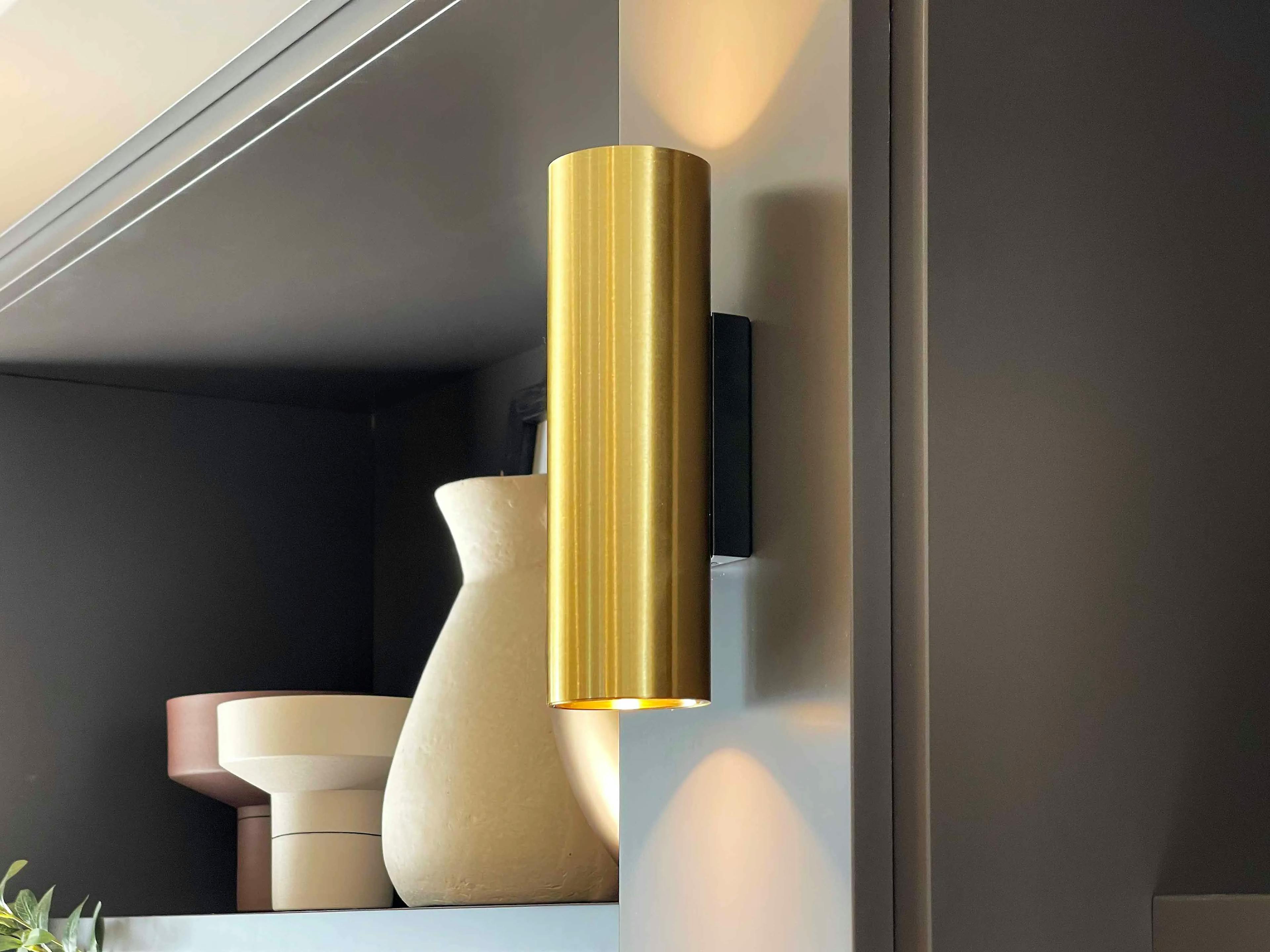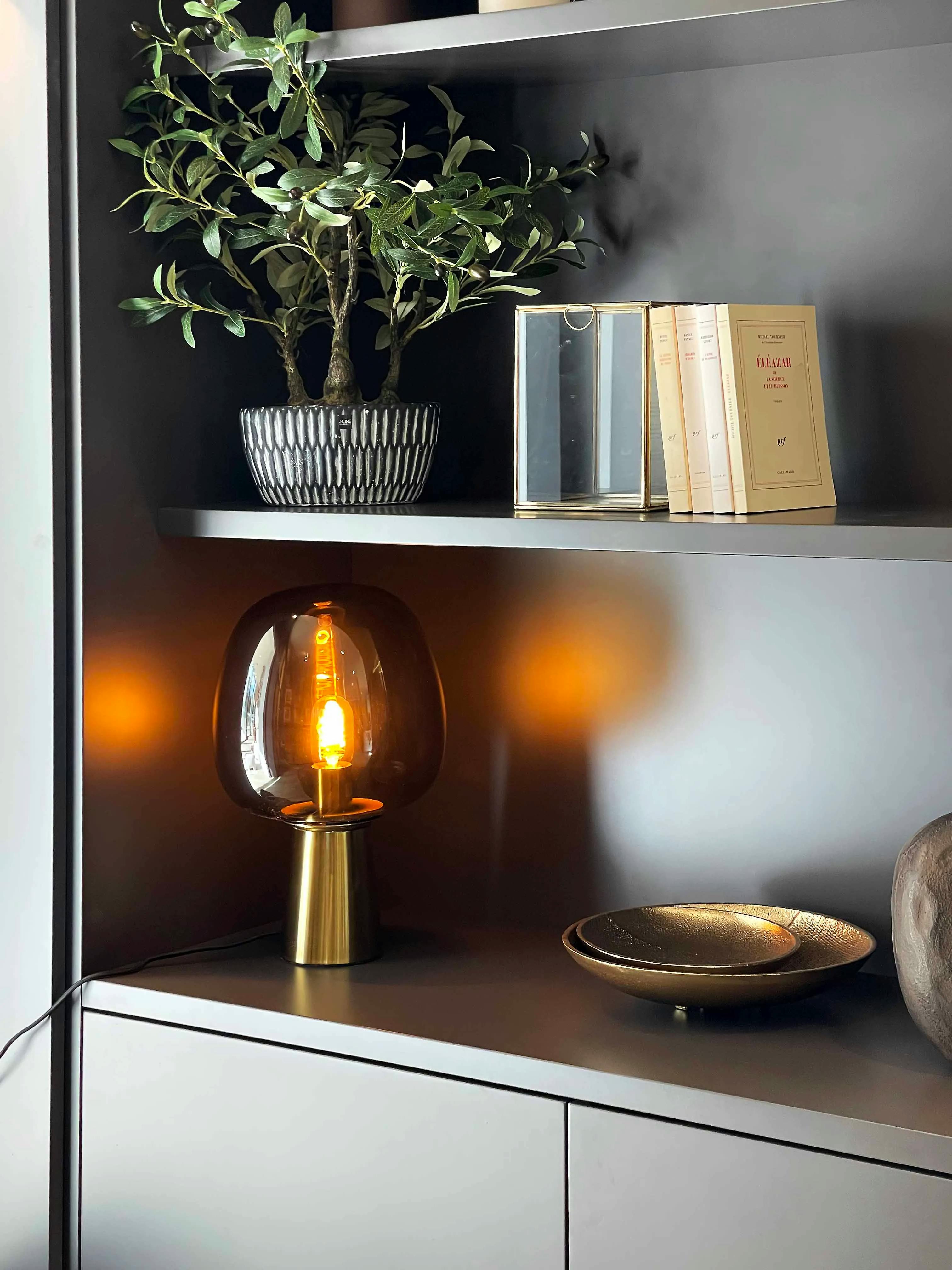 Ce mur nécessitait un aménagement structurant pour devenir un véritable élément de décoration tout en restant fonctionnel. Le sur-mesure a permis d’exploiter la hauteur sous plafond et d’ajuster chaque module aux dimensions spécifiques de l’espace. La solution adoptée propose un équilibre entre rangement fermé et étagères ouvertes, offrant à la fois praticité et mise en valeur des objets. L’éclairage subtil intégré, la symétrie des niches et la qualité des finitions sont les points forts de cette réalisation. Le choix de la laque foncée mat apporte une élégance intemporelle qui contraste harmonieusement avec les matériaux clairs environnants. Les appliques dorées et les objets décoratifs ajoutent chaleur et modernité.