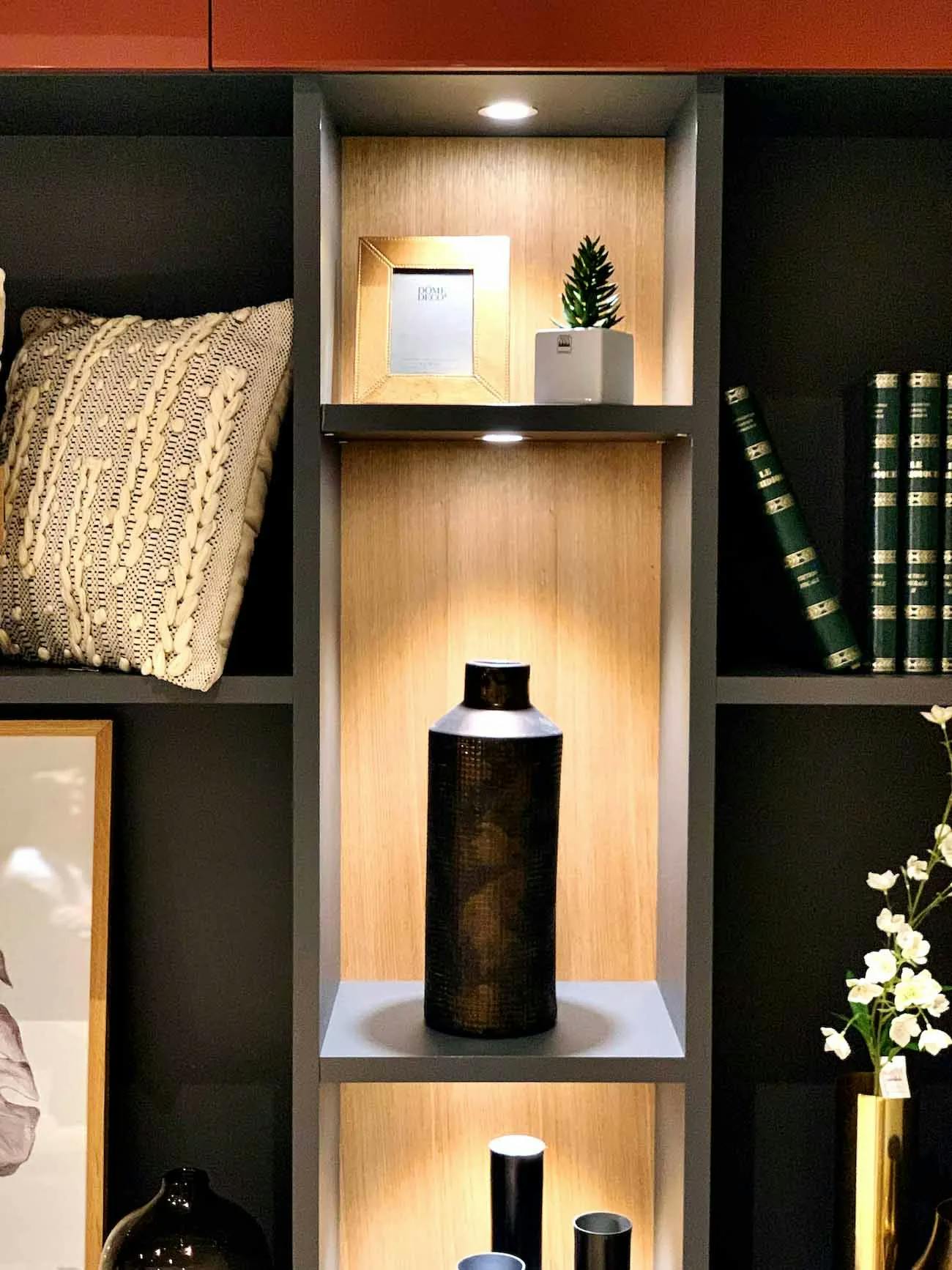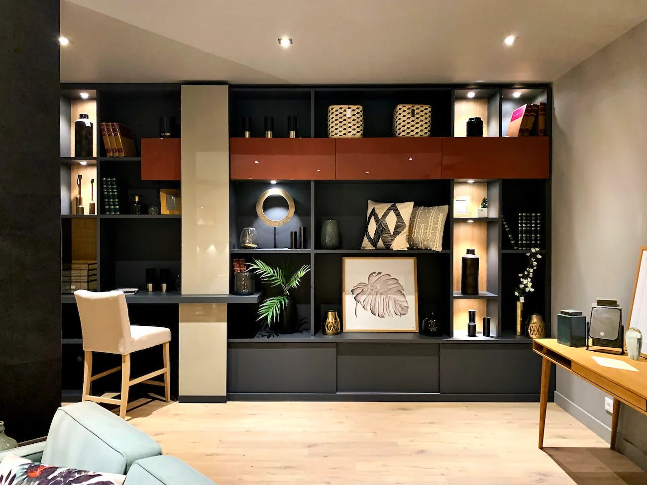 L'enjeu était de structurer cet aménagement en exploitant toute la largeur du mur tout en conservant un équilibre visuel. Une solution sur-mesure était nécessaire pour adapter les volumes et associer étagères ouvertes, placards fermés et niches décoratives de manière harmonieuse. L’aménagement final comprend un bureau intégré, des rangements suspendus avec façades contrastées, ainsi qu’un éclairage LED mettant en valeur les objets exposés. L’association du noir profond, des touches de beige brillant et des éléments en terracotta apporte une atmosphère sophistiquée et chaleureuse, soulignant le mobilier design et fonctionnel.