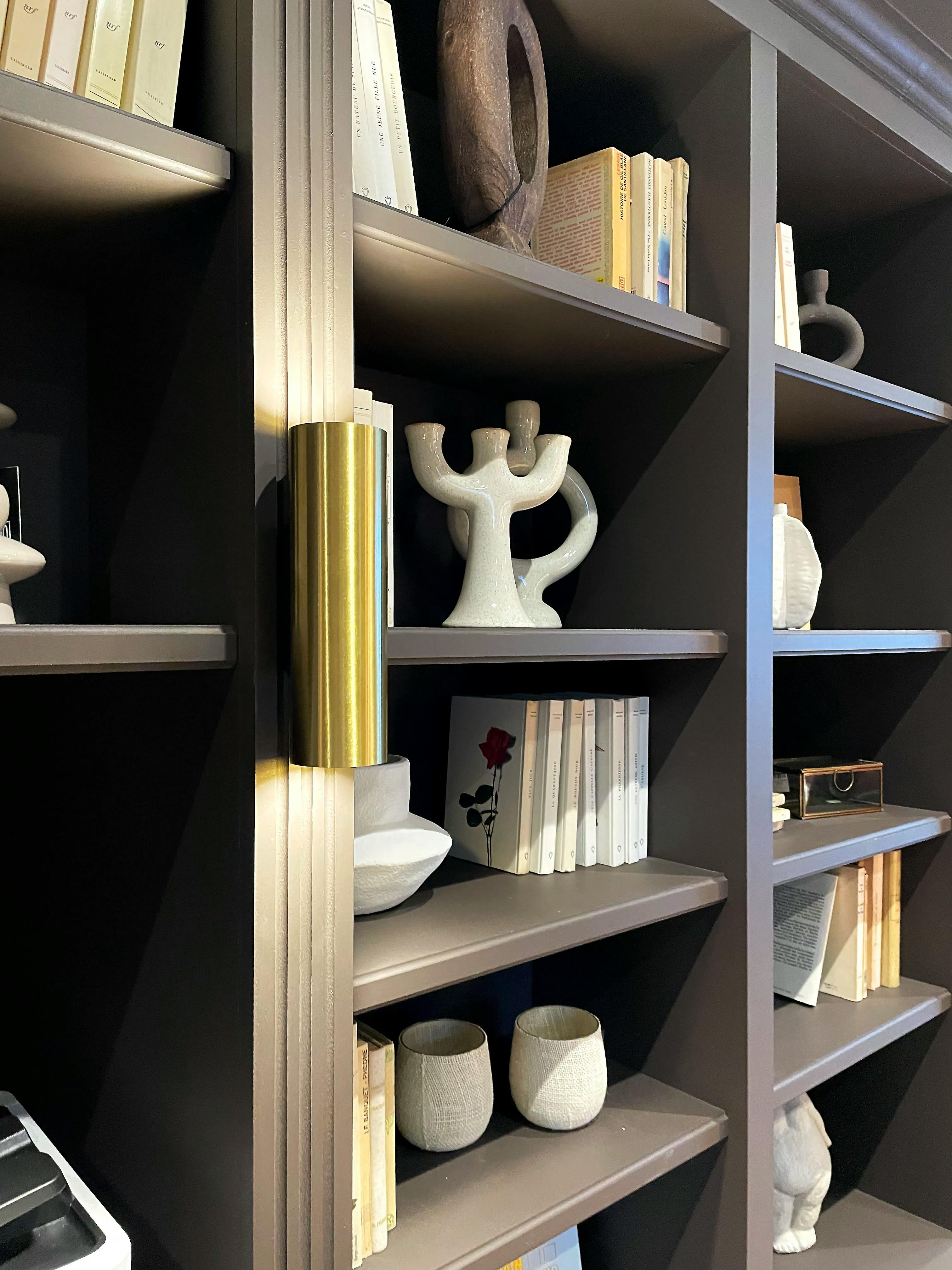 Cette bibliothèque est fabriquée intégralement en médium brut. Elle à été préparée et peinte après la pose de l'aménagement, par un peintre artisan. Il s'agit de la couleur Kombu Brun, dans le nuancier Argile Peintures.
