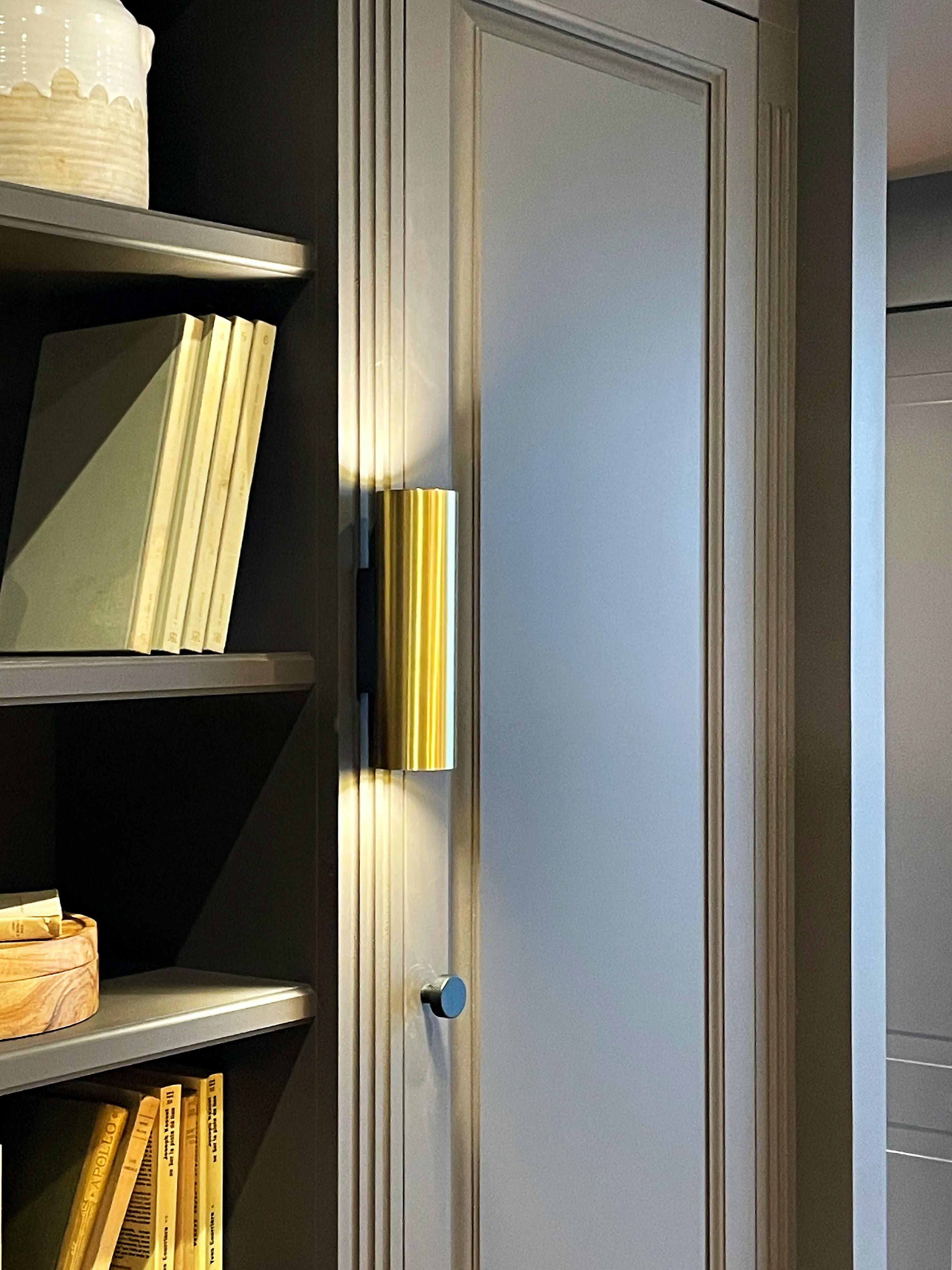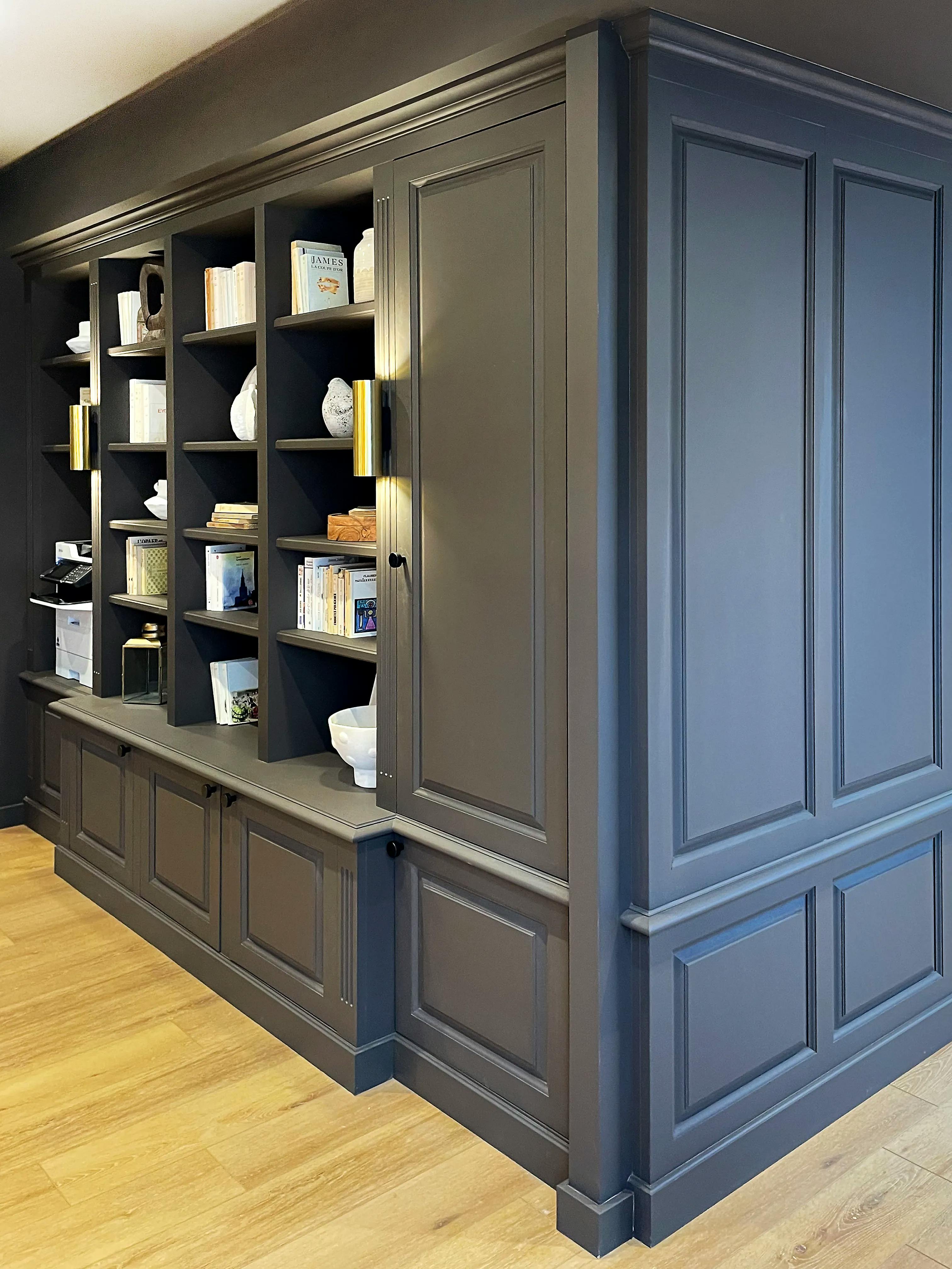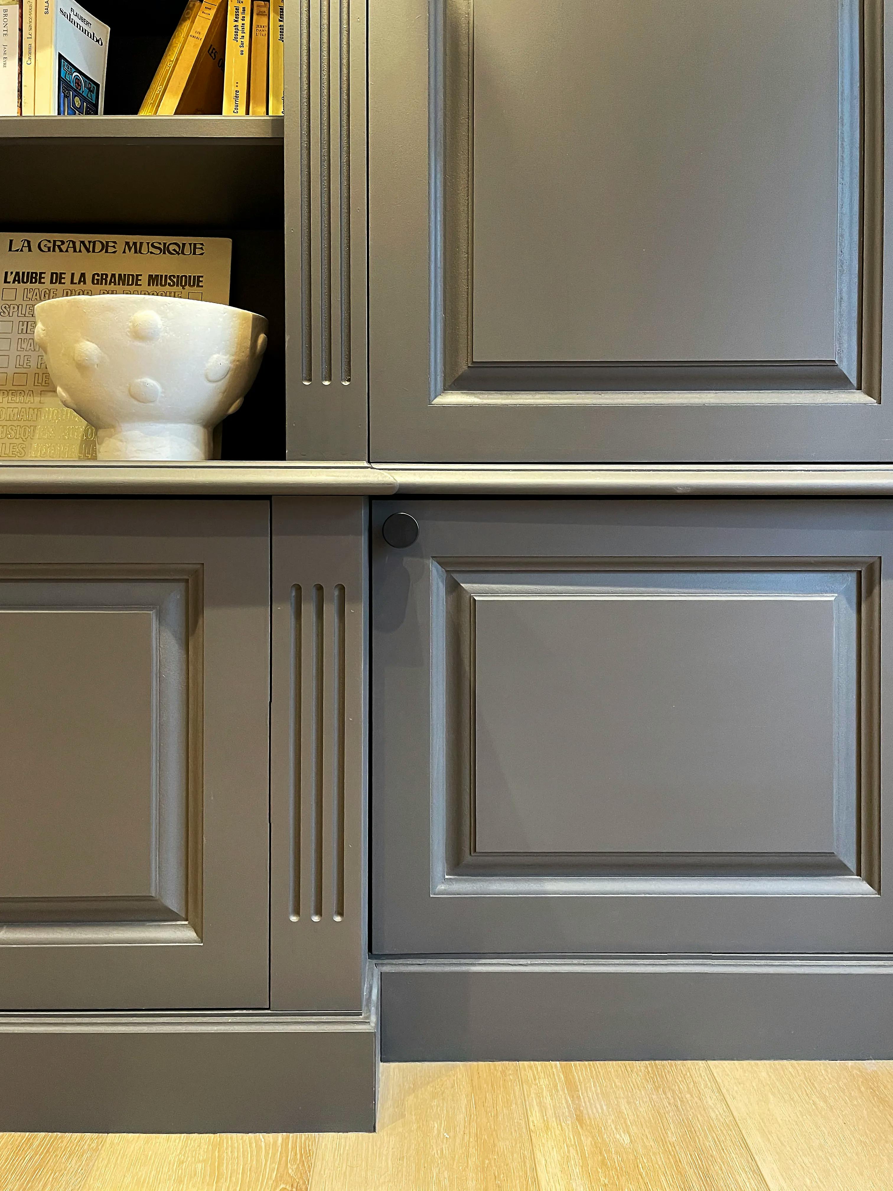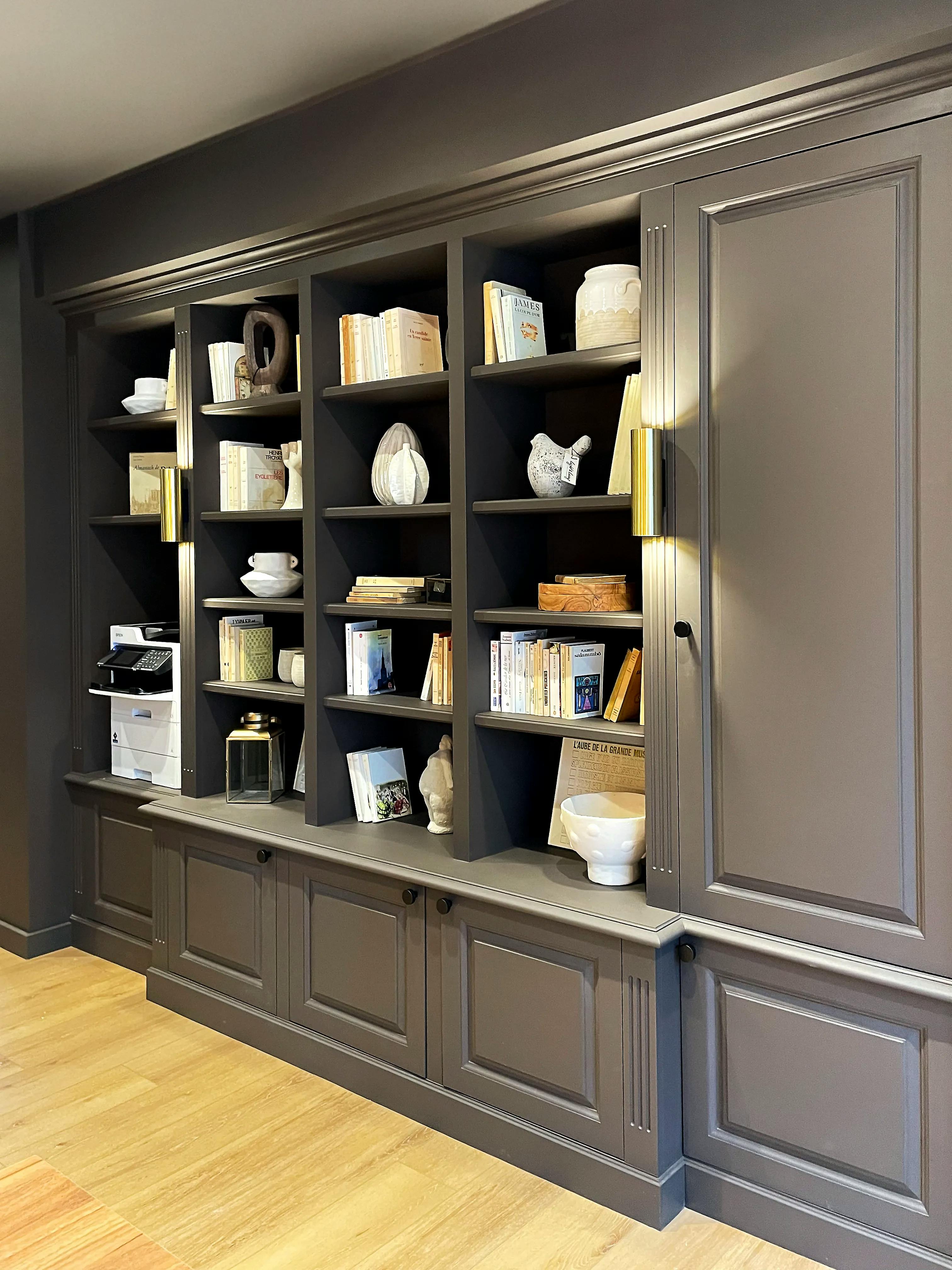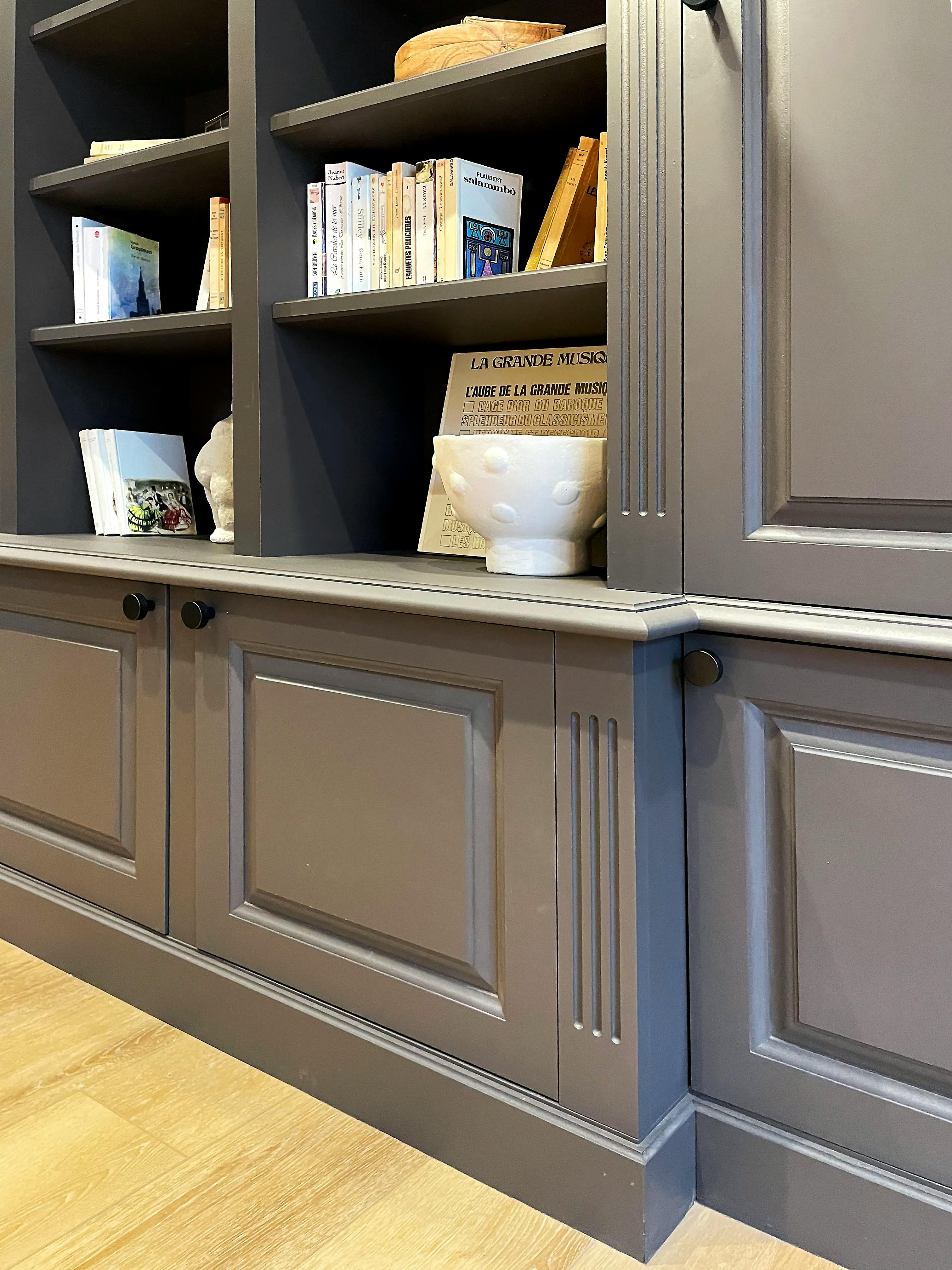 Le choix d’un coloris gris foncé donne à l’ensemble une identité forte, en accord avec le style traditionnel du lieu. Les portes à cadre mouluré, les corniches en haut du meuble et les plinthes travaillées renforcent ce caractère classique. Chaque détail, du positionnement de l’éclairage intégré aux poignées discrètes, a été pensé pour allier praticité et raffinement dans cette solution de rangement personnalisée.