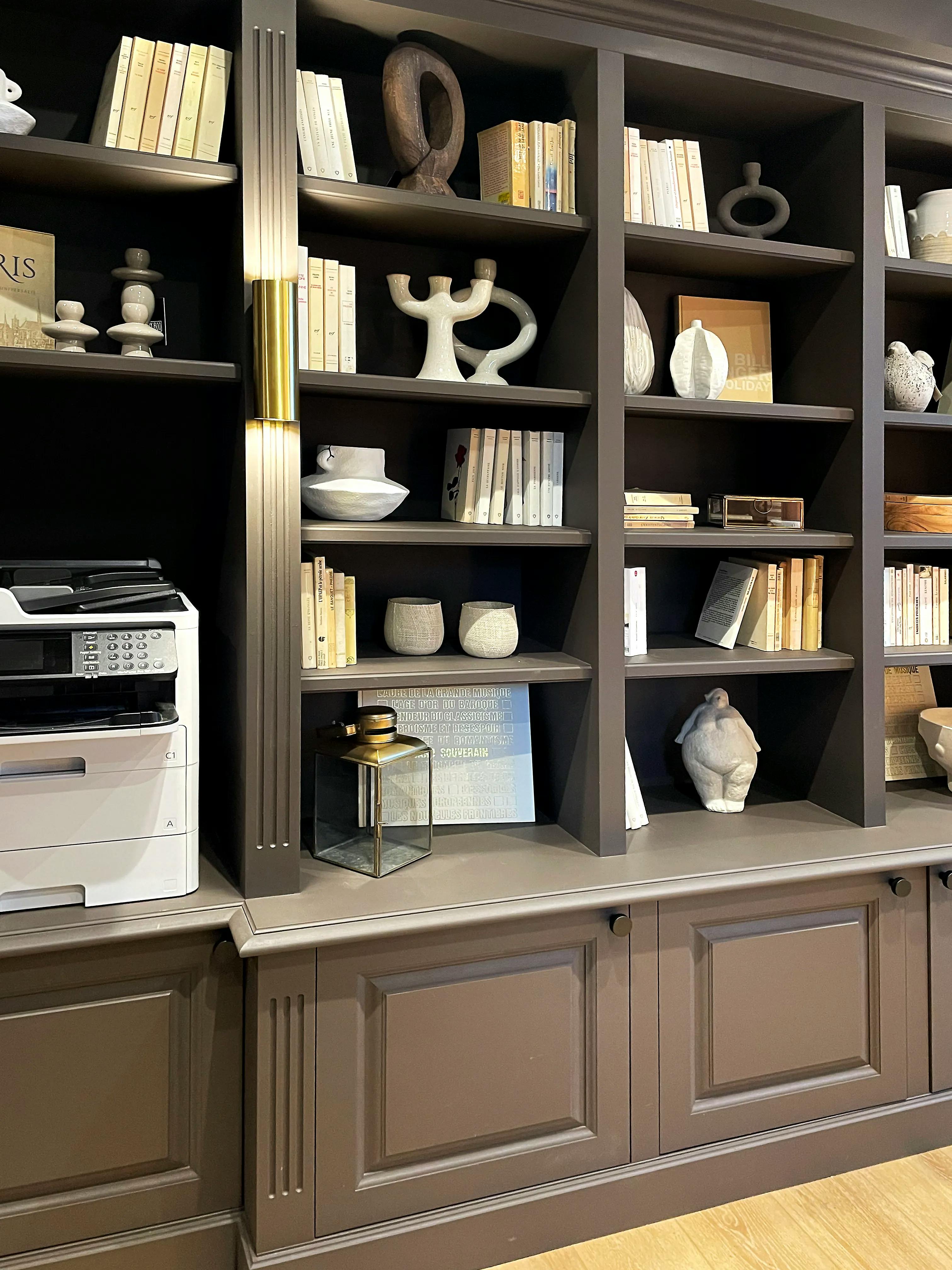 Ce rangement sur mesure a été imaginé pour répondre à une double contrainte : offrir une capacité de rangement importante tout en dissimulant certains éléments techniques comme l’imprimante. La bibliothèque occupe tout le mur, avec des étagères ouvertes symétriques, créant un rythme visuel équilibré. Le sur-mesure a permis d’intégrer un caisson fermé sur la droite et un espace bureautique discret sur la gauche.