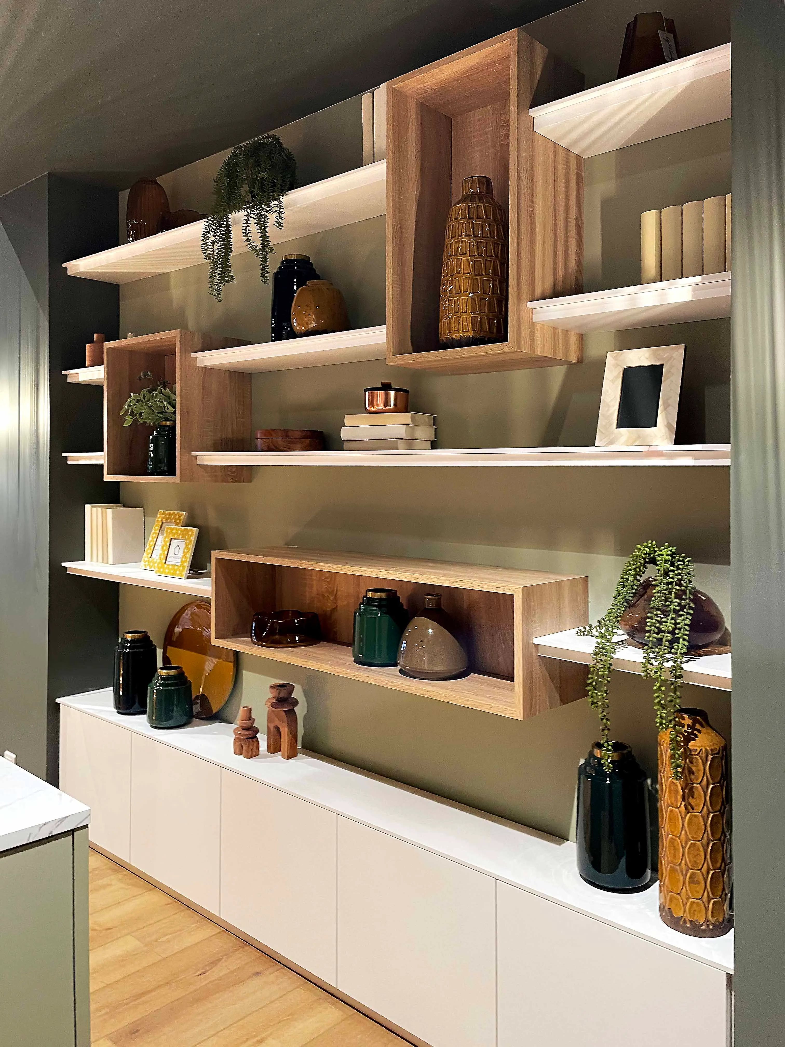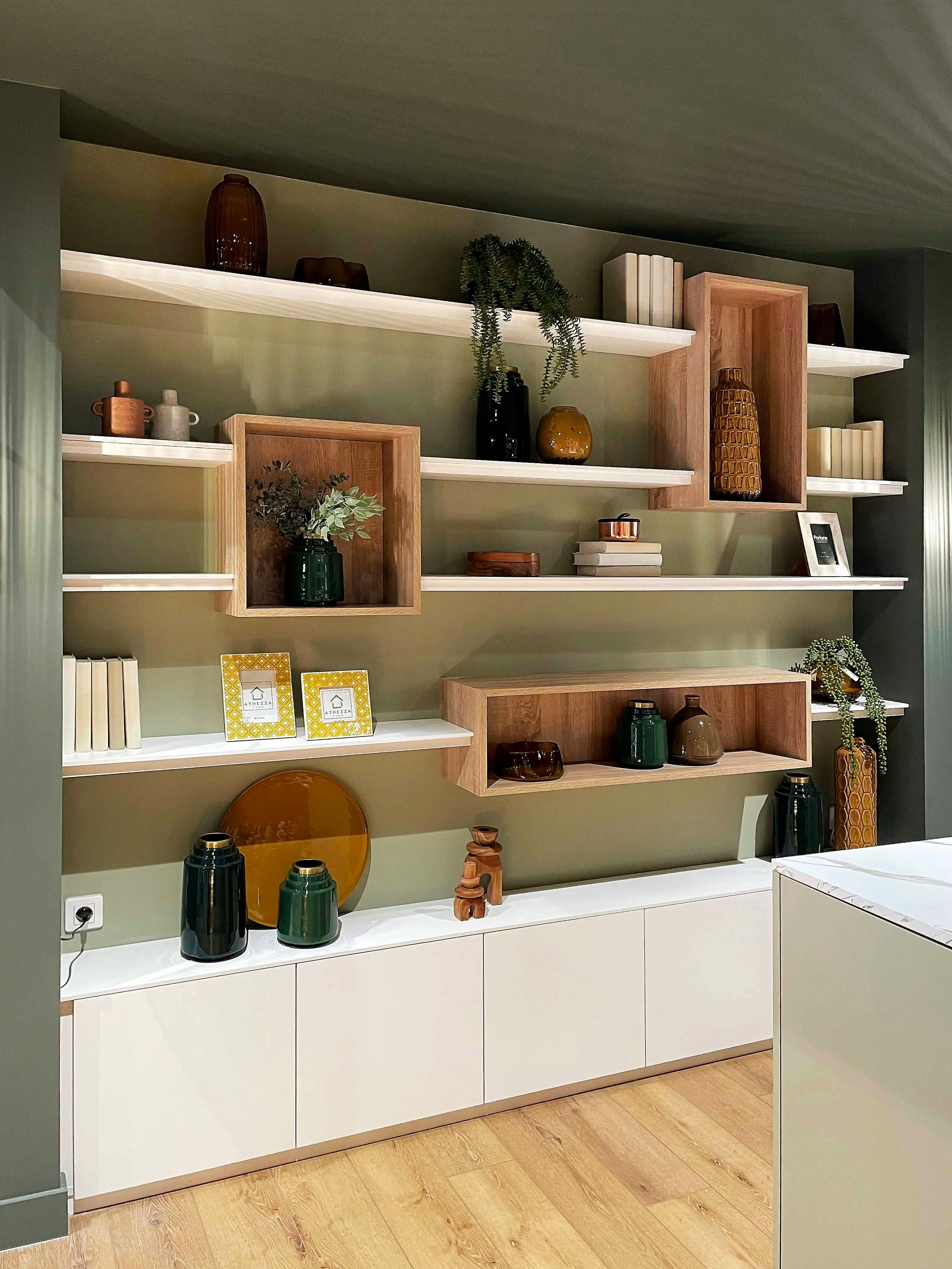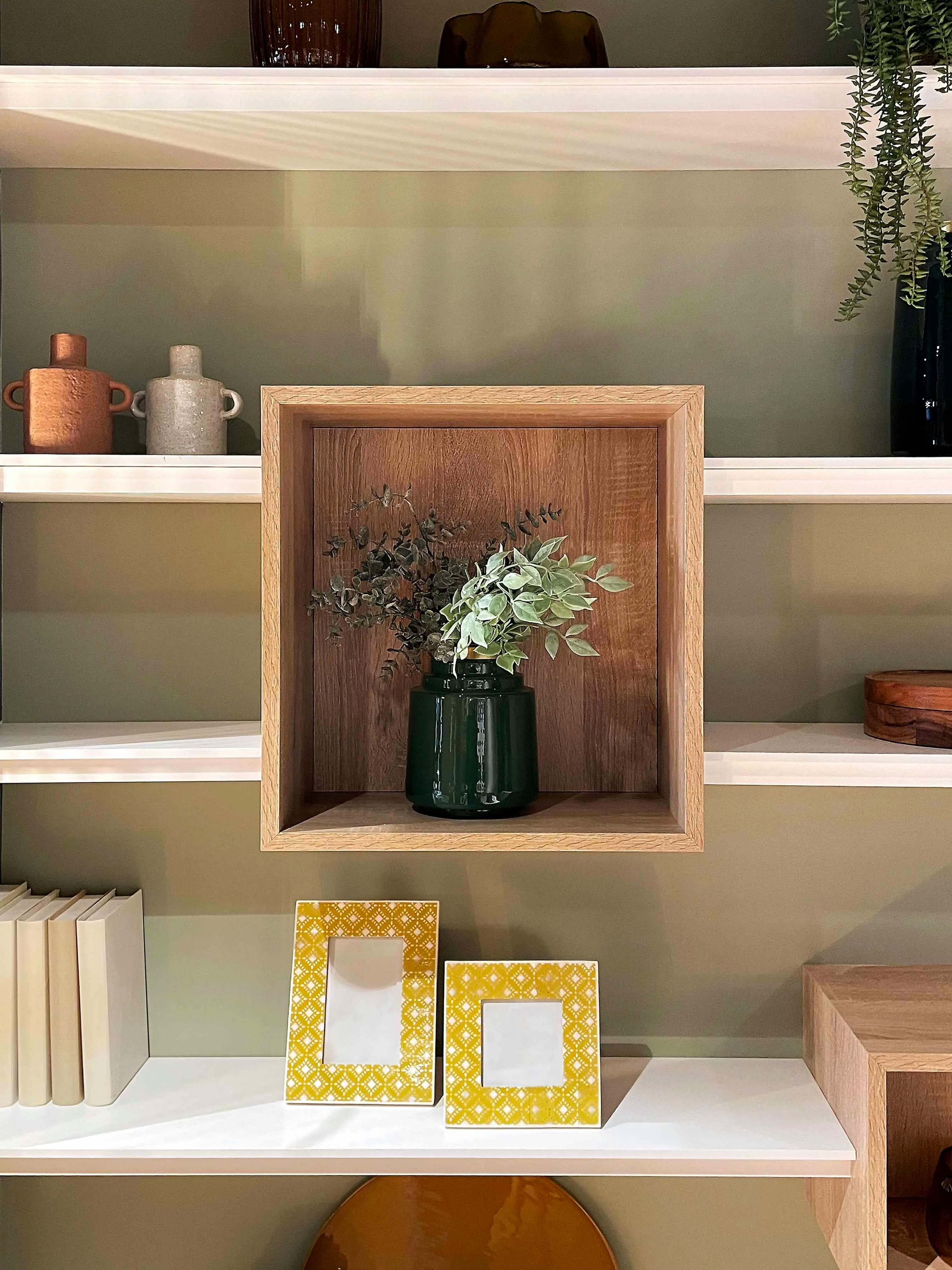 L’enjeu était de créer une composition aérienne mêlant rangements fermés et étagères ouvertes, permettant d’exposer des objets de décoration et des livres. L’association de niches en bois naturel avec des étagères blanches apporte du contraste et du relief à l’ensemble. La teinte verte du mur met en valeur les éléments et crée une ambiance chaleureuse et apaisante. Ce meuble allie praticité et esthétisme, offrant un équilibre parfait entre stockage et mise en scène décorative.