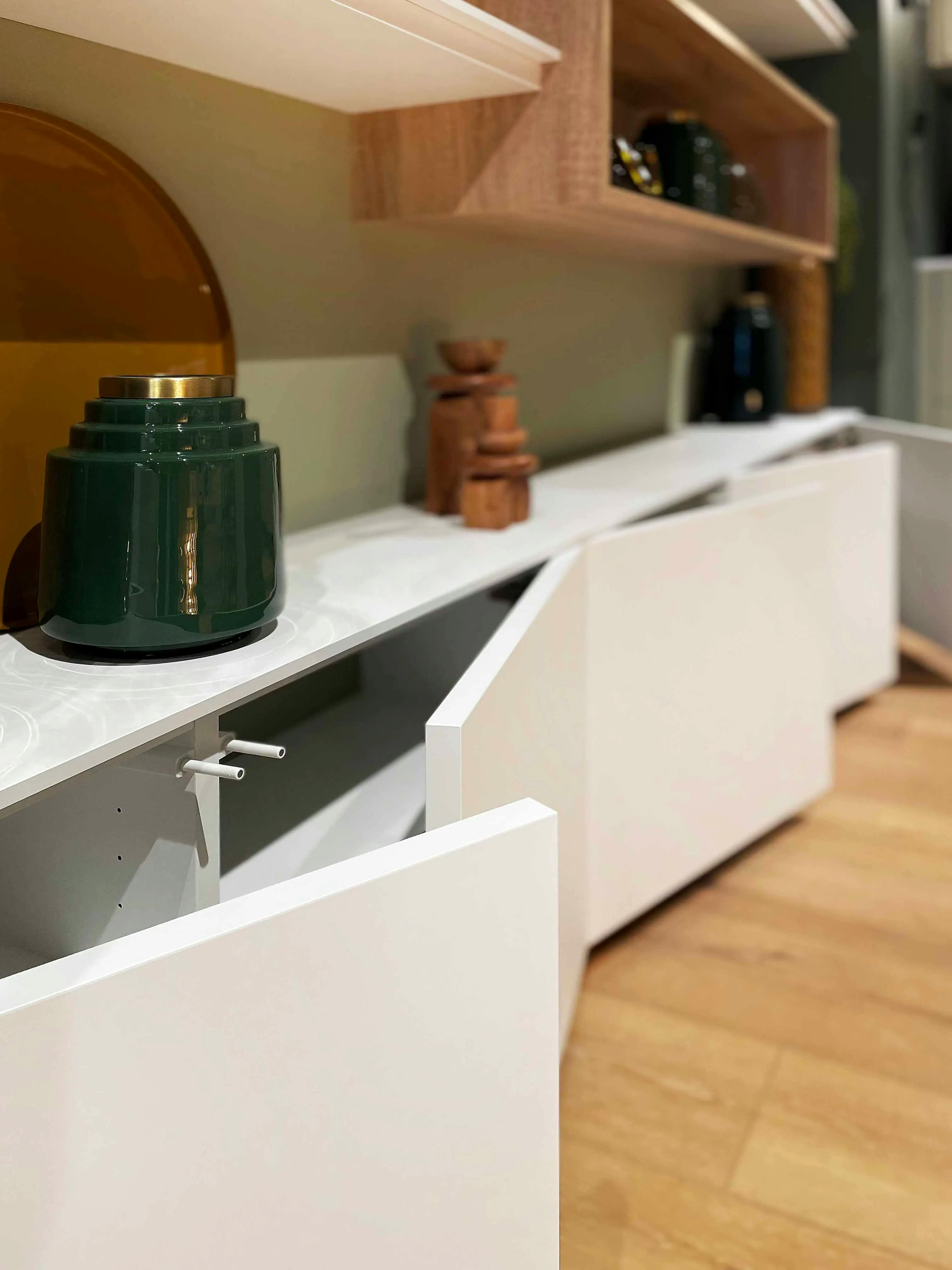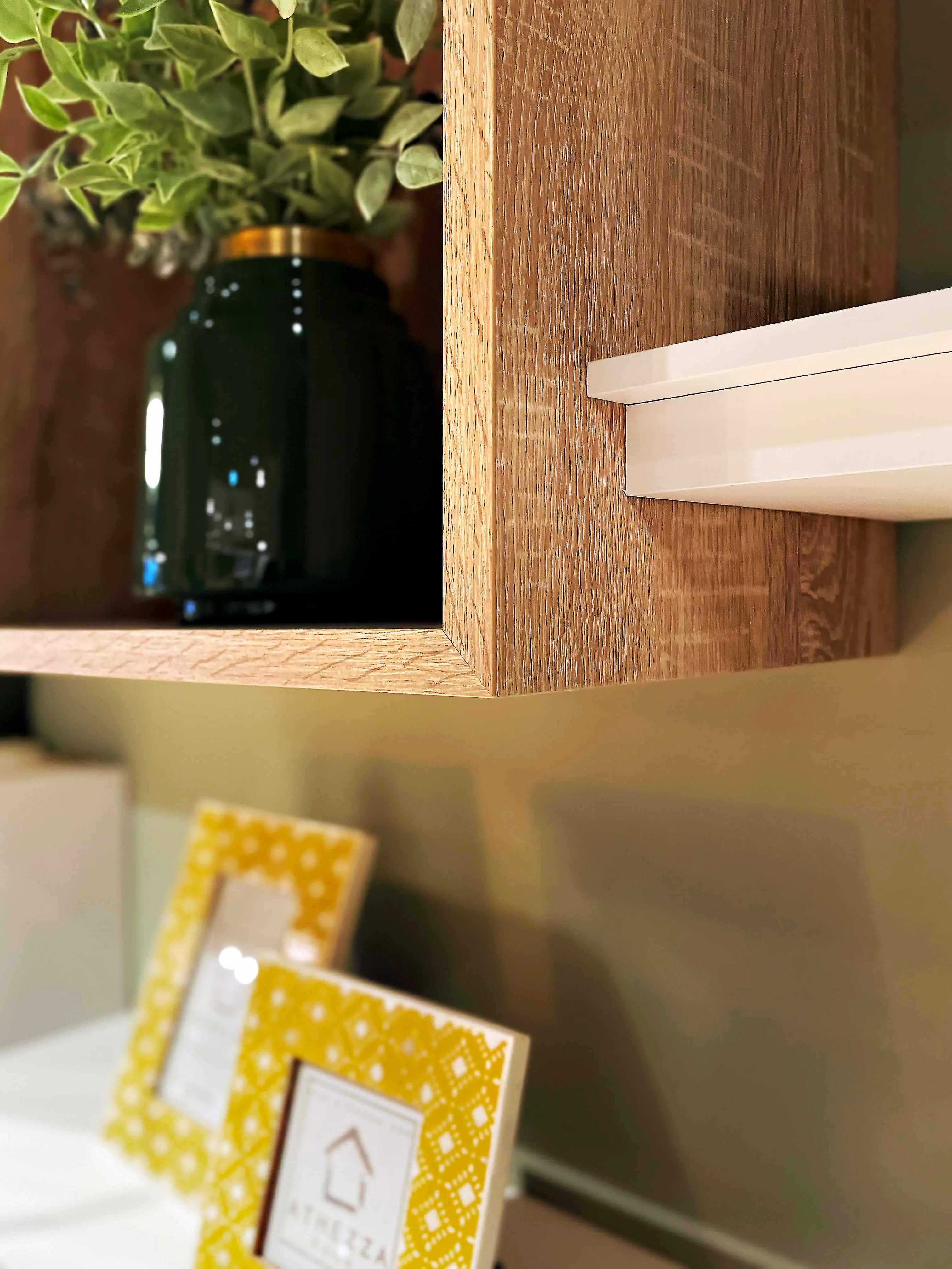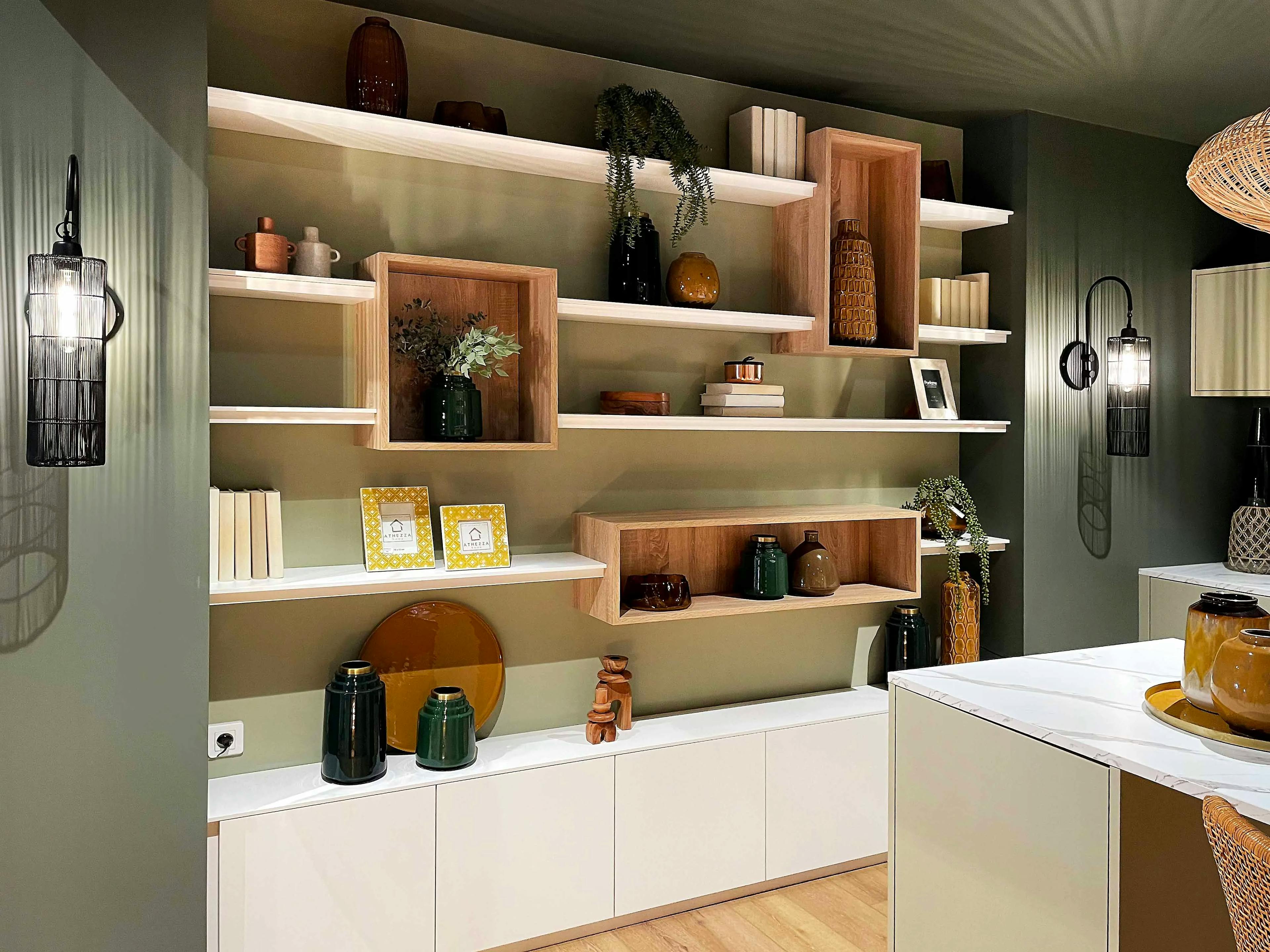 L’enjeu était de créer une composition aérienne mêlant rangements fermés et étagères ouvertes, permettant d’exposer des objets de décoration et des livres. L’association de niches en bois naturel avec des étagères blanches apporte du contraste et du relief à l’ensemble. La teinte verte du mur met en valeur les éléments et crée une ambiance chaleureuse et apaisante. Ce meuble allie praticité et esthétisme, offrant un équilibre parfait entre stockage et mise en scène décorative.