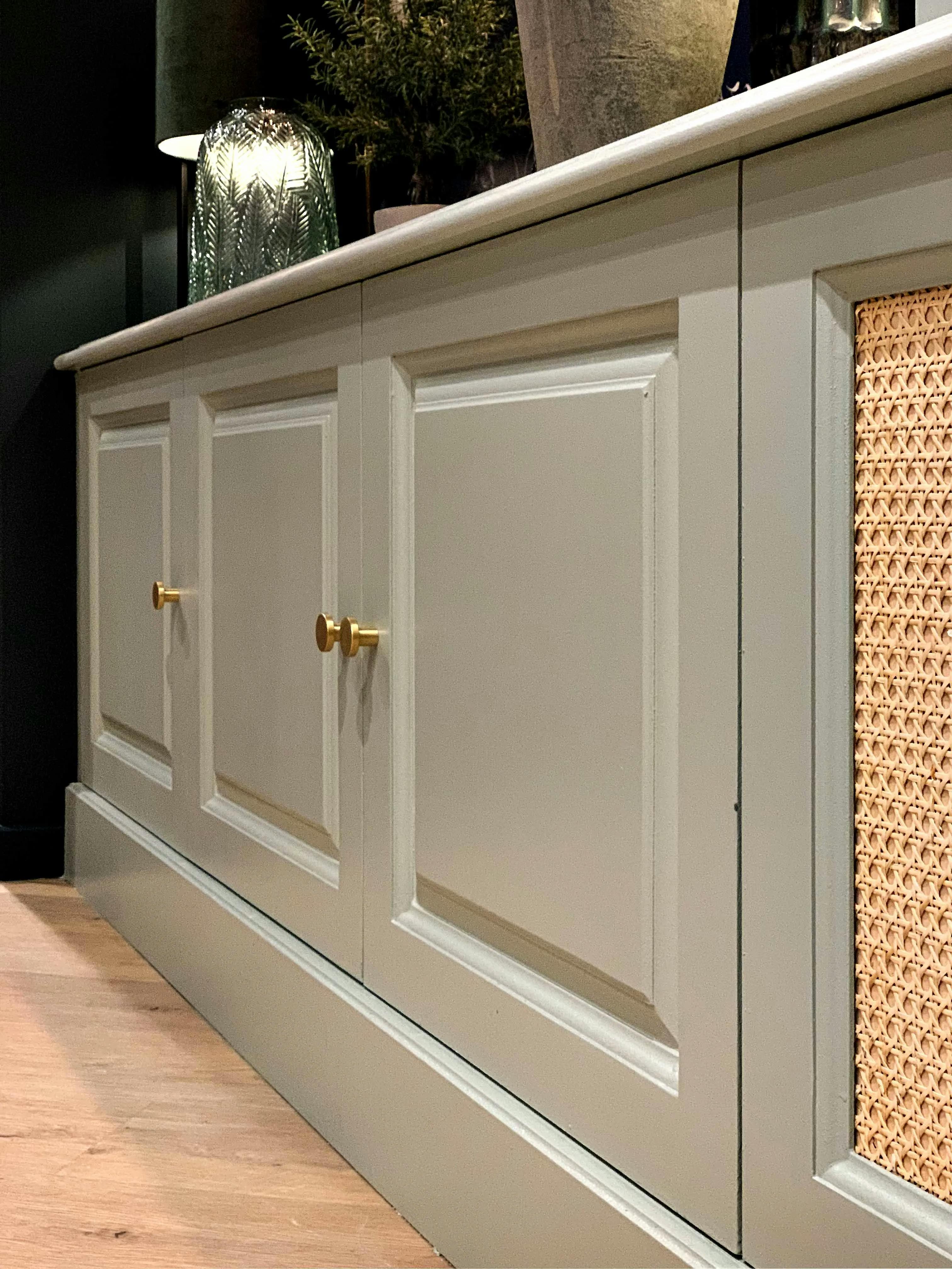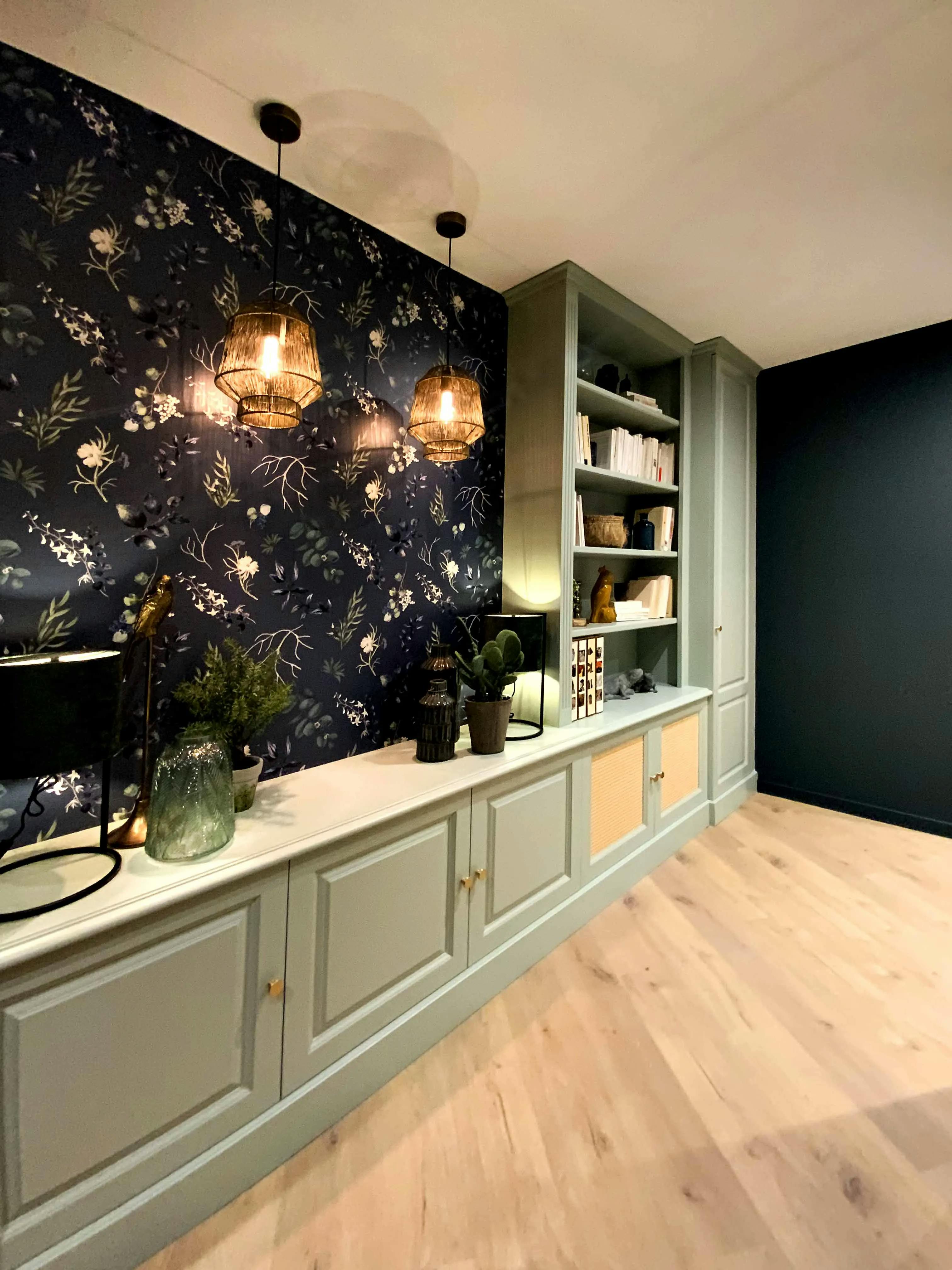 L’enjeu principal était d’intégrer un aménagement qui s’harmonise avec l’ambiance feutrée et chaleureuse de l’espace, tout en maximisant les capacités de stockage. Le projet réalisé associe des placards fermés en partie basse et des étagères ouvertes en hauteur, permettant un équilibre entre fonctionnalité et mise en valeur des objets décoratifs. La teinte vert-gris du mobilier s’accorde avec le papier peint fleuri, renforçant l’aspect sophistiqué de la pièce. Enfin, les portes en cannage et les poignées dorées ajoutent une touche de raffinement, tandis que l’éclairage suspendu crée une atmosphère intime et cosy.