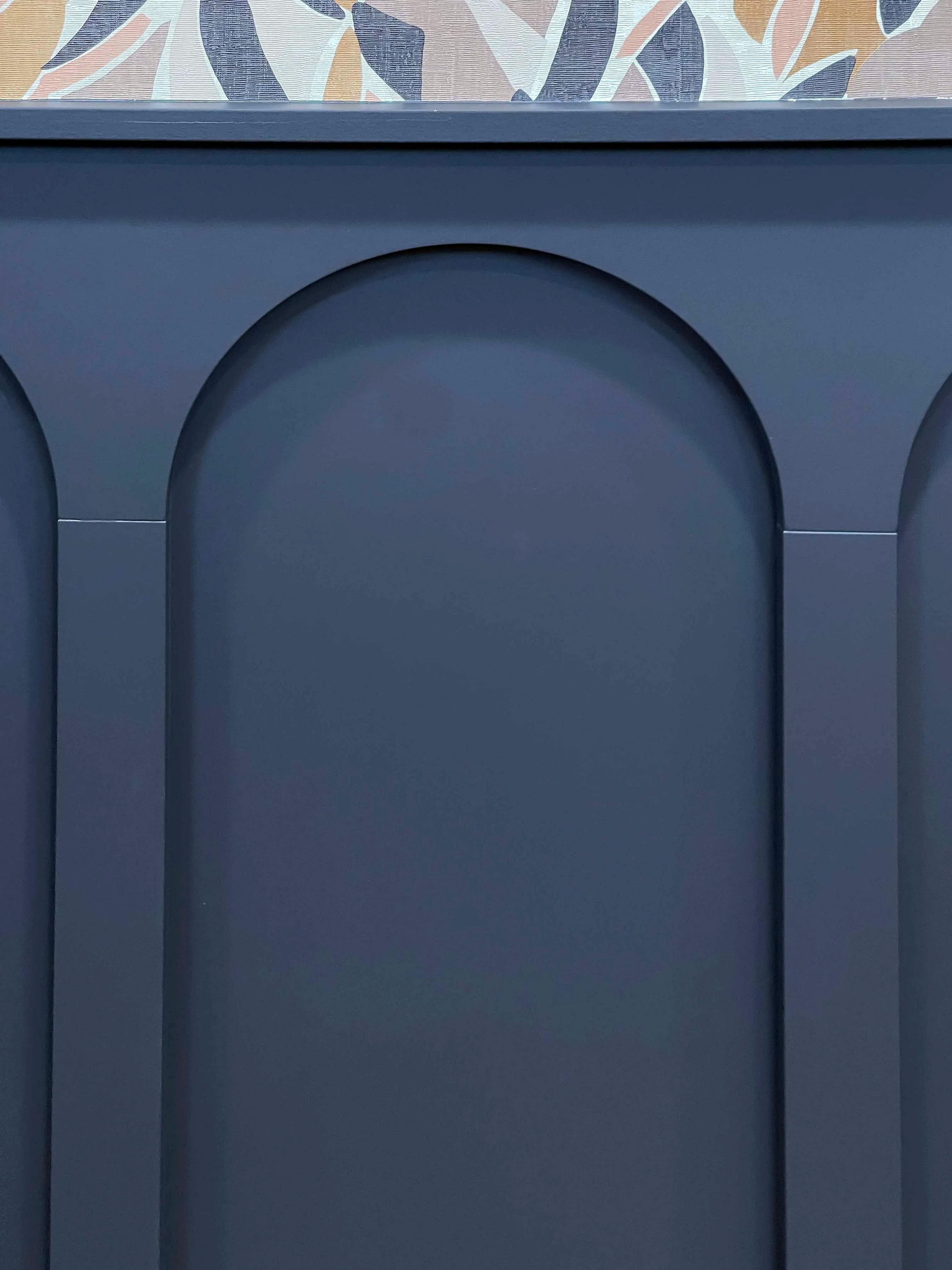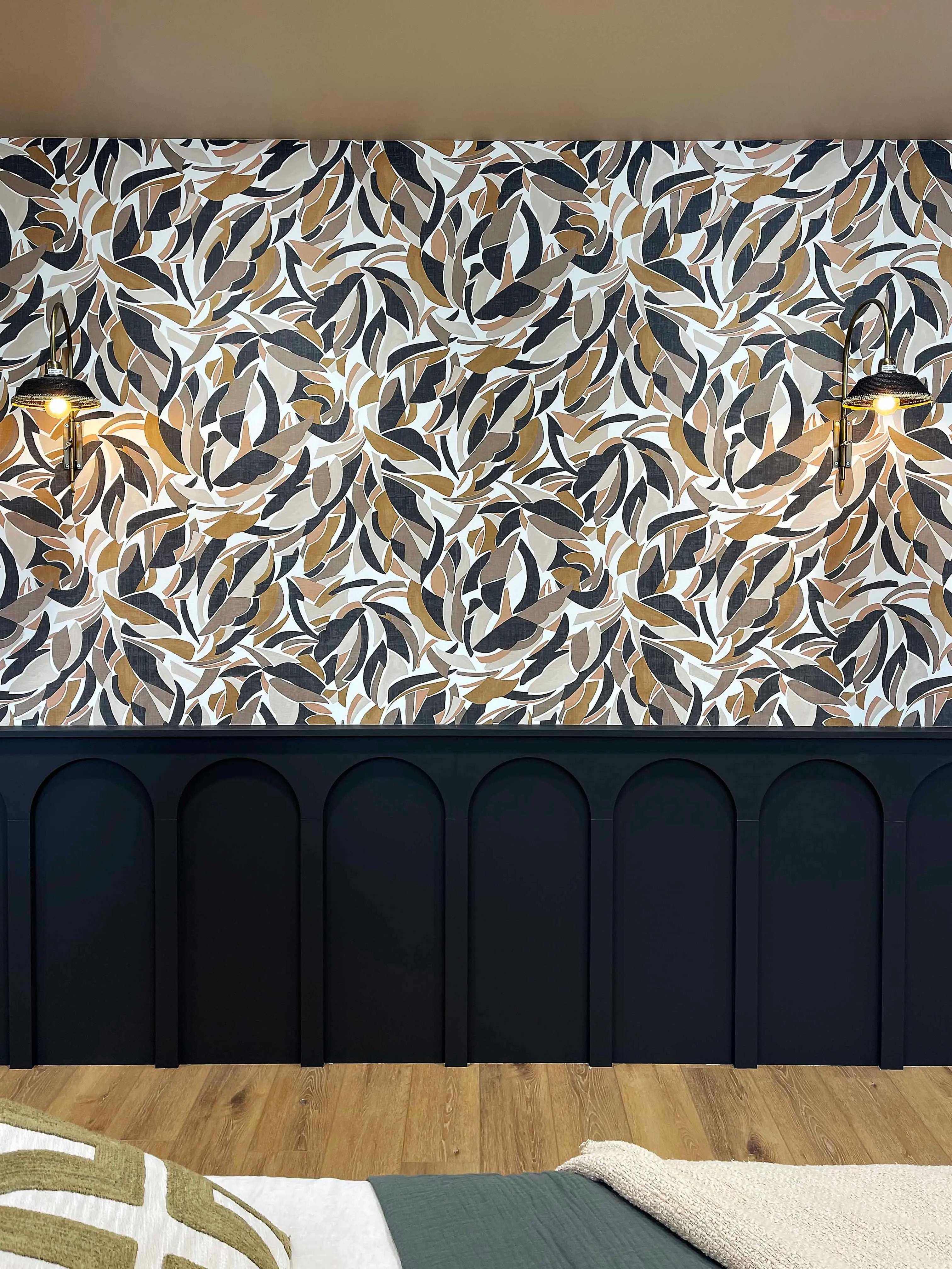 Cette boiserie en partie basse, conçue sur mesure, propose un design inhabituel et unique. La conception se distingue par des panneaux mis en forme en arche. Ces arches sont associées à un papier peint aux teintes artistiques et organiques. La finition foncée et mate crée un contraste sophistiqué, rehaussé par des appliques murales dorées.
