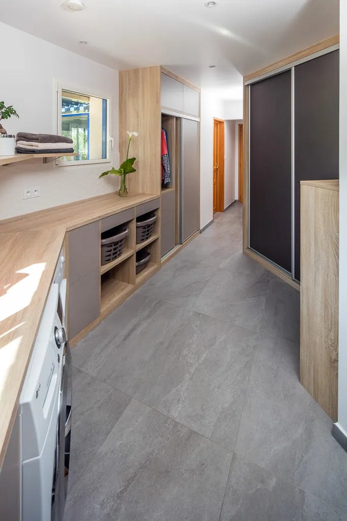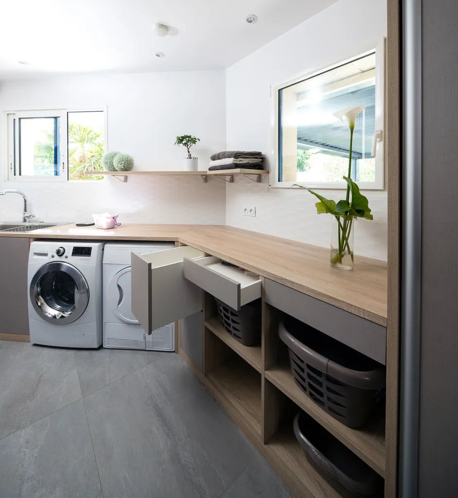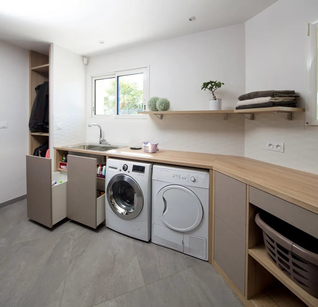 L’enjeu était d’intégrer un lave-linge et un sèche-linge sous un plan de travail fonctionnel, tout en offrant des rangements pratiques pour les produits ménagers et le linge. Le sur-mesure s’est imposé pour exploiter chaque recoin, notamment avec des tiroirs coulissants permettant un accès rapide aux accessoires d’entretien. Une étagère murale apporte un espace supplémentaire pour stocker serviettes et plantes décoratives, tandis qu’un meuble ouvert accueille les paniers à linge. L’association du bois clair et des façades en ton beige crée une ambiance chaleureuse et harmonieuse, parfaitement adaptée à un espace utilitaire.
