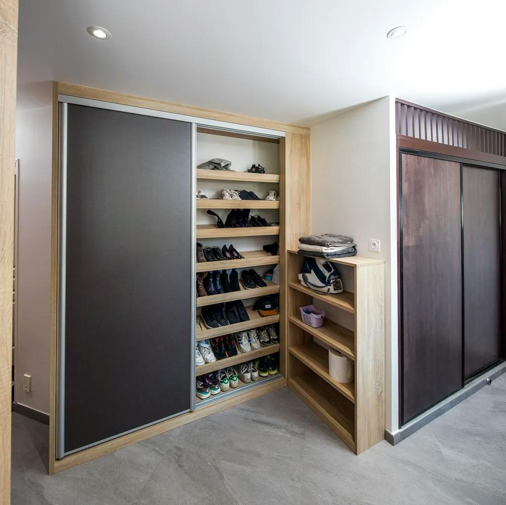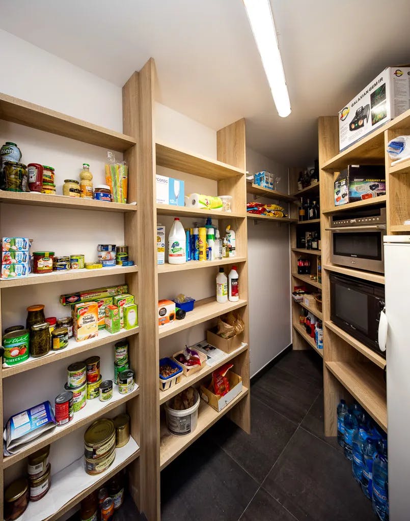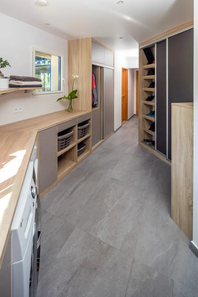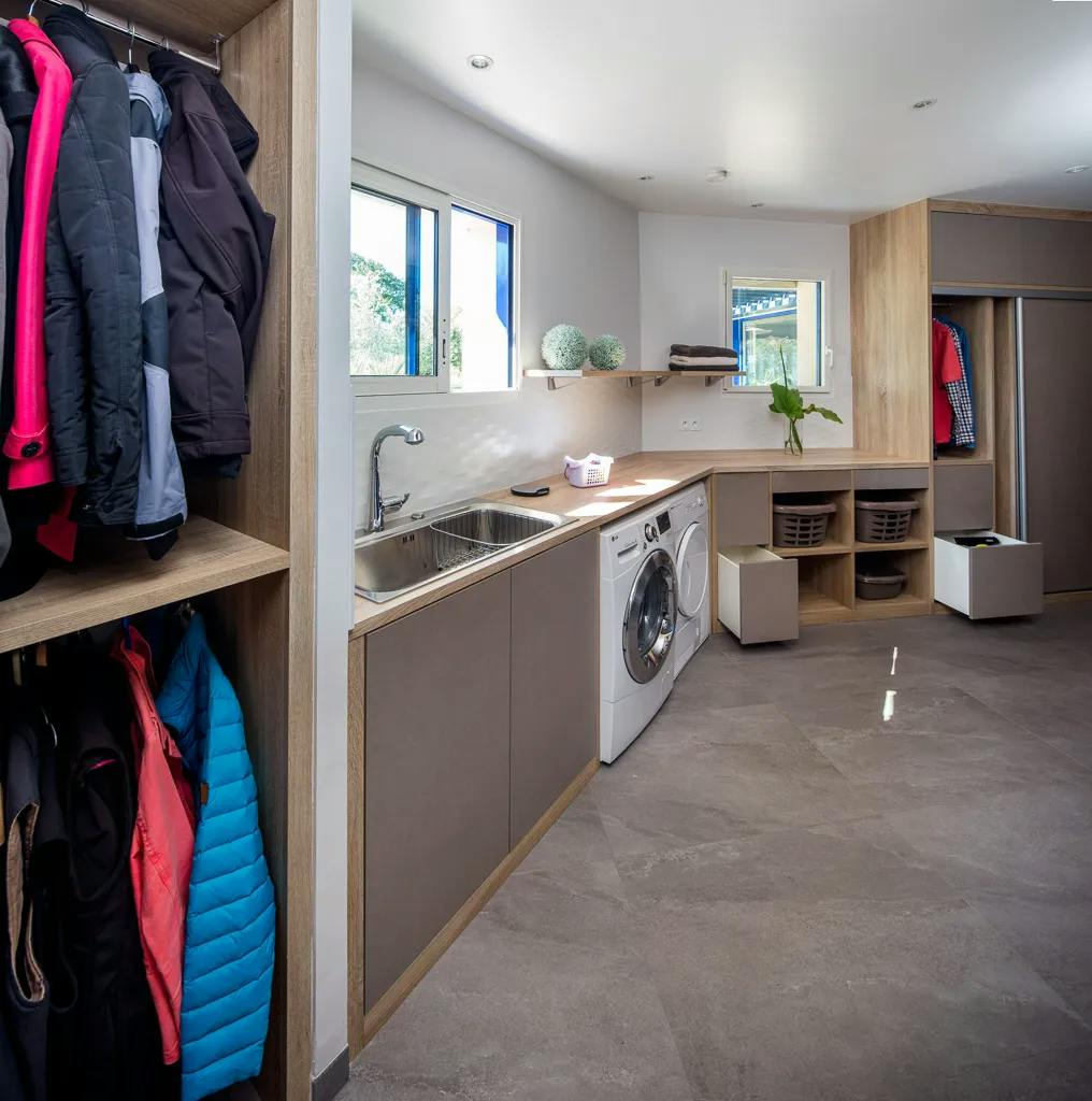 L’enjeu était d’intégrer un lave-linge et un sèche-linge sous un plan de travail fonctionnel, tout en offrant des rangements pratiques pour les produits ménagers et le linge. Le sur-mesure s’est imposé pour exploiter chaque recoin, notamment avec des tiroirs coulissants permettant un accès rapide aux accessoires d’entretien. Une étagère murale apporte un espace supplémentaire pour stocker serviettes et plantes décoratives, tandis qu’un meuble ouvert accueille les paniers à linge. L’association du bois clair et des façades en ton beige crée une ambiance chaleureuse et harmonieuse, parfaitement adaptée à un espace utilitaire.