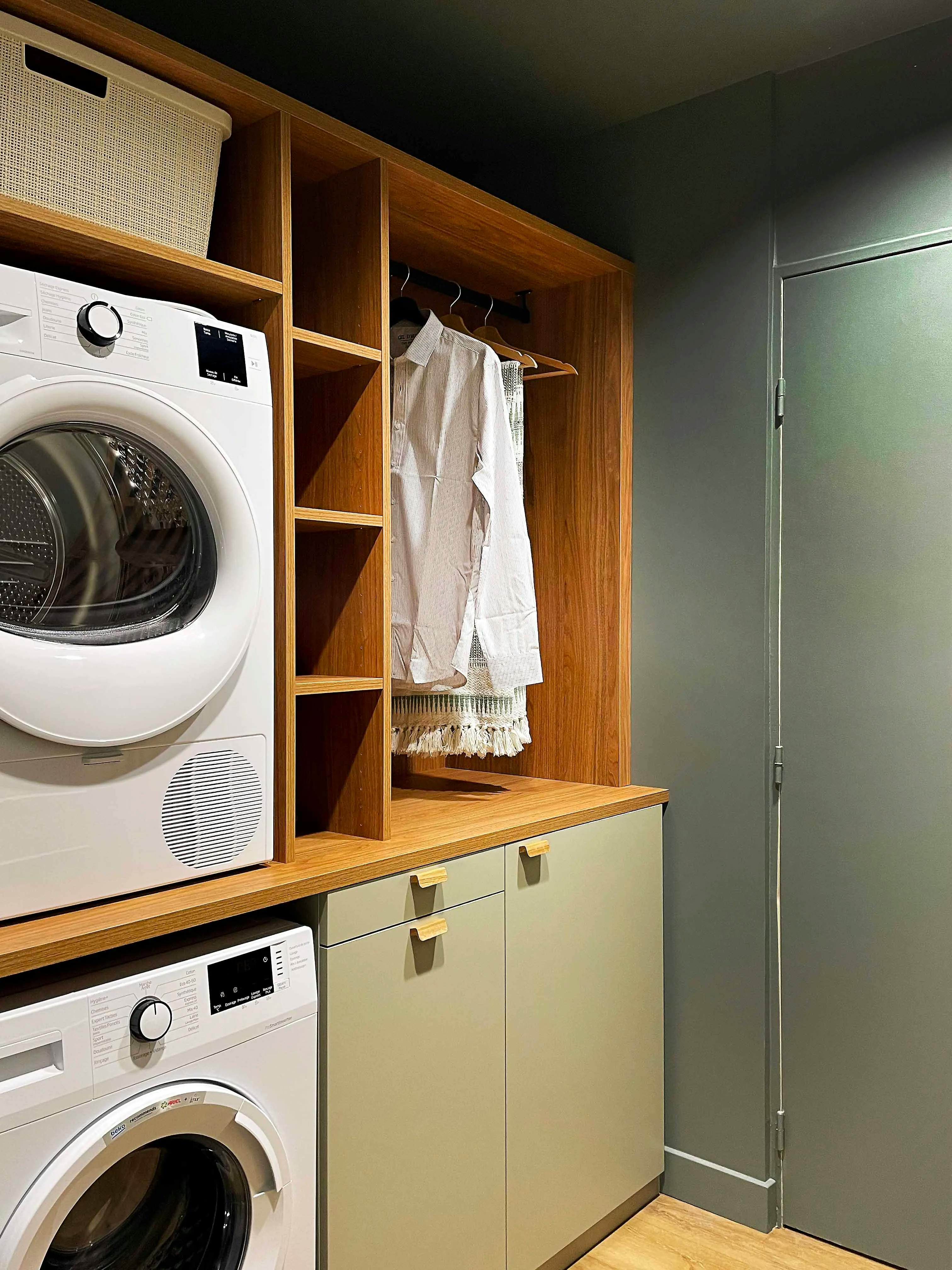 Le sur-mesure a permis de tirer parti de cette petite pièce pour installer machines, rangements et penderies de façon cohérente. Nous avons proposé un meuble pensé pour l’efficacité avec des étagères adaptées, une tablette coulissante pour poser le panier de linge, des tiroirs "bacs à linge" et une zone de suspension pratique pour faire sécher les vêtements à leur sortie de la machine. Le contraste entre le bois chaleureux et les portes vert pastel apporte du caractère tout en restant intemporel. Les accessoires comme les boîtes de rangement permettent de garder l’espace ordonné et esthétique.