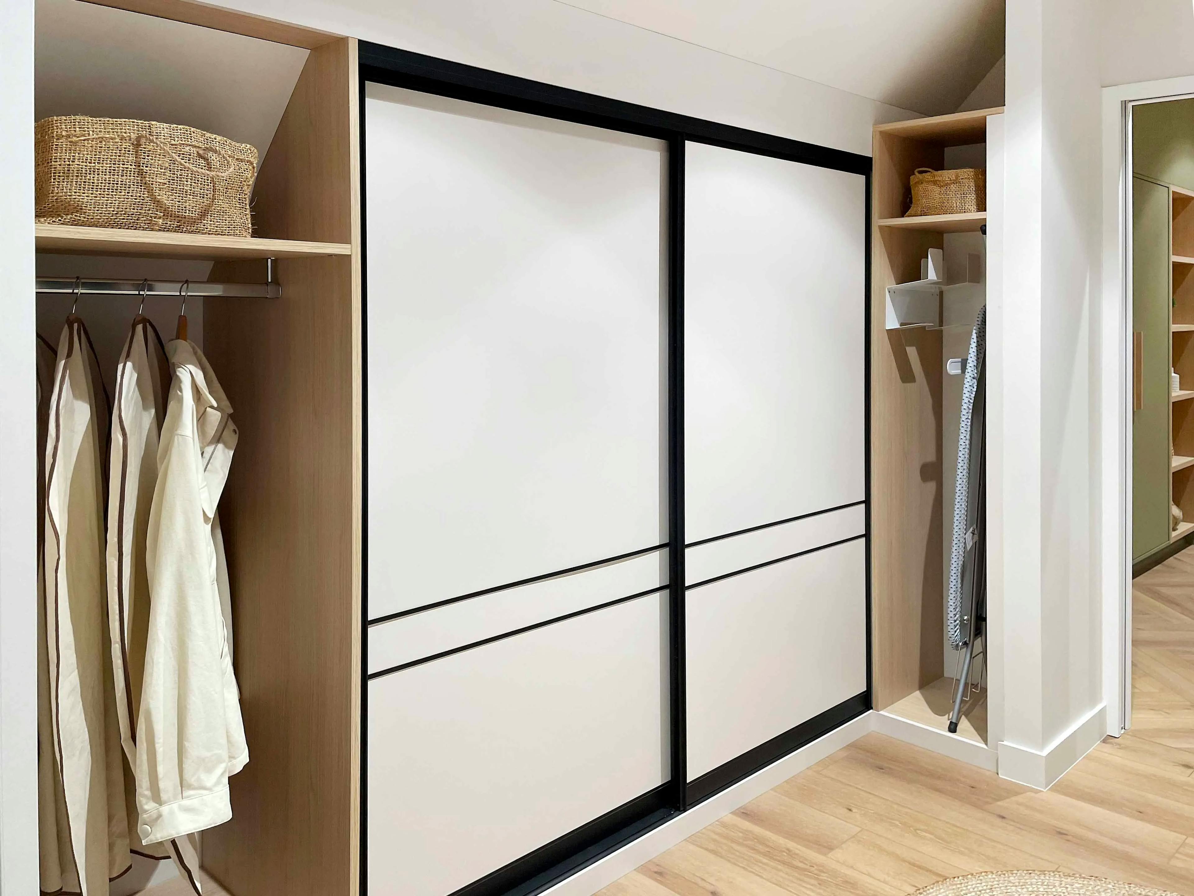 La particularité de ce projet était de devoir aménager une buanderie sous pente, un espace aux dimensions irrégulières. L’enjeu majeur était de tirer parti de cette forme atypique tout en assurant un rangement pratique et accessible. Le choix de portes coulissantes a été crucial pour ne pas encombrer l’espace, permettant d’ouvrir et de fermer les compartiments de manière fluide et sans gêner la circulation dans la pièce.