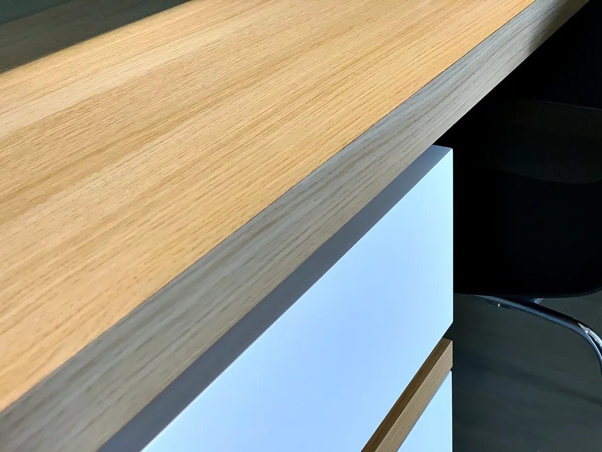 La principale contrainte résidait dans l'optimisation de l'agencement face à un mur incliné, nécessitant une solution sur mesure pour maximiser l'utilisation de l’espace. Le bureau en angle, accompagné d'étagères suspendues et de modules de rangement fermés, permet une organisation fluide tout en maintenant une impression d’ouverture. L’association du bois clair et des façades blanches avec le mur vert profond crée un contraste équilibré et chaleureux. Des éléments décoratifs et des plantes viennent compléter l’ensemble, apportant une touche de vie et de personnalité à cet espace de travail structuré.