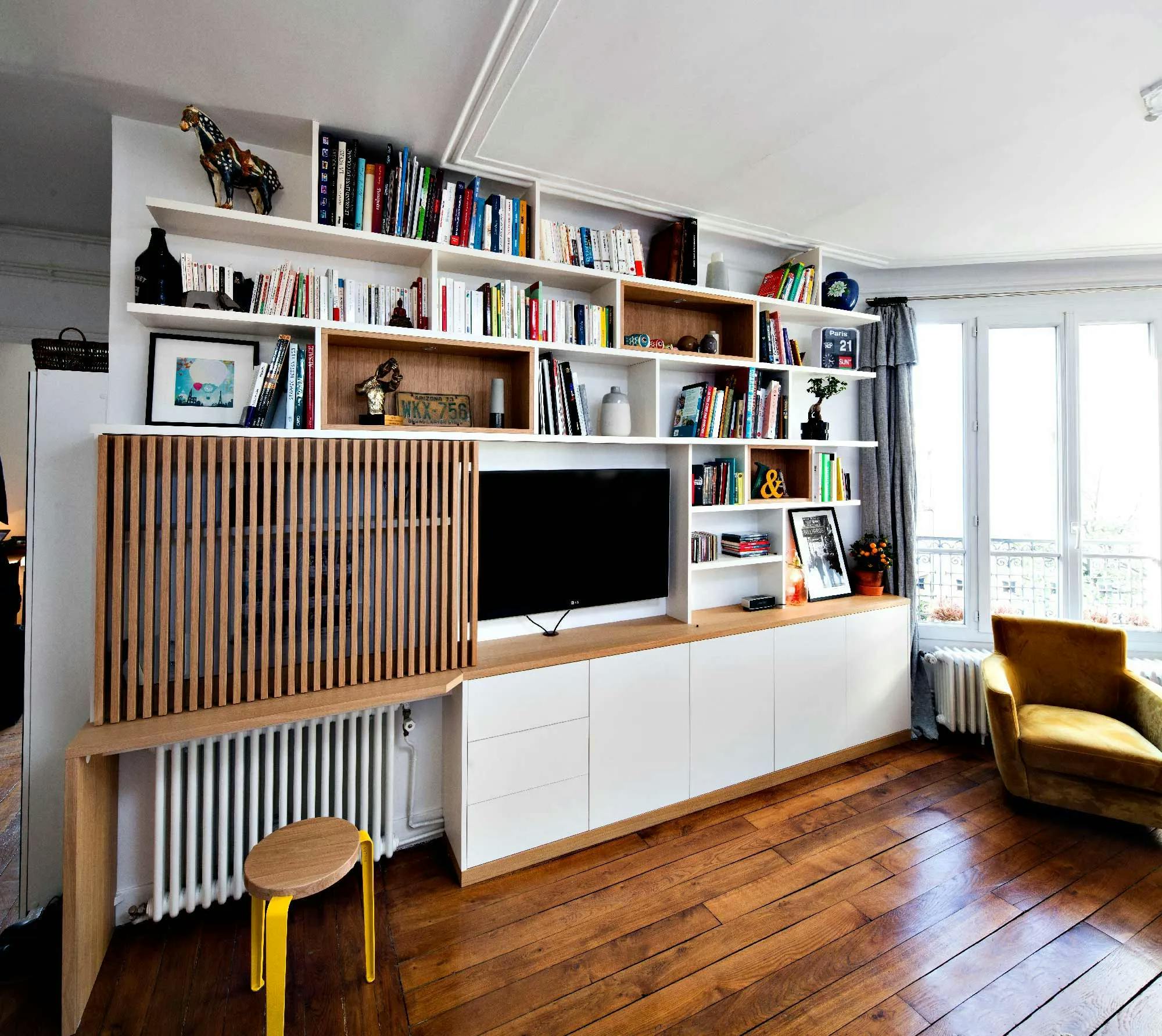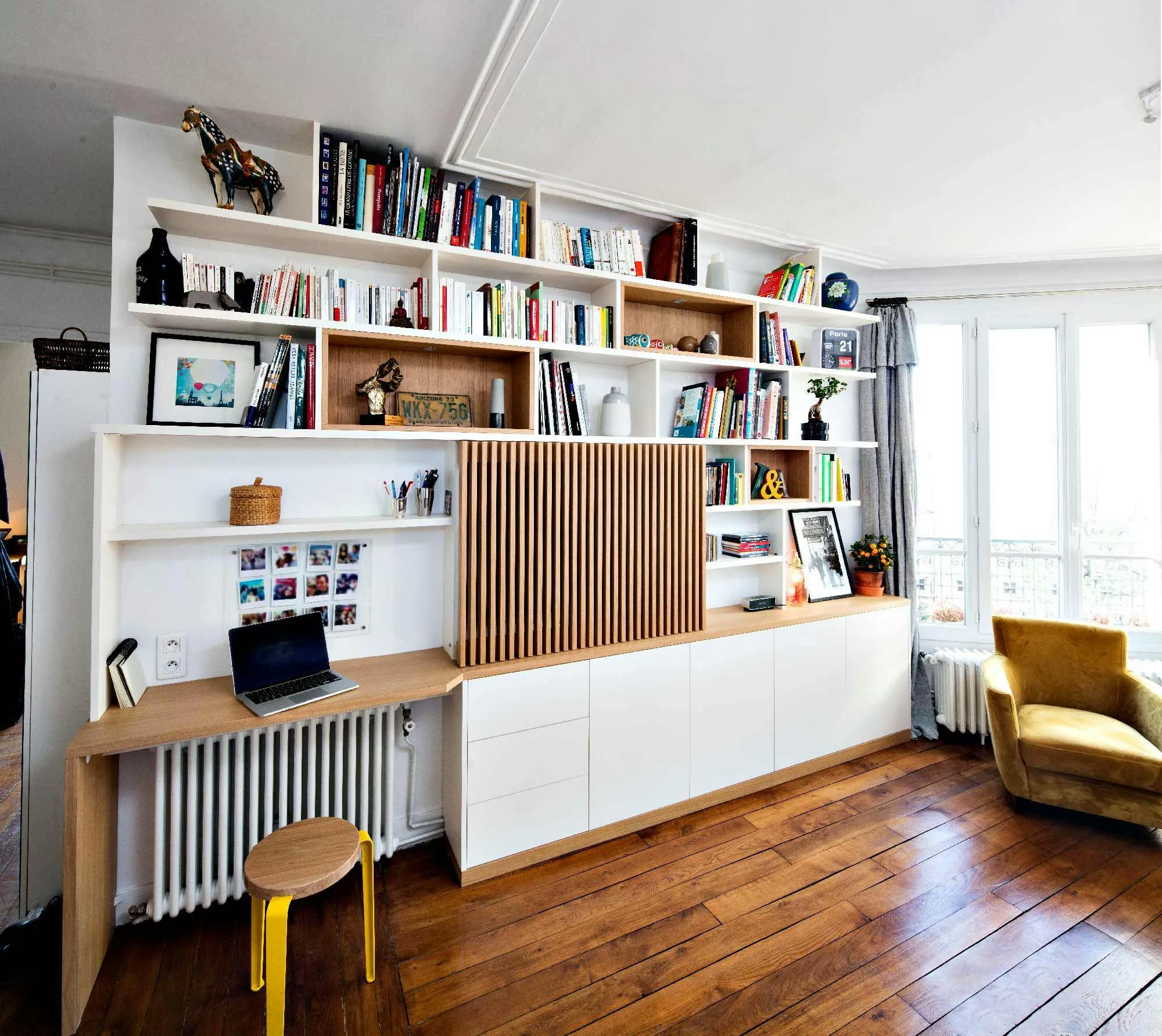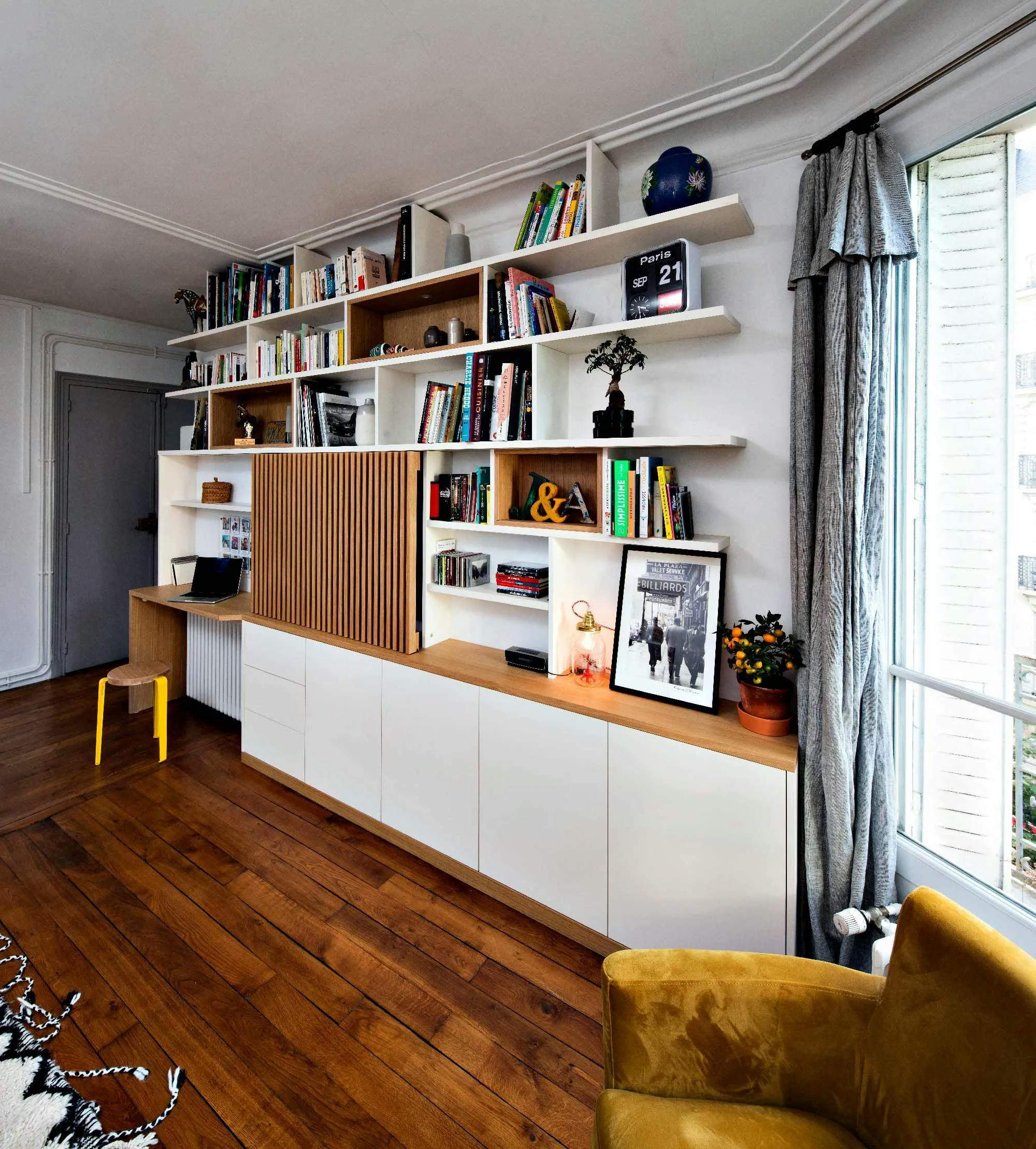 La principale difficulté était d’optimiser le mur en exploitant la hauteur sous plafond tout en intégrant un bureau sans encombrer l’espace. Le sur-mesure s’est imposé pour adapter précisément les dimensions aux contraintes du radiateur et de la baie vitrée, tout en assurant une continuité esthétique. La solution a été une bibliothèque structurée avec des niches ouvertes et fermées, un bureau intégré, ainsi qu’un panneau coulissant en bois à lames pour dissimuler l’écran selon l’usage. Les finitions alternent entre blanc et bois naturel pour apporter luminosité et chaleur, tandis que des étagères irrégulières et des encadrements en chêne créent un jeu graphique fonctionnel et décoratif.