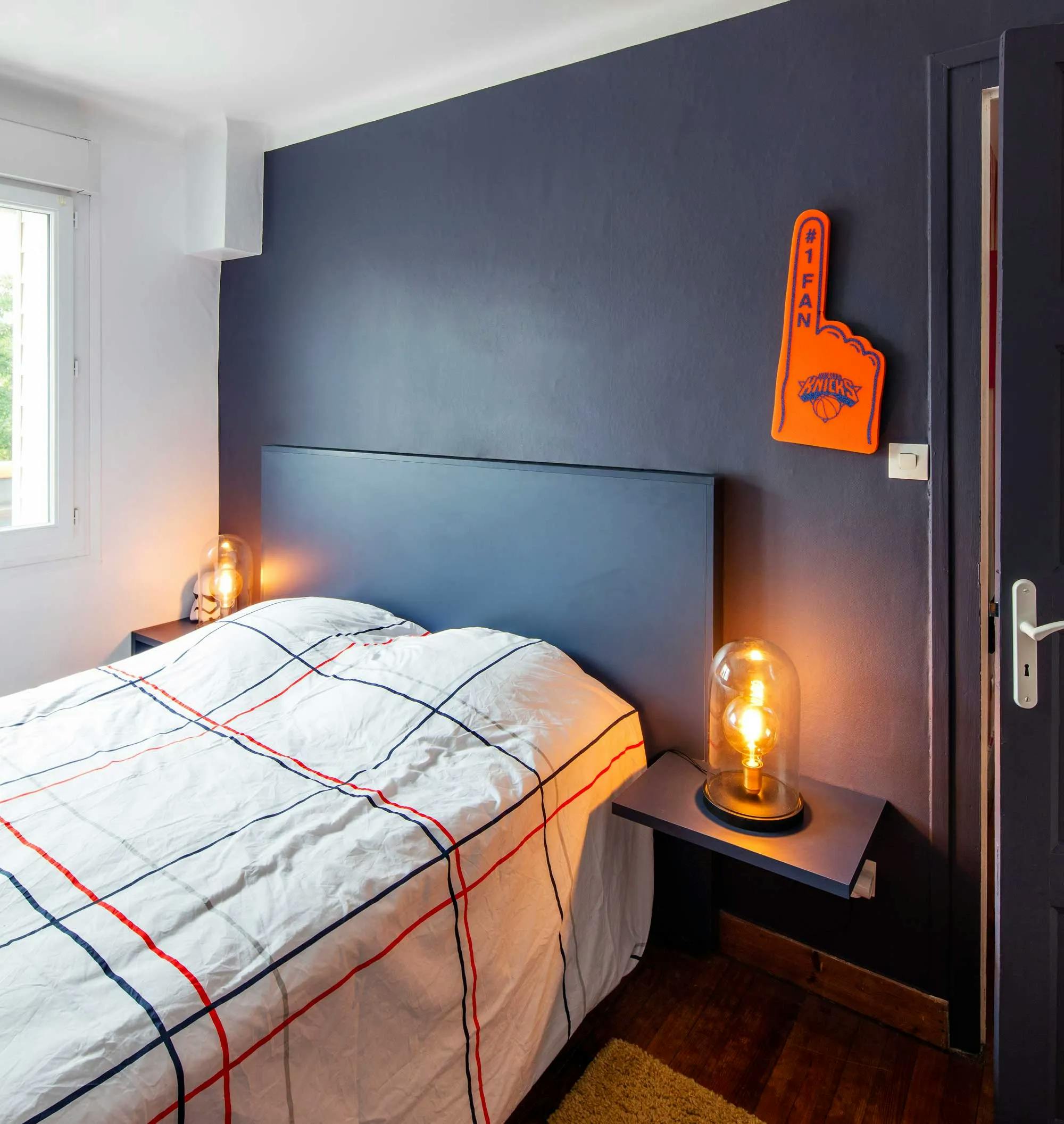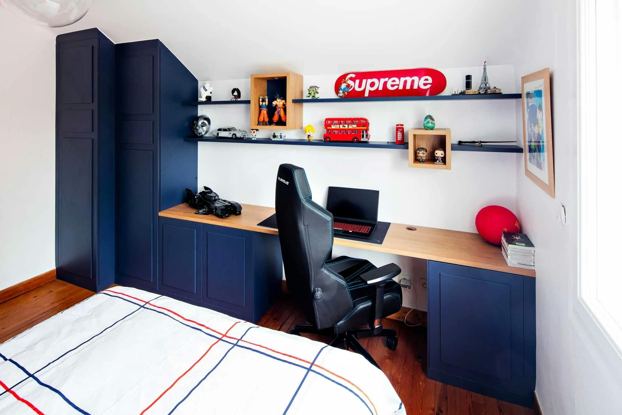 L'enjeu principal était l'inclinaison du mur, nécessitant une solution sur mesure pour exploiter au mieux l’espace disponible sans alourdir l’ensemble. L'installation d'un bureau sur toute la longueur, accompagné d’un dressing et de meubles bas, permet d'offrir à la fois un coin studieux et du rangement fermé. Le choix du bleu profond associé au bois clair apporte du contraste et du caractère à la pièce, tout en restant moderne et intemporel. Des étagères ouvertes et des niches décoratives permettent d’exposer des objets personnels, rendant l’ensemble plus vivant et personnalisé.