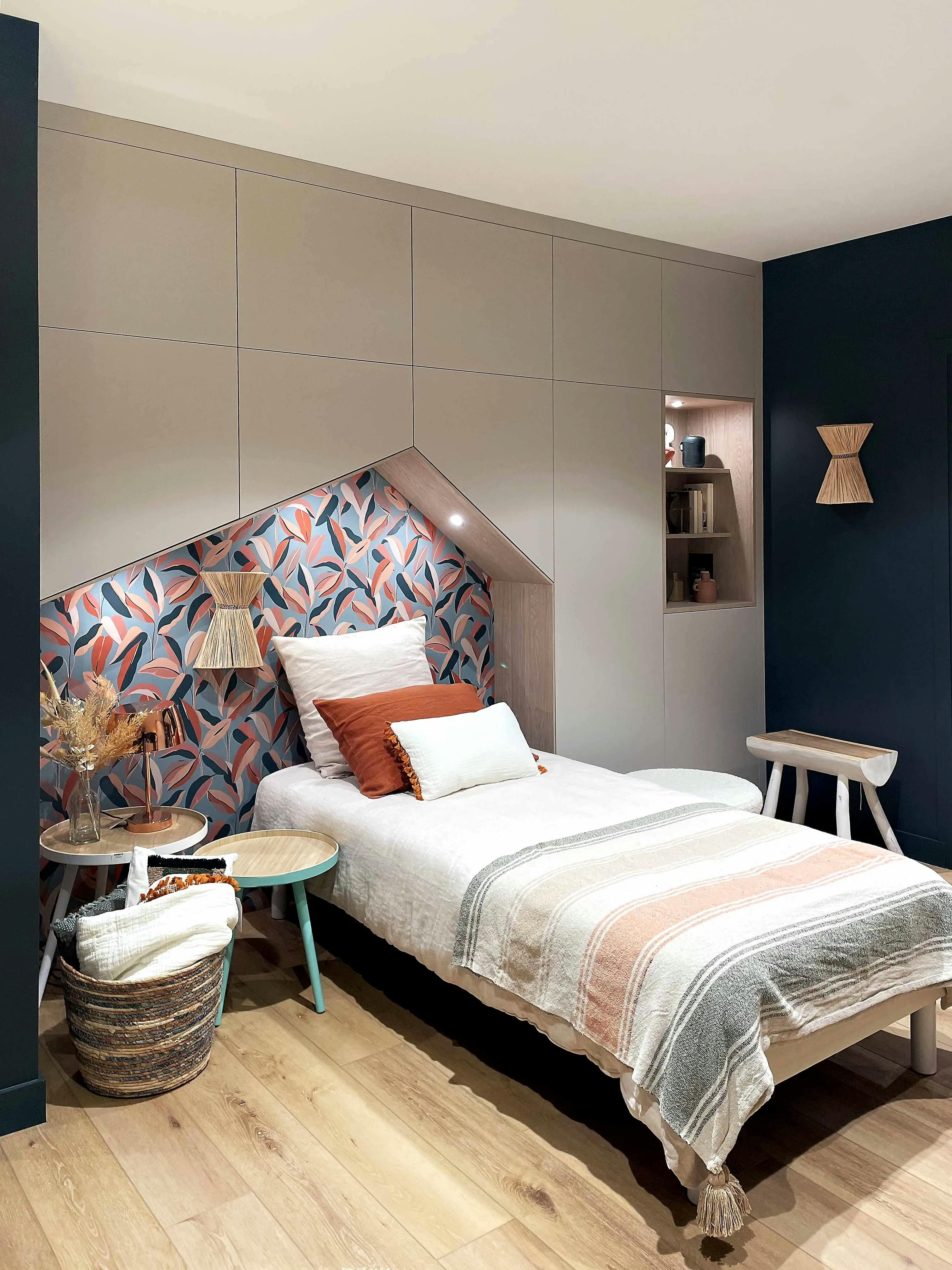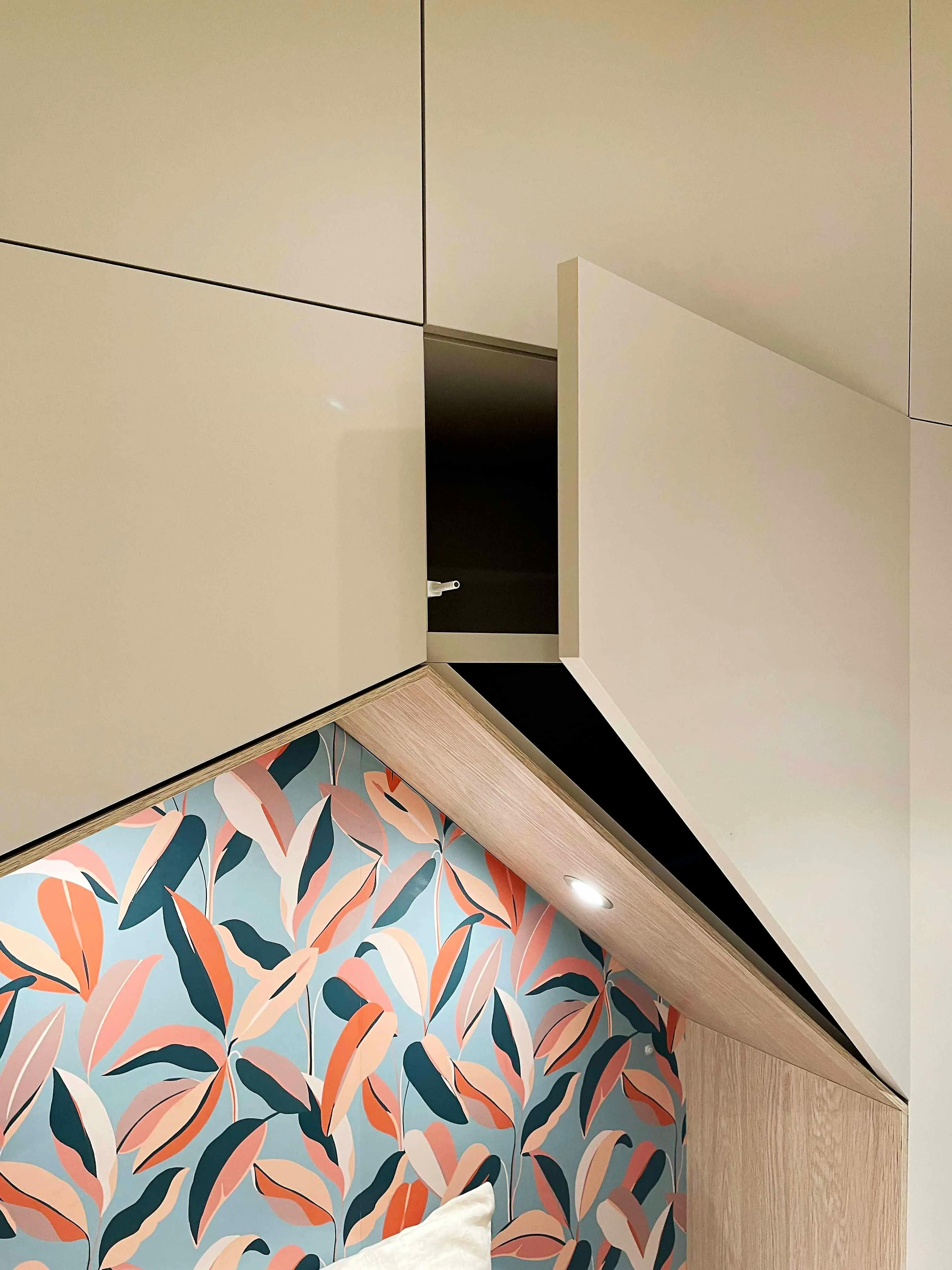 Le principal défi était de tirer parti des contraintes liées à la pente du toit, ce qui réduisait l’espace disponible pour l’aménagement traditionnel. Un aménagement sur-mesure était indispensable pour s’adapter à la configuration atypique de la pièce, avec des éléments qui permettent à la fois de gagner de la place et de préserver un confort visuel et pratique. La solution retenue a consisté à créer des rangements encastrés et modulables, tout en apportant une touche décorative avec un éclairage intégré.