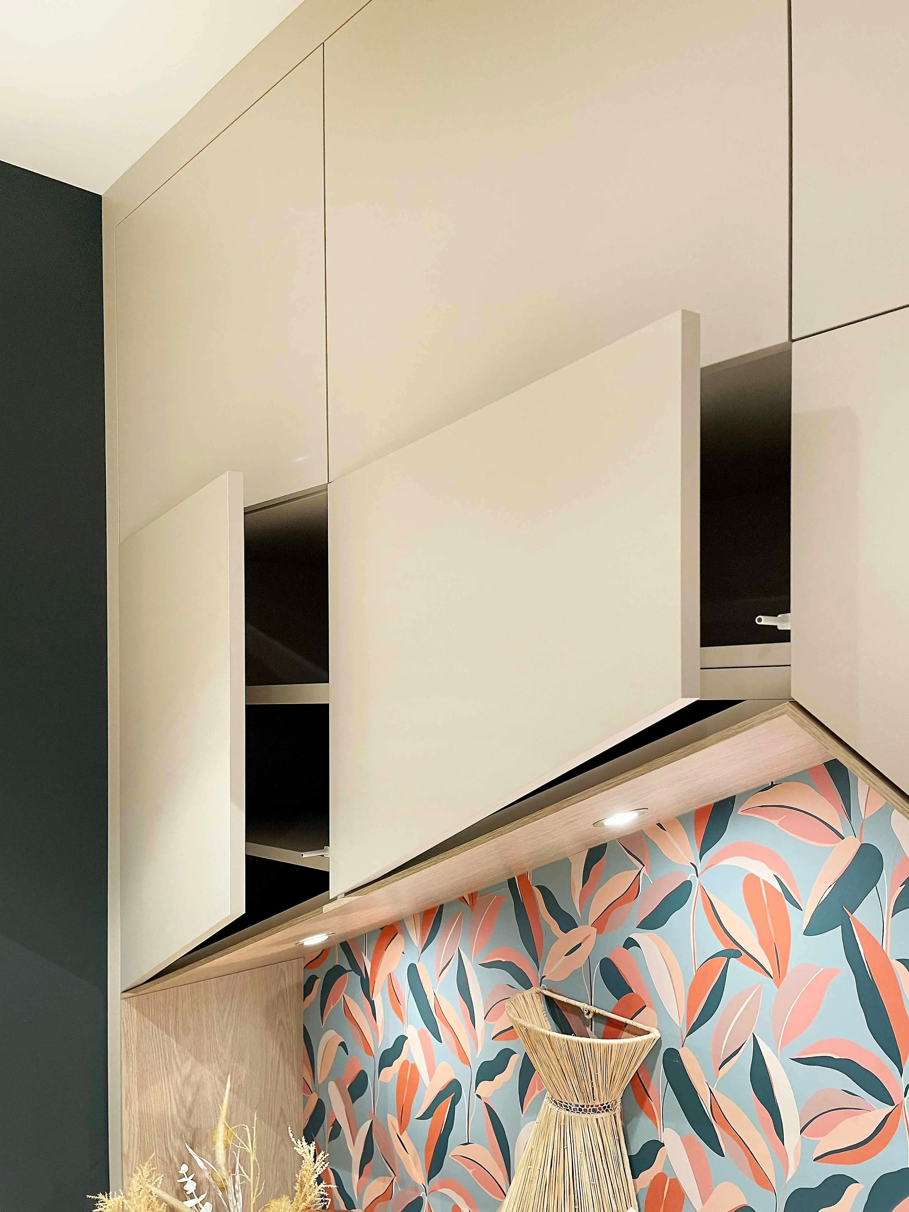 Le mobilier a été conçu de manière à intégrer des rangements fermés et ouverts sous la pente, permettant un accès facile à l’espace tout en offrant une belle finition. La couleur beige des façades et l’angle étudié du mobilier apportent à la fois une fonctionnalité et un design harmonieux avec le mur de couleur bleu foncé. Les détails de conception tels que l’éclairage intégré et la décoration murale ajoutent à l’atmosphère chaleureuse et accueillante de cet espace réduit.