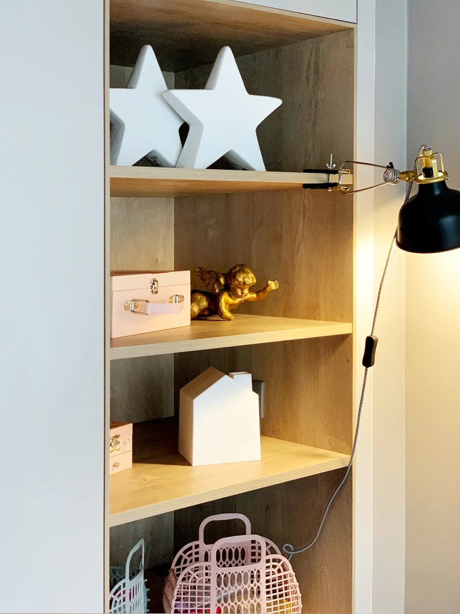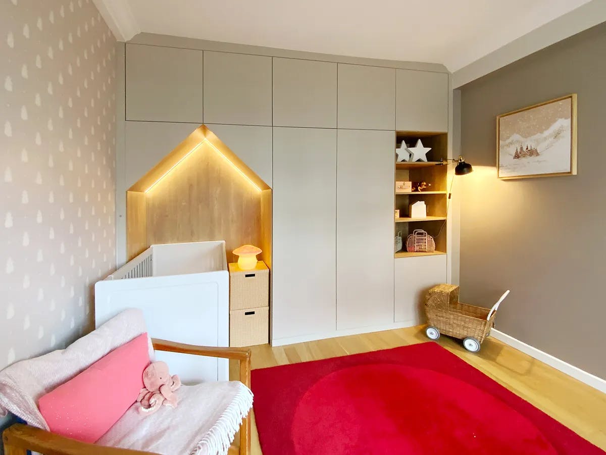 Le meuble a été conçu avec des matériaux de qualité, alliant un ton clair de gris et des accents en bois naturel pour le coin enfant. Ce choix de finition assure une sensation de douceur et de chaleur, idéale pour une chambre d’enfant. L’éclairage intégré dans l’alcôve crée une atmosphère intime et agréable, tandis que les étagères de rangement apportent une solution pratique et esthétique pour les jouets et accessoires.