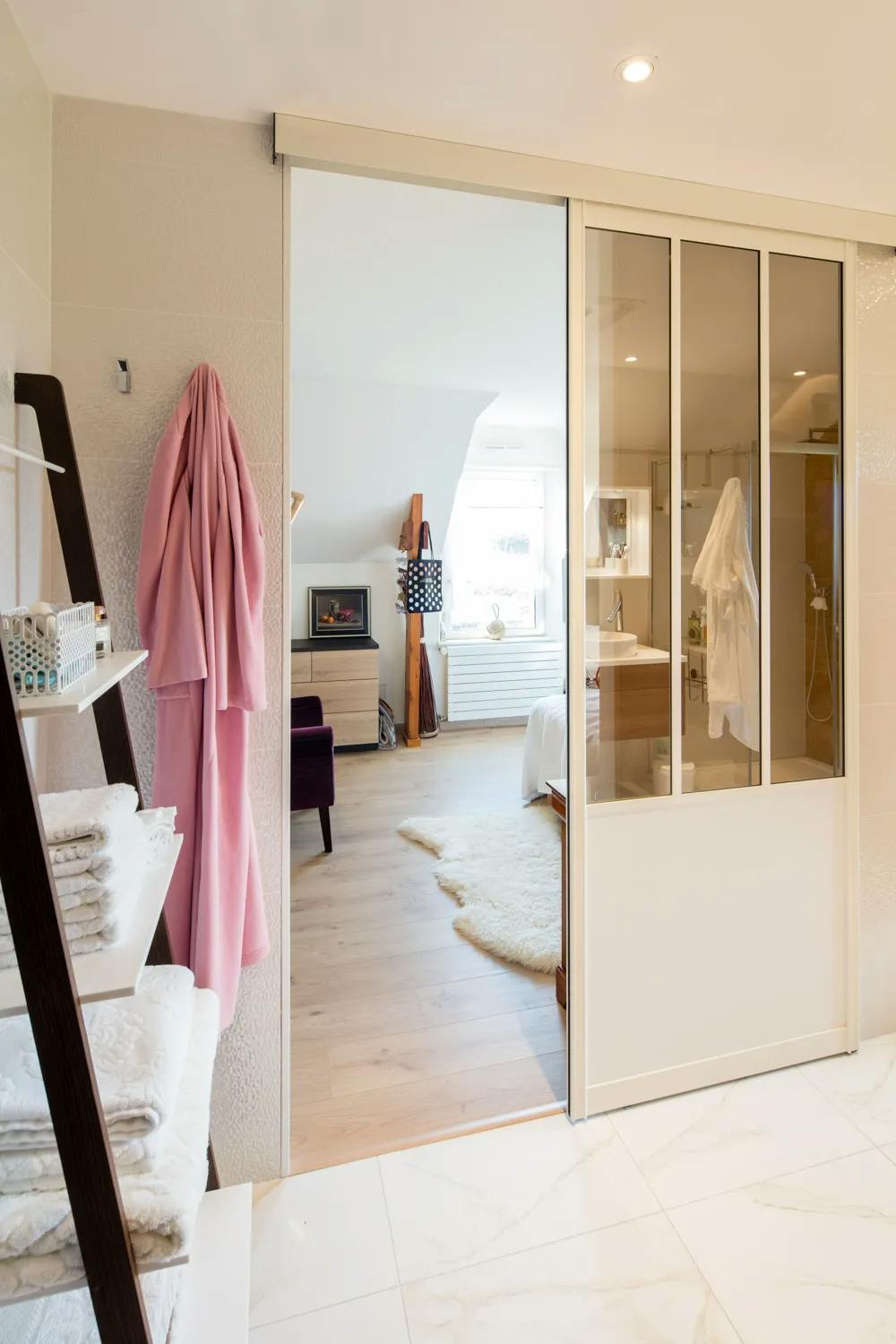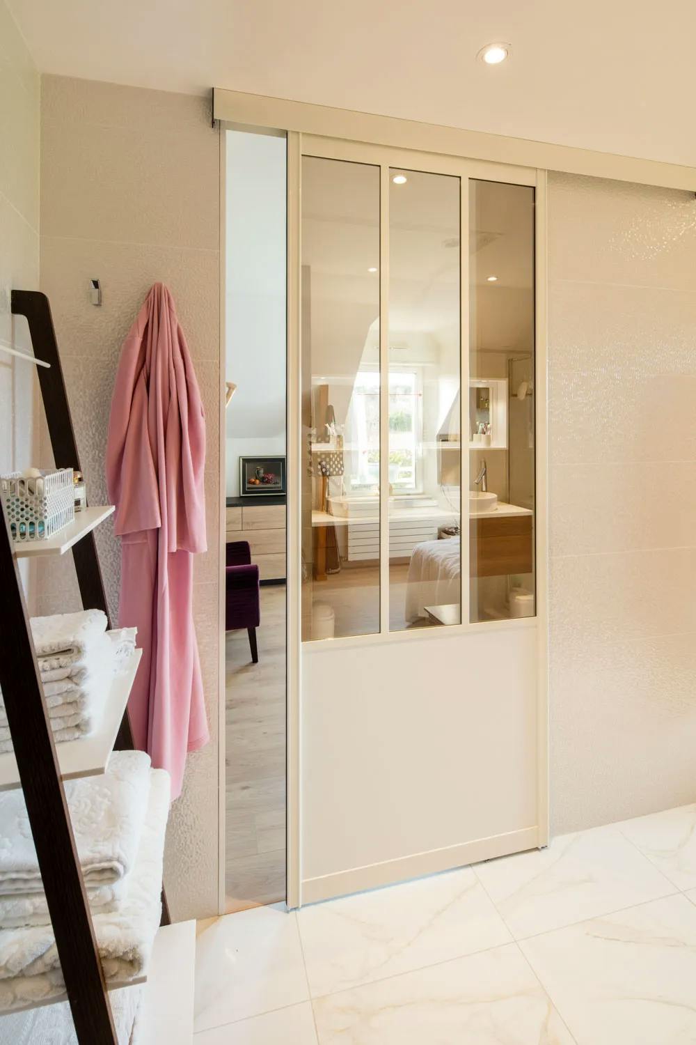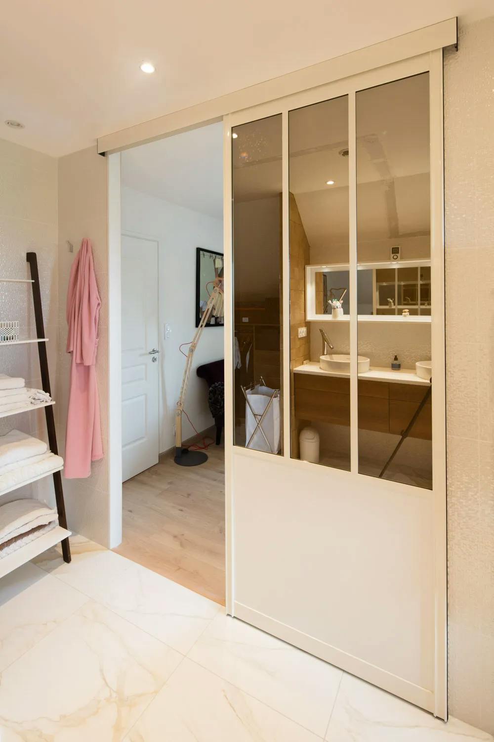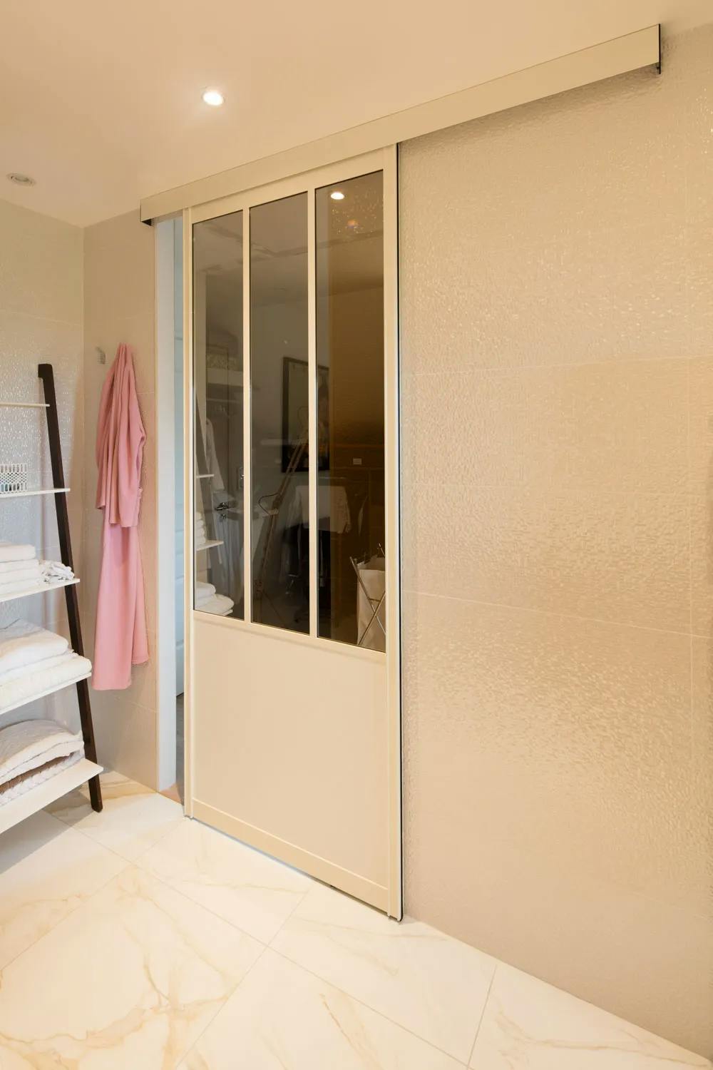 La cloison intègre une porte coulissante parfaitement intégrée, idéale pour optimiser l’espace et faciliter la circulation. Le vitrage apporte de la légèreté et accentue la profondeur de la pièce, tandis que le soubassement plein permet de préserver une part d’intimité côté salle de bain. Cette solution de rangement personnalisé permet non seulement de structurer l’espace, mais aussi de valoriser l’ambiance douce et contemporaine de l’ensemble.