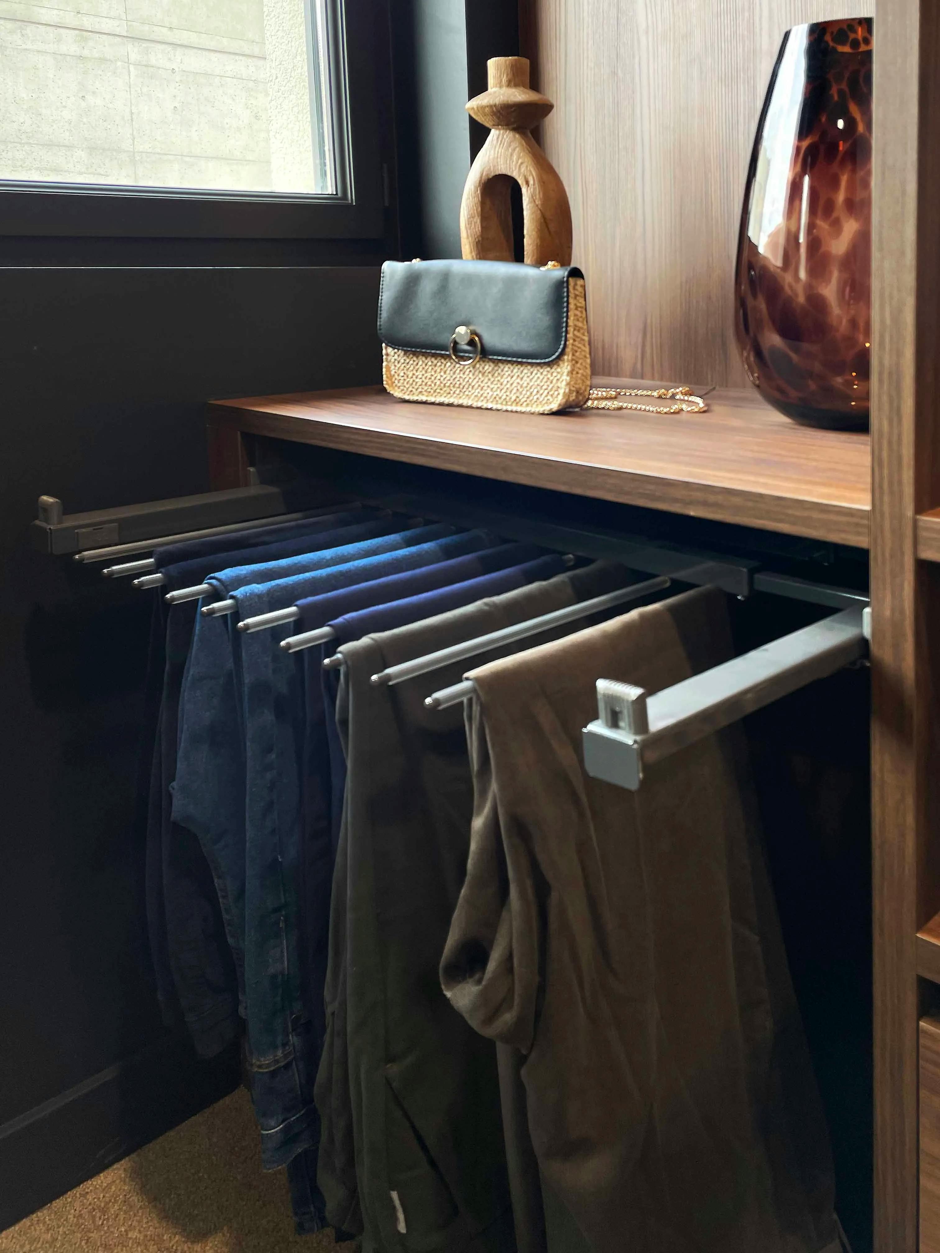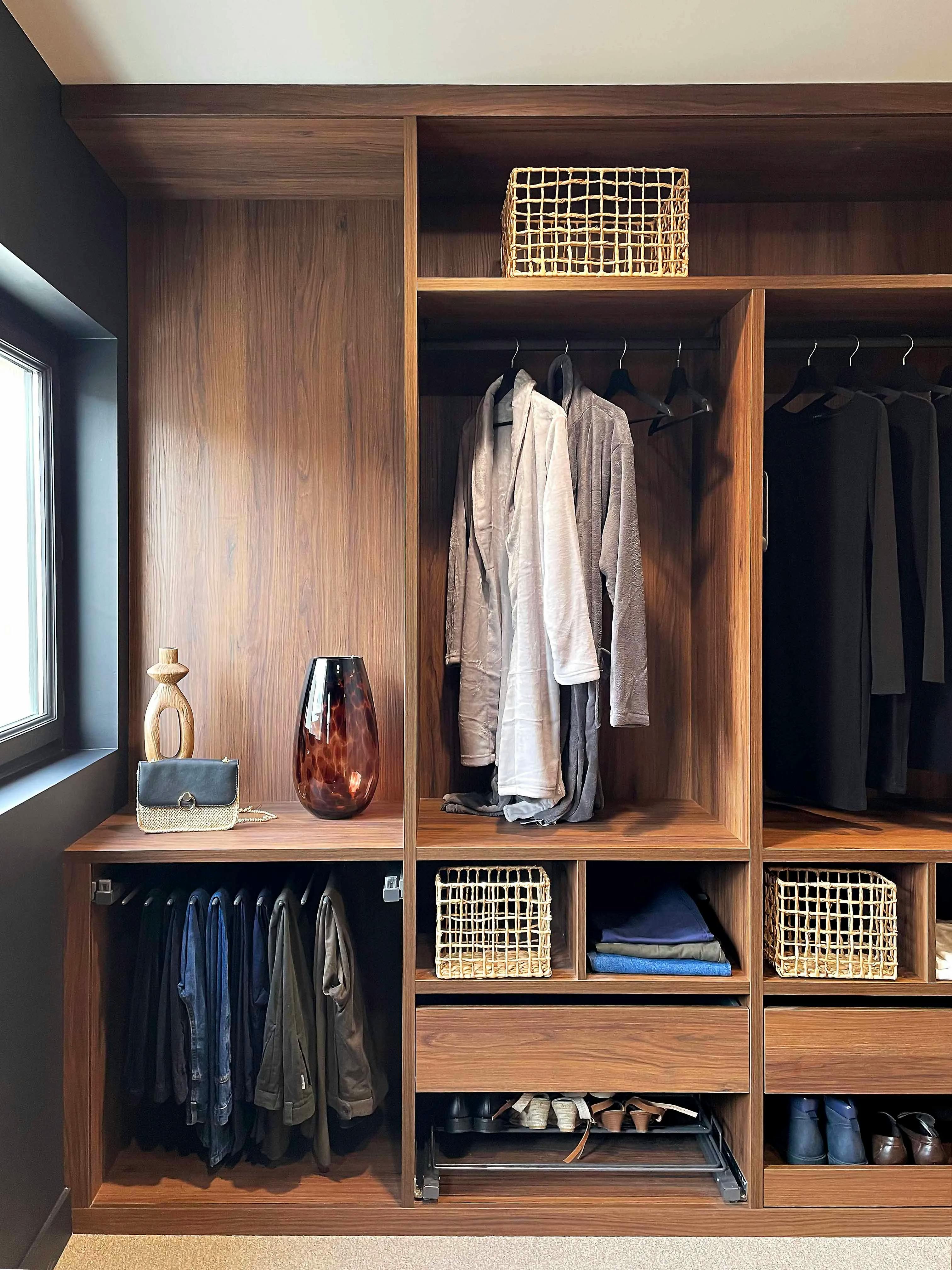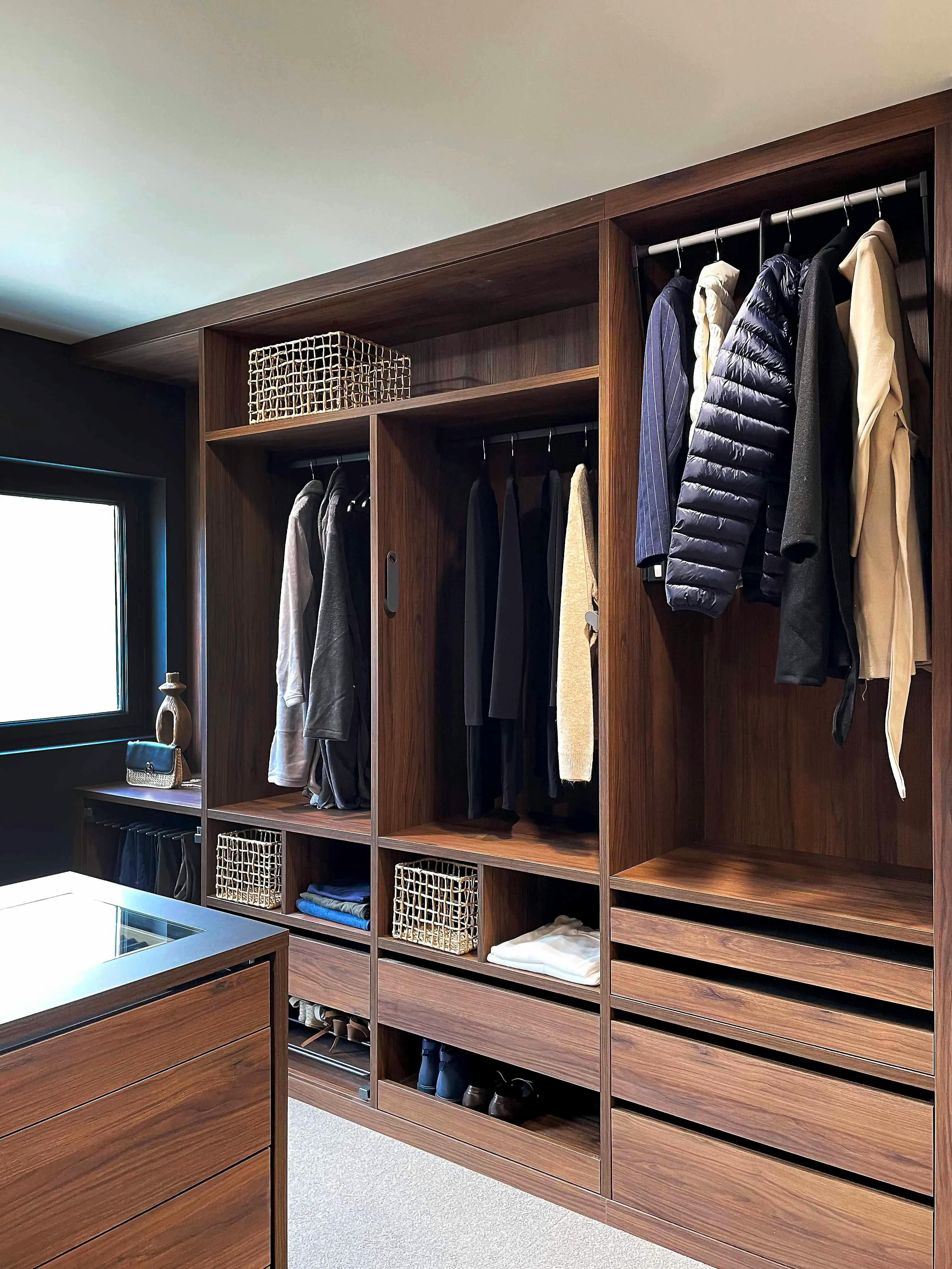 Un dressing a été conçu sur-mesure pour s’intégrer parfaitement sous la pente, en utilisant des étagères ouvertes et des penderies adaptées à la hauteur limitée. Un meuble bas avec des tiroirs et des niches pour accessoires complète l’aménagement, permettant un accès facile et une organisation optimale. Le choix du bois sombre apporte une touche chaleureuse et sophistiquée à l’espace, tandis que les lignes épurées et l’utilisation de portes et de tiroirs sur mesure assurent un design moderne et fonctionnel.