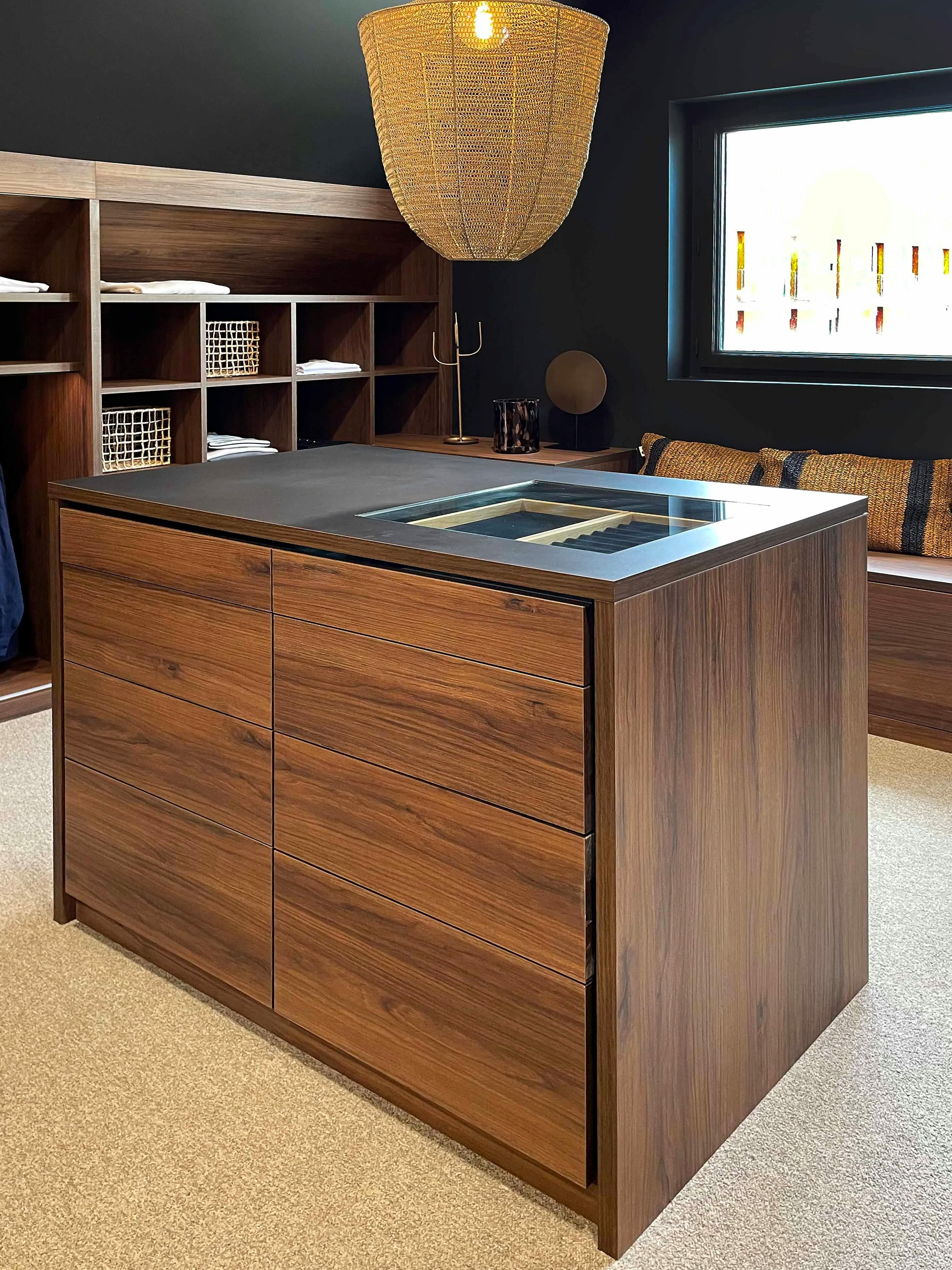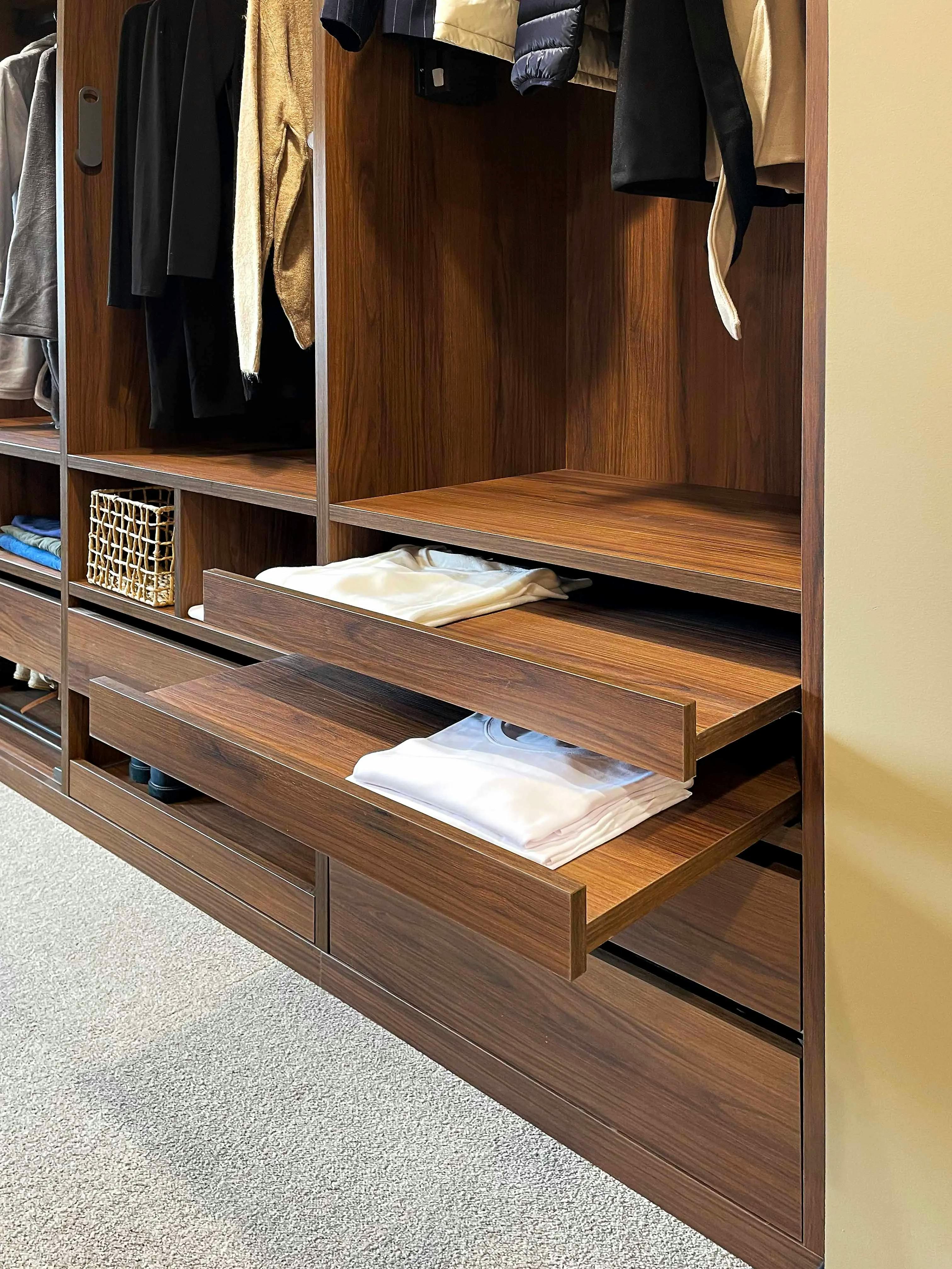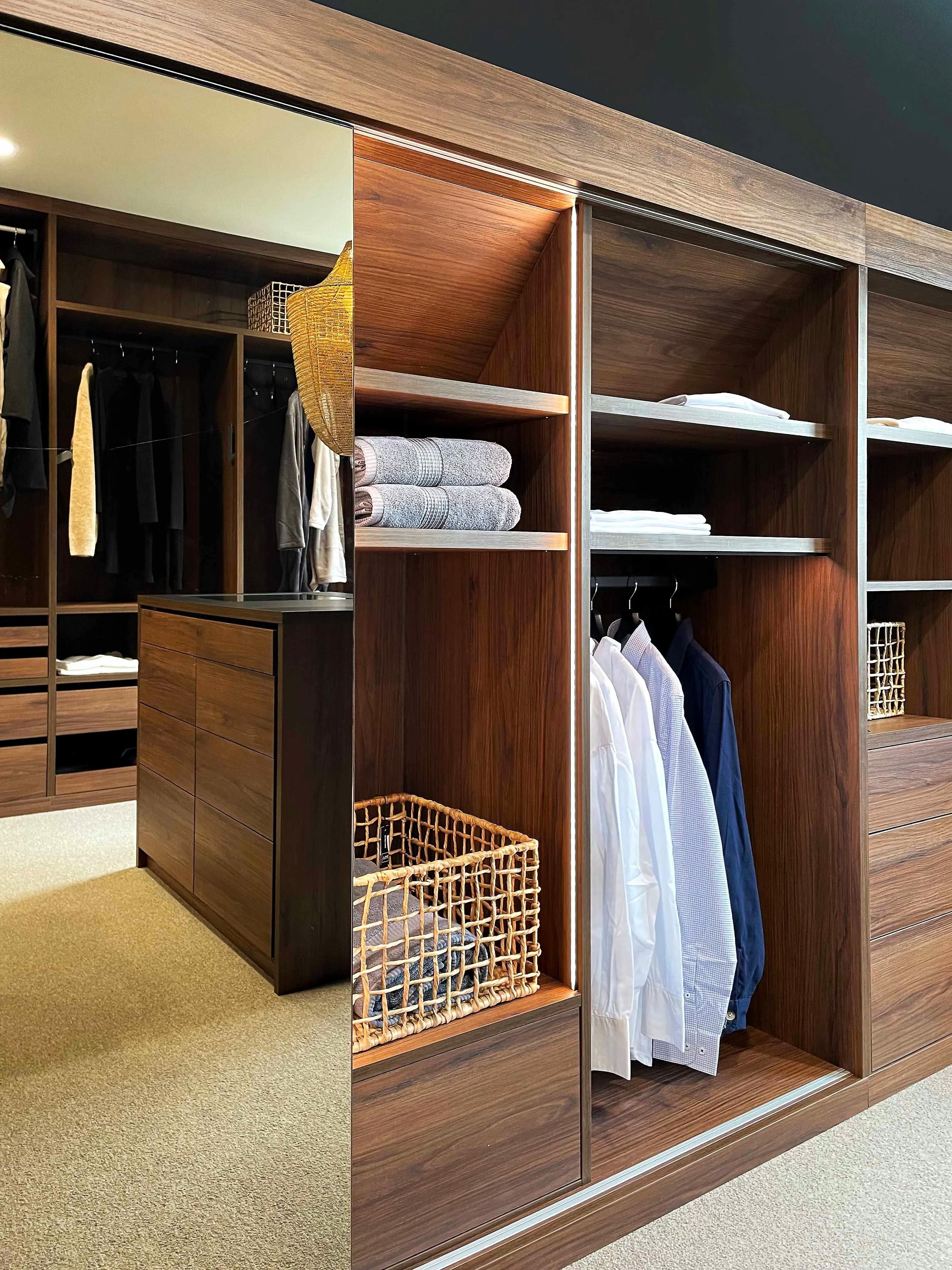 Un dressing a été conçu sur-mesure pour s’intégrer parfaitement sous la pente, en utilisant des étagères ouvertes et des penderies adaptées à la hauteur limitée. Un meuble bas avec des tiroirs et des niches pour accessoires complète l’aménagement, permettant un accès facile et une organisation optimale. Le choix du bois sombre apporte une touche chaleureuse et sophistiquée à l’espace, tandis que les lignes épurées et l’utilisation de portes et de tiroirs sur mesure assurent un design moderne et fonctionnel.