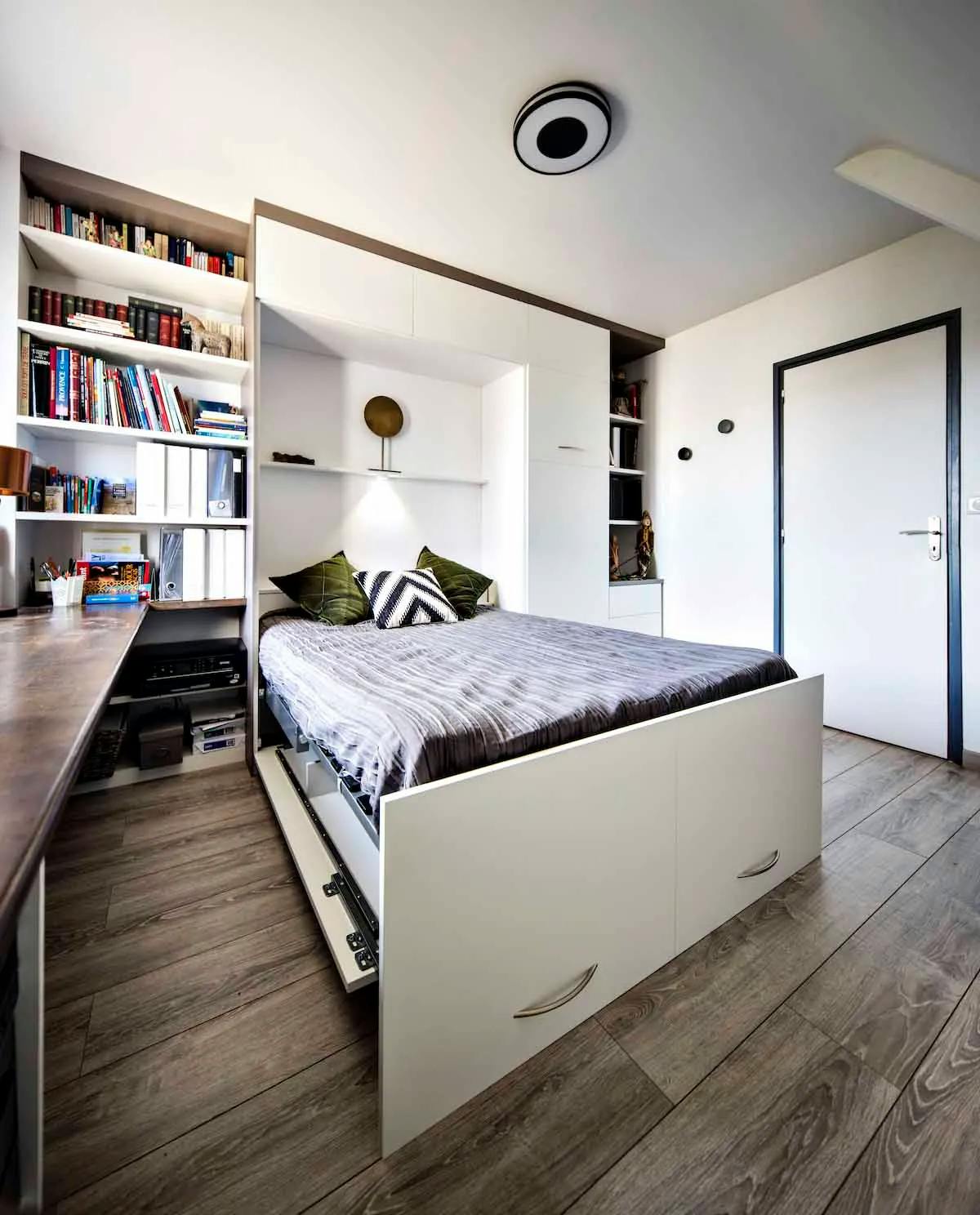 L’objectif était de trouver une solution de couchage qui libère de l’espace dans la journée sans compromettre la qualité du sommeil. Le sur-mesure était indispensable pour adapter le lit escamotable à la configuration de la pièce et intégrer un espace de rangement intelligent. La solution proposée ? Un lit rabattable intégré dans une structure avec étagères, se repliant facilement et laissant l’espace dégagé pour les activités quotidiennes.