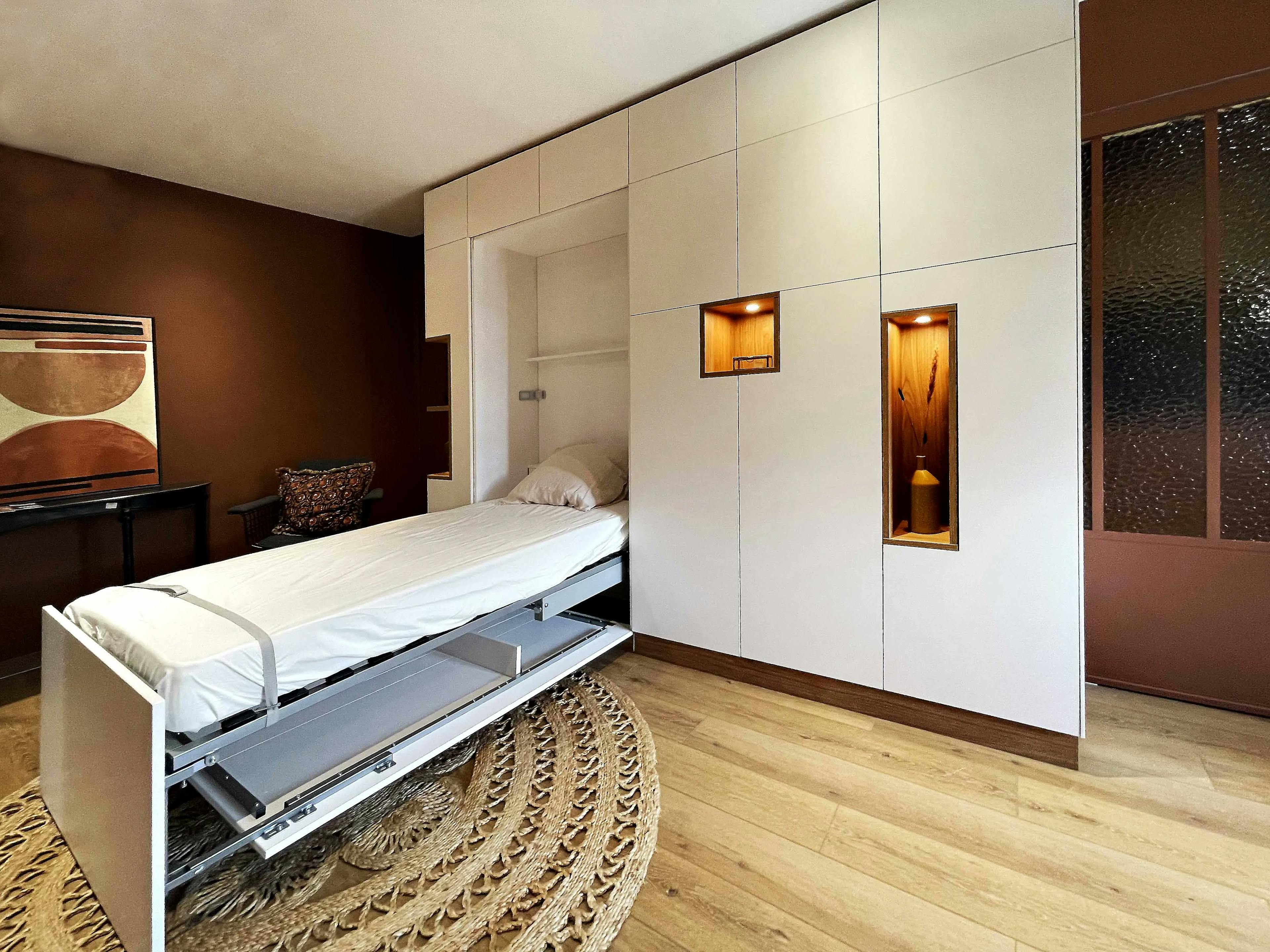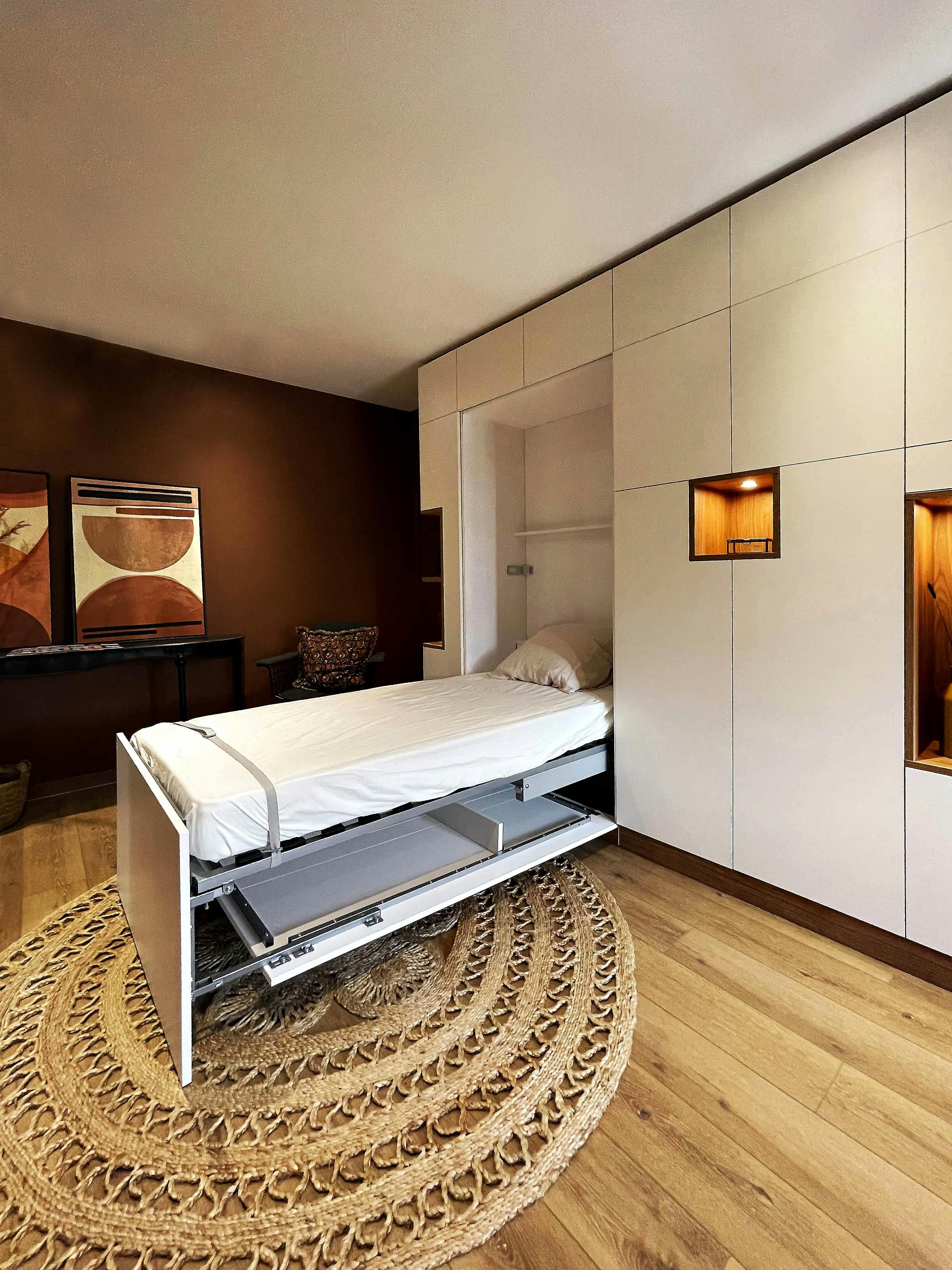 L’espace devait être structuré pour offrir un équilibre entre rangement et fonctionnalité sans alourdir l’ambiance. Il fallait intégrer un lit rabattable facile d’accès, tout en conservant un design épuré et raffiné. Le sur-mesure a permis d’ajuster chaque module, en intégrant des niches rétroéclairées pour apporter du relief et masquer intelligemment le lit lorsqu’il est fermé.